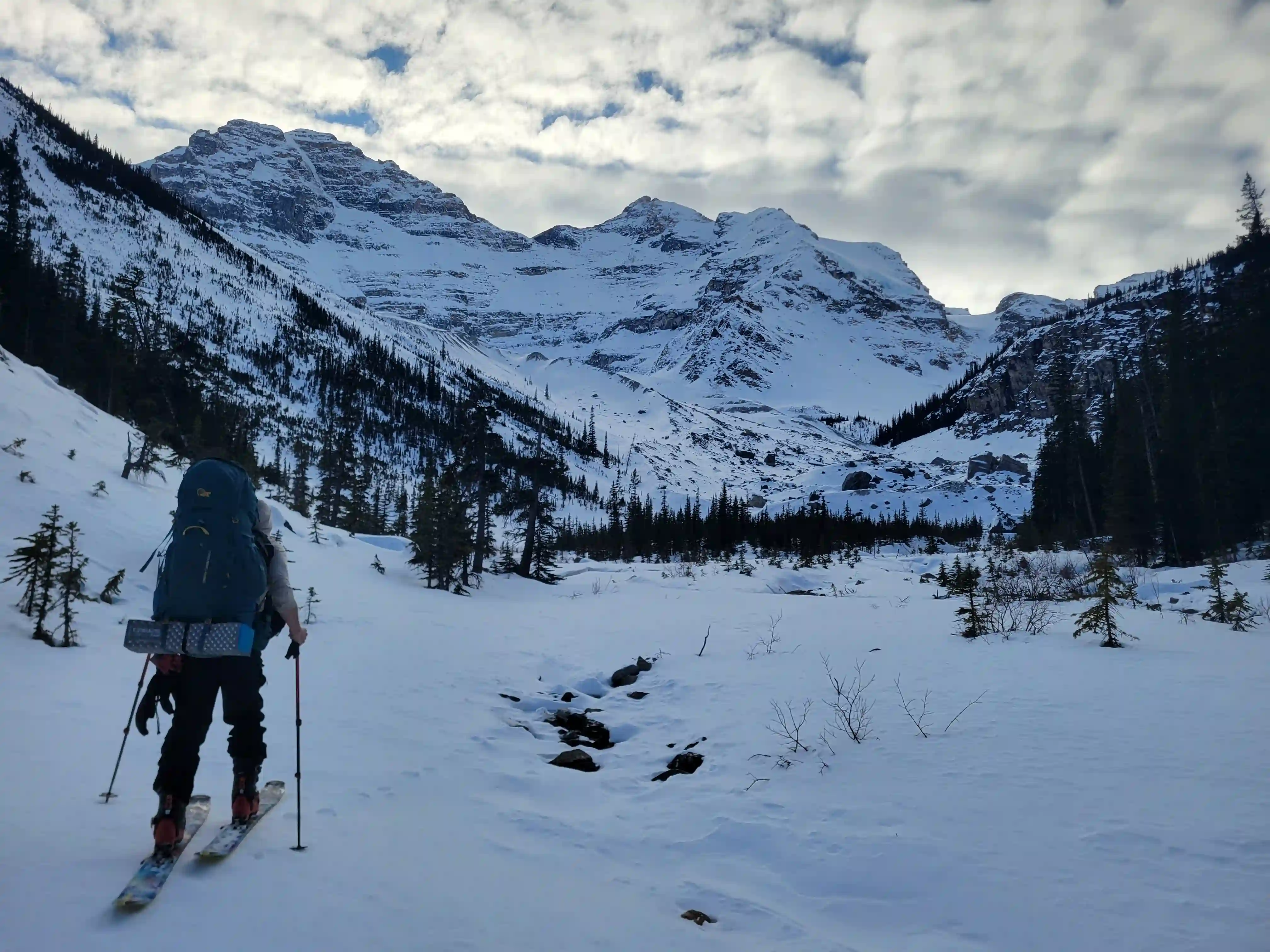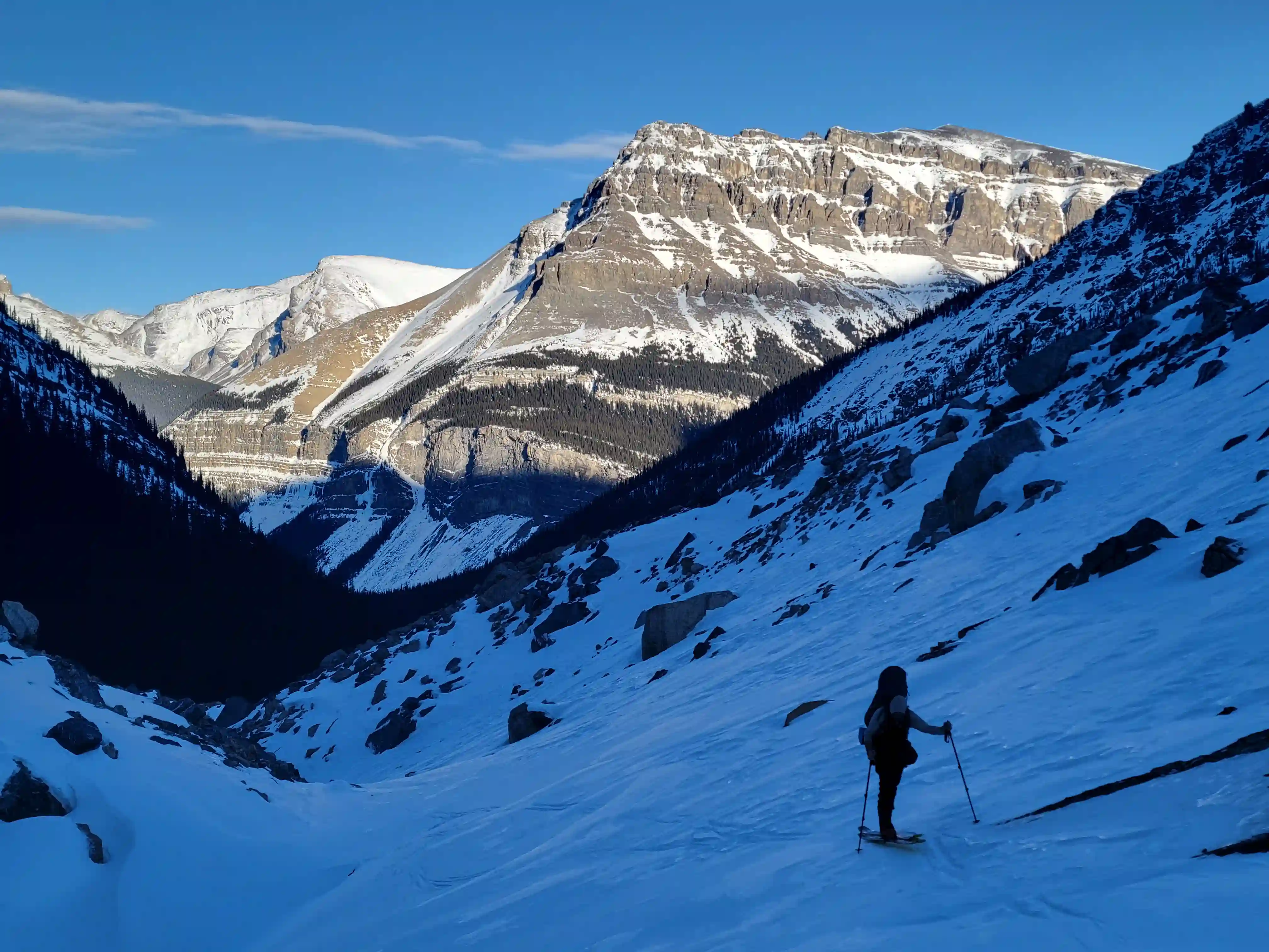 Following the Sunwapta River is one of the steeper sections of the approach and there was less snow in this area so the skin track meandered quite a bit. After the initial climbing section things flatten out for a while until another steep section with a boulder field but most of the annoying terrain was snow covered so this made for easy travel. After gaining the last steeper portion after this we just had the upper valley to get through where the views open up to Woolley and Diadem and not long later we had found a good wind sheltered camp spot next to the frozen tarn immediately below our objectives for the trip by 5:30pm.