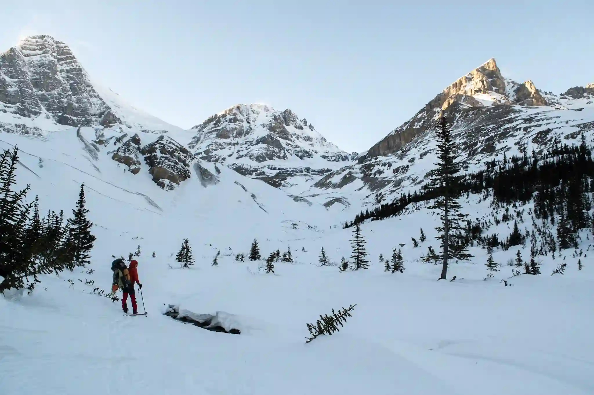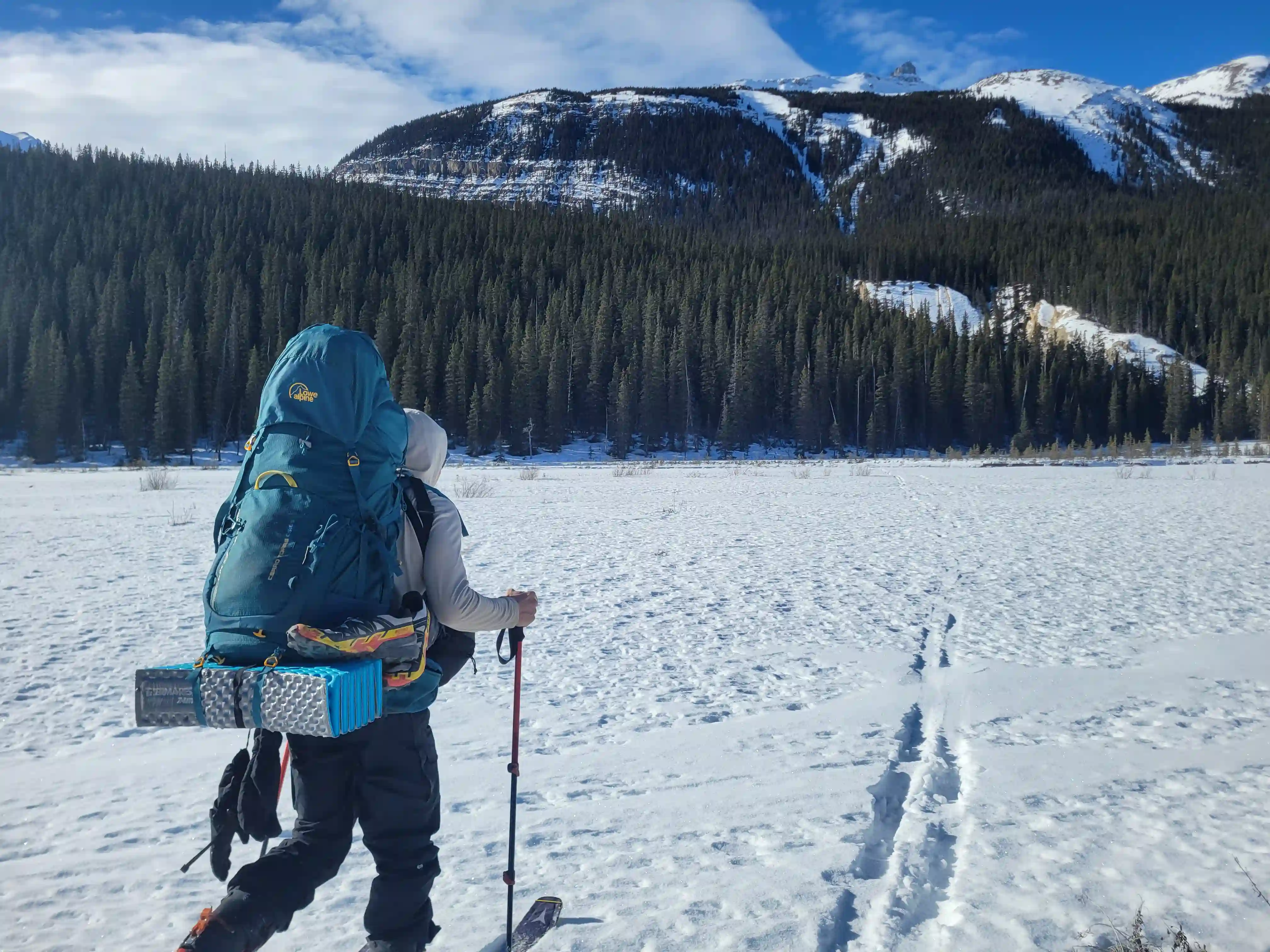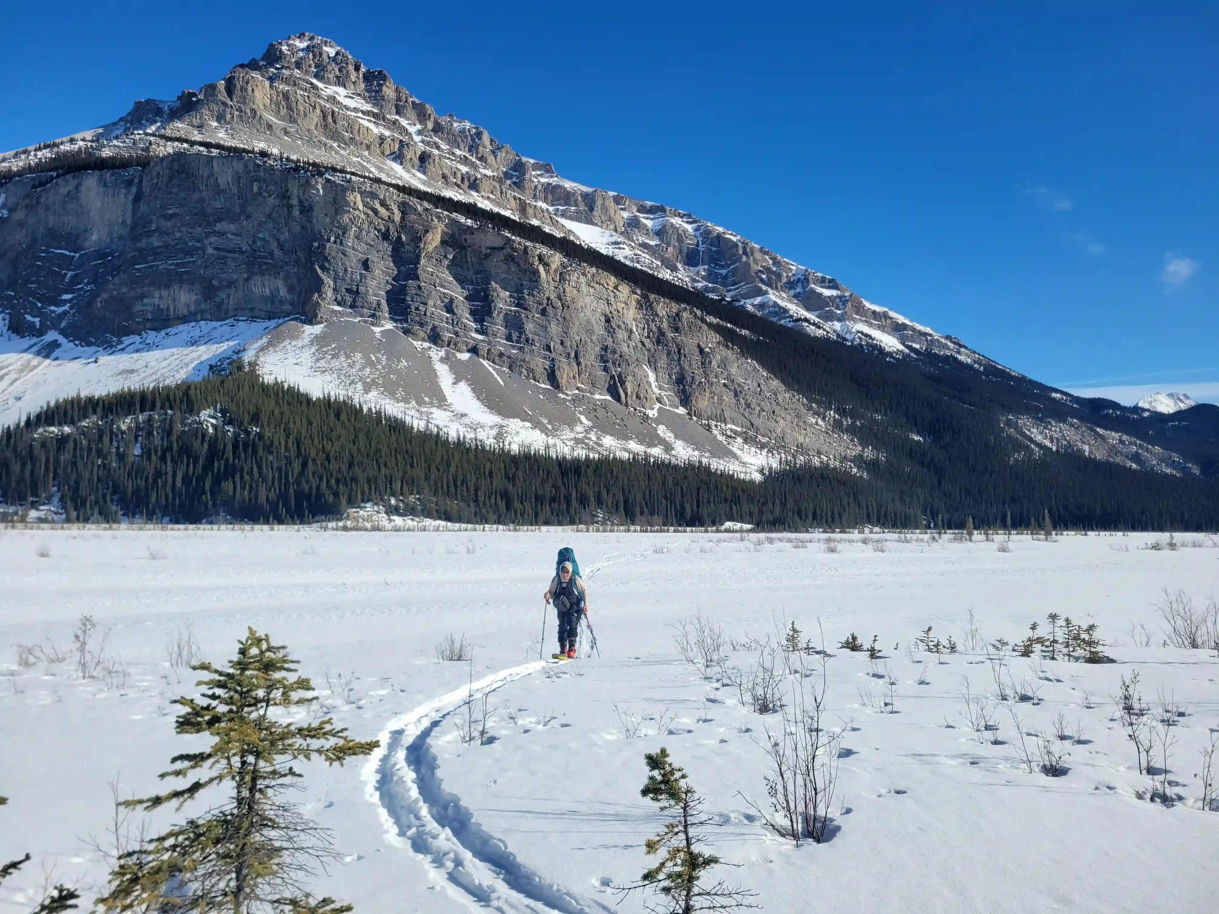 Conditions were mint for our drive in so in hindsight this would've been the day to ascend the peaks but the forecast still had good conditions for the following day so we had our fingers crossed it would be more of the same. As we neared the start point along the highway we tried scoping out the mostly snow-covered Sunwapta River to see if we'd need to do any frigid winter crossings but we couldn't tell from afar so water crossing shoes were on our packs when we started. After getting all the gear ready and donning the skins we started across at 2pm and to our surprise the Sunwapta River was completely bridged with a set of tracks already set so we knew this would make our lives easier for the approach and ditched the water crossing shoes on a tree before continuing up the valley.