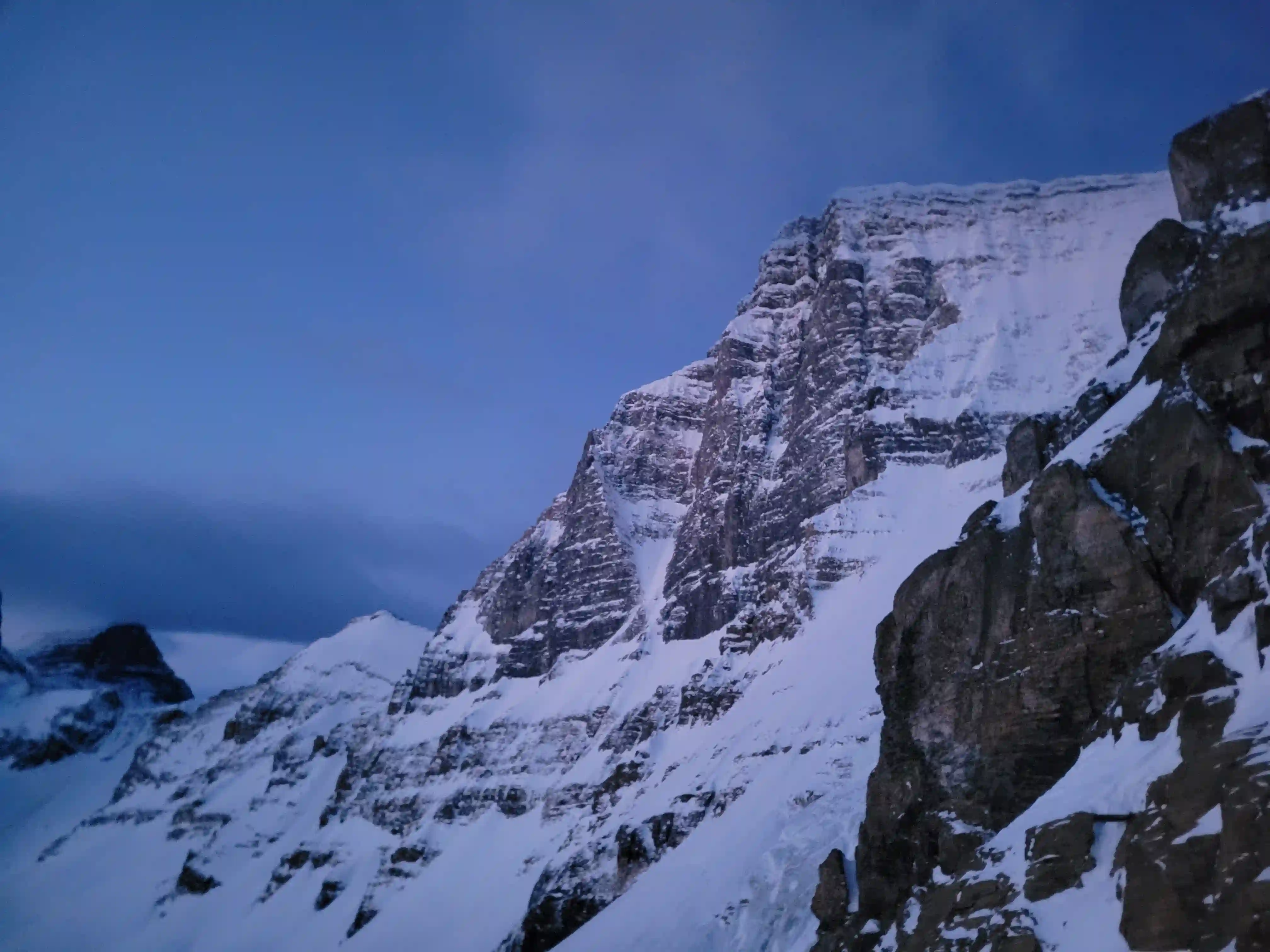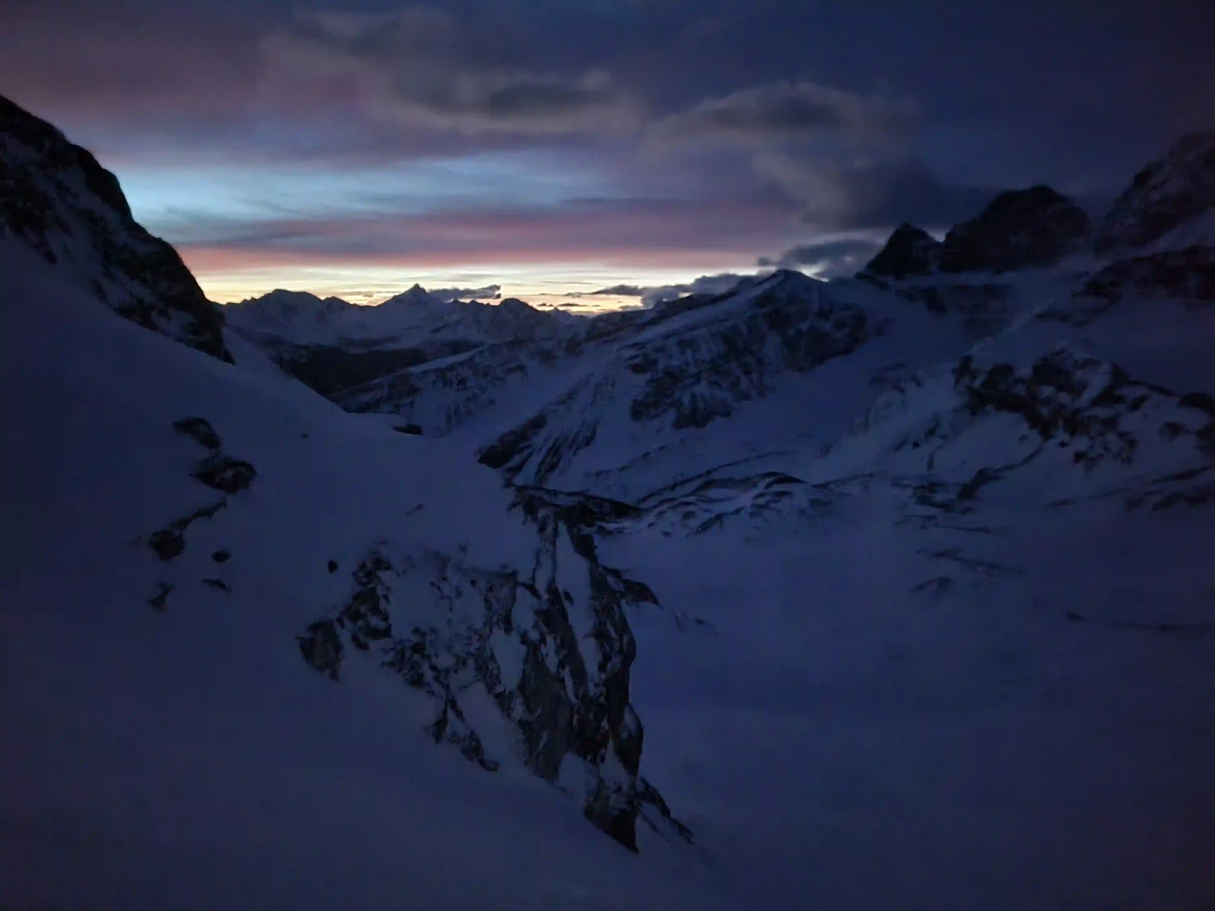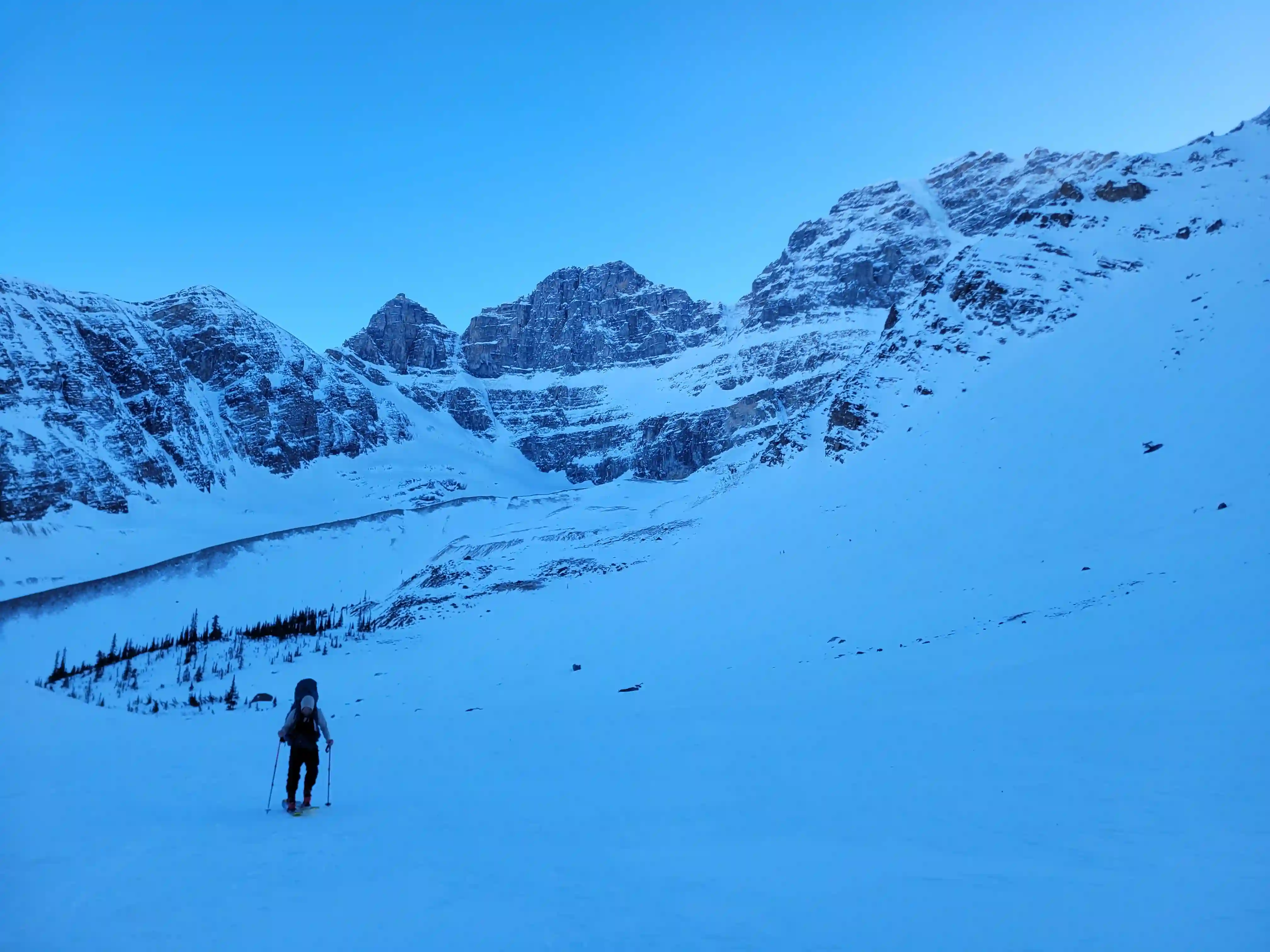 The spot we ended up picking to camp was pretty well wind sheltered which made things a lot easier. Additionally we were able to dig into the snow on the tarn for easy water access in the evenings so we didn't have to worry about melting a bunch of snow which was nice. With the short winter days we decided that around 5am was an early enough start time and after getting to bed early around 9pm we were well rested in the morning and started making our way towards Diadem's SE face direct couloir in the dark.