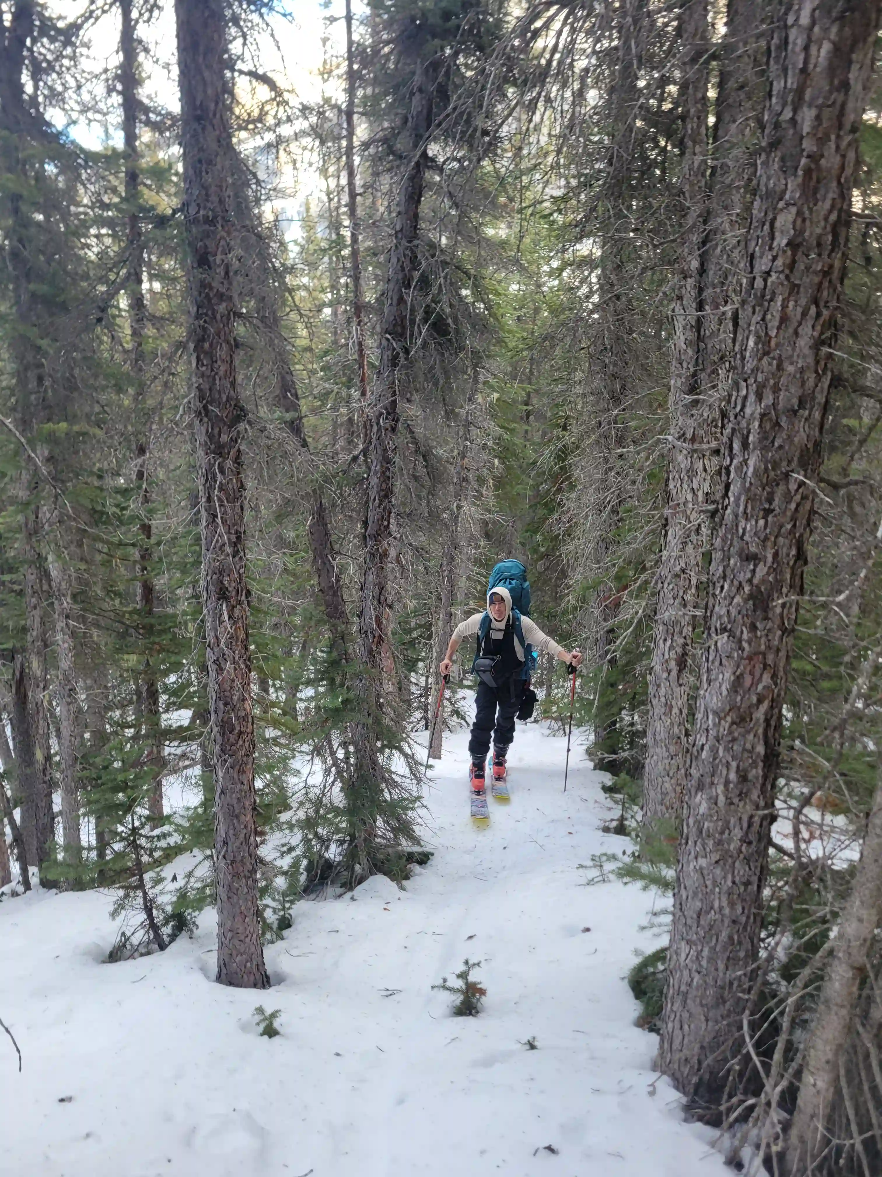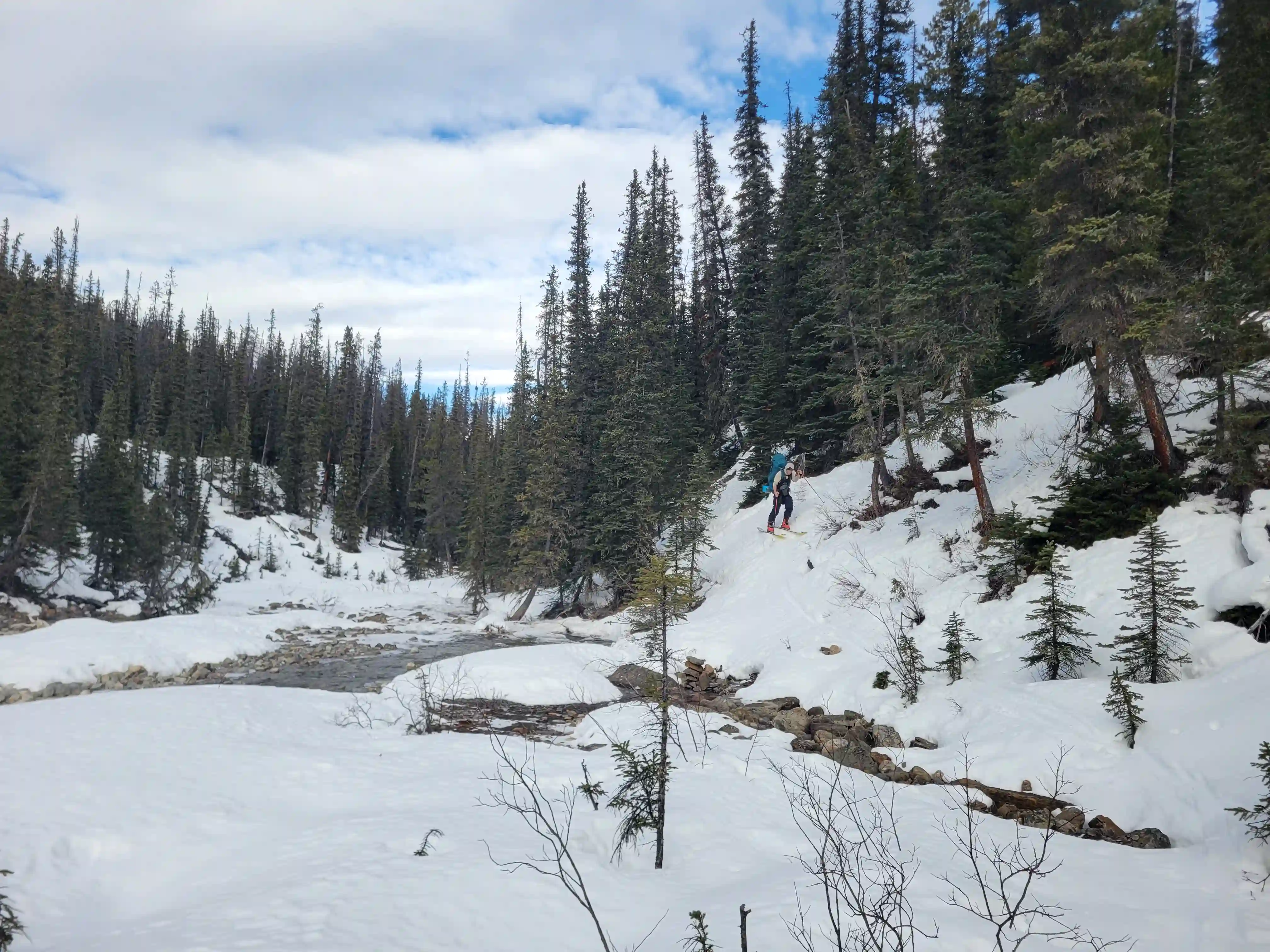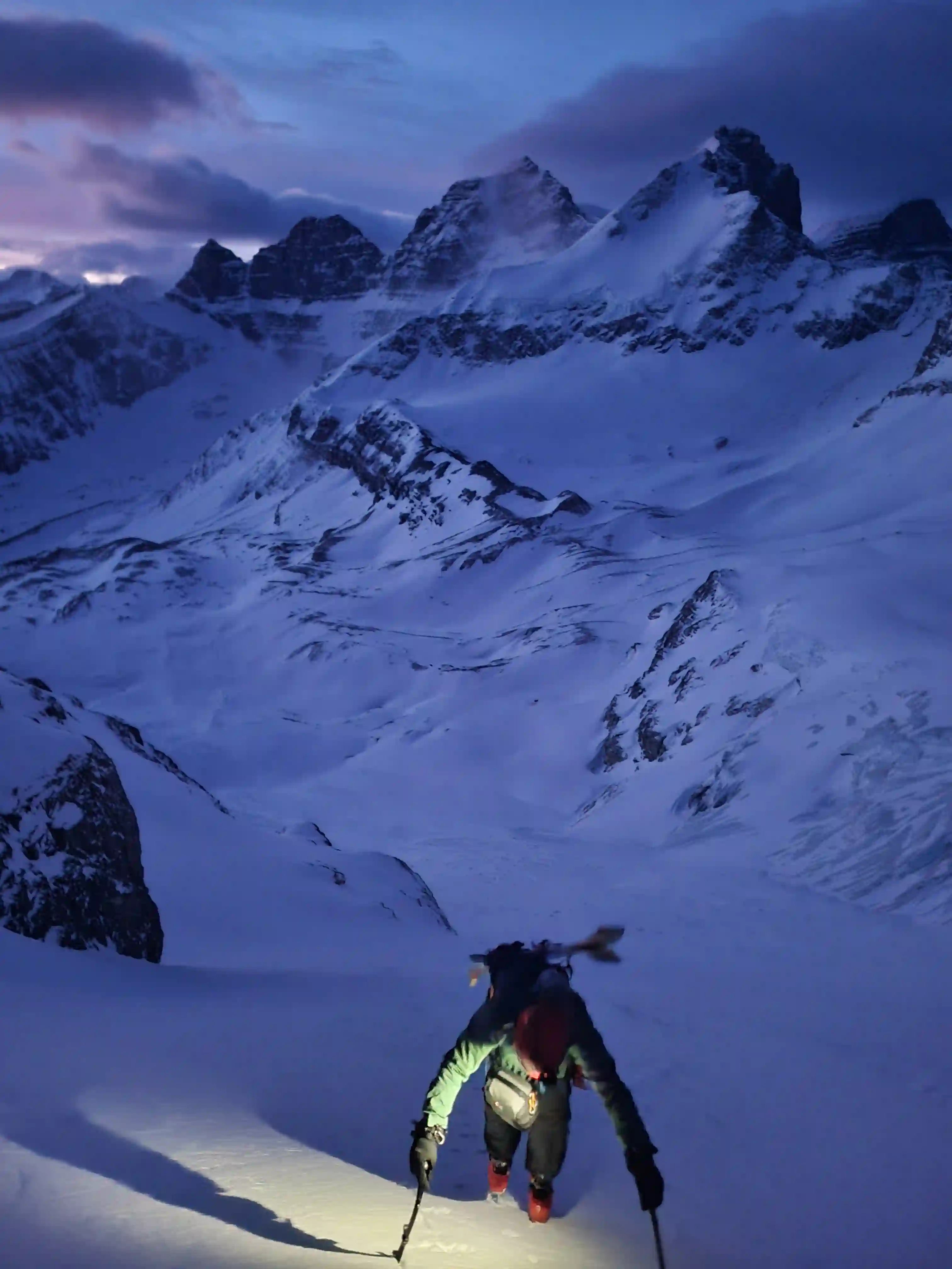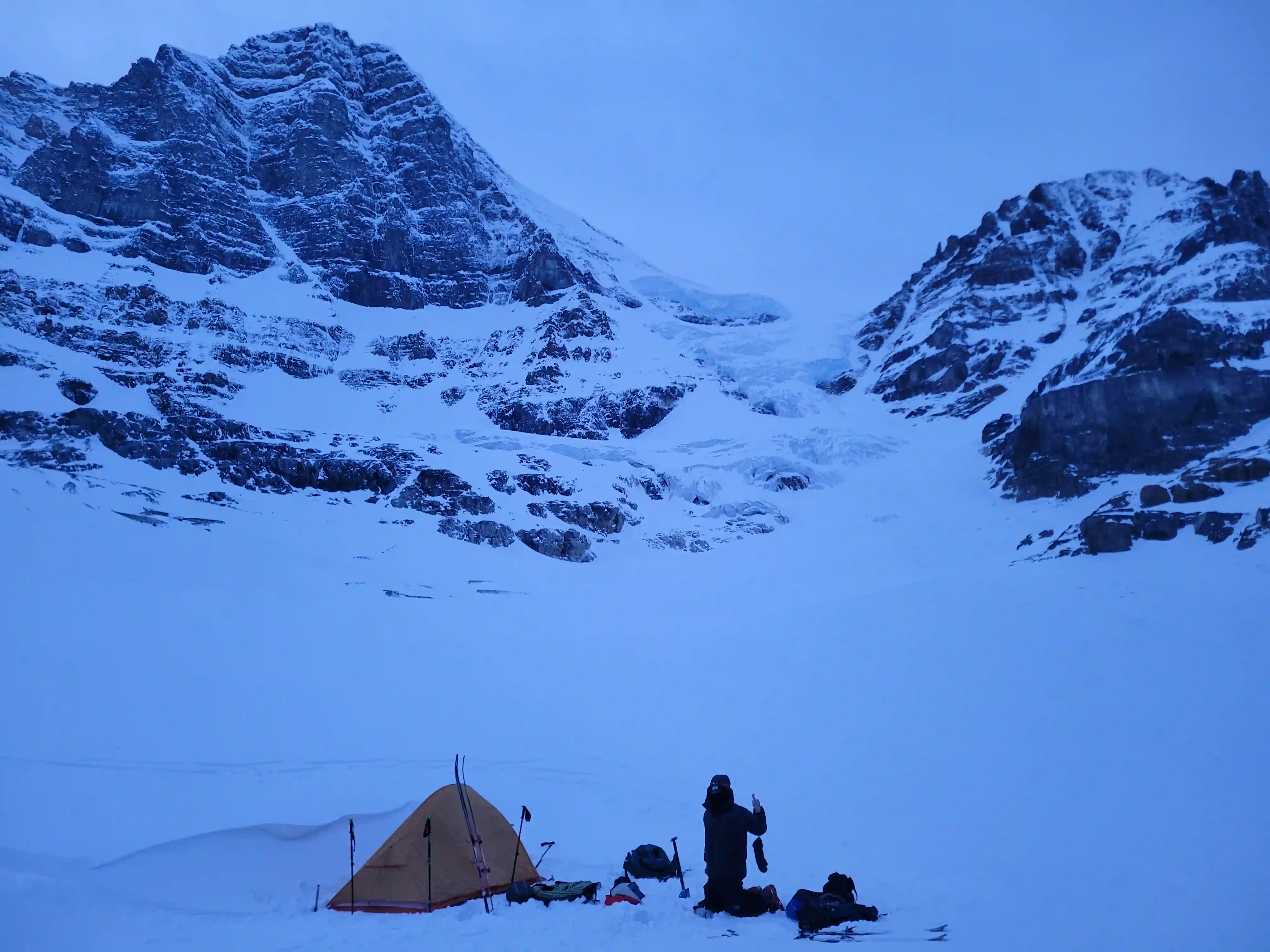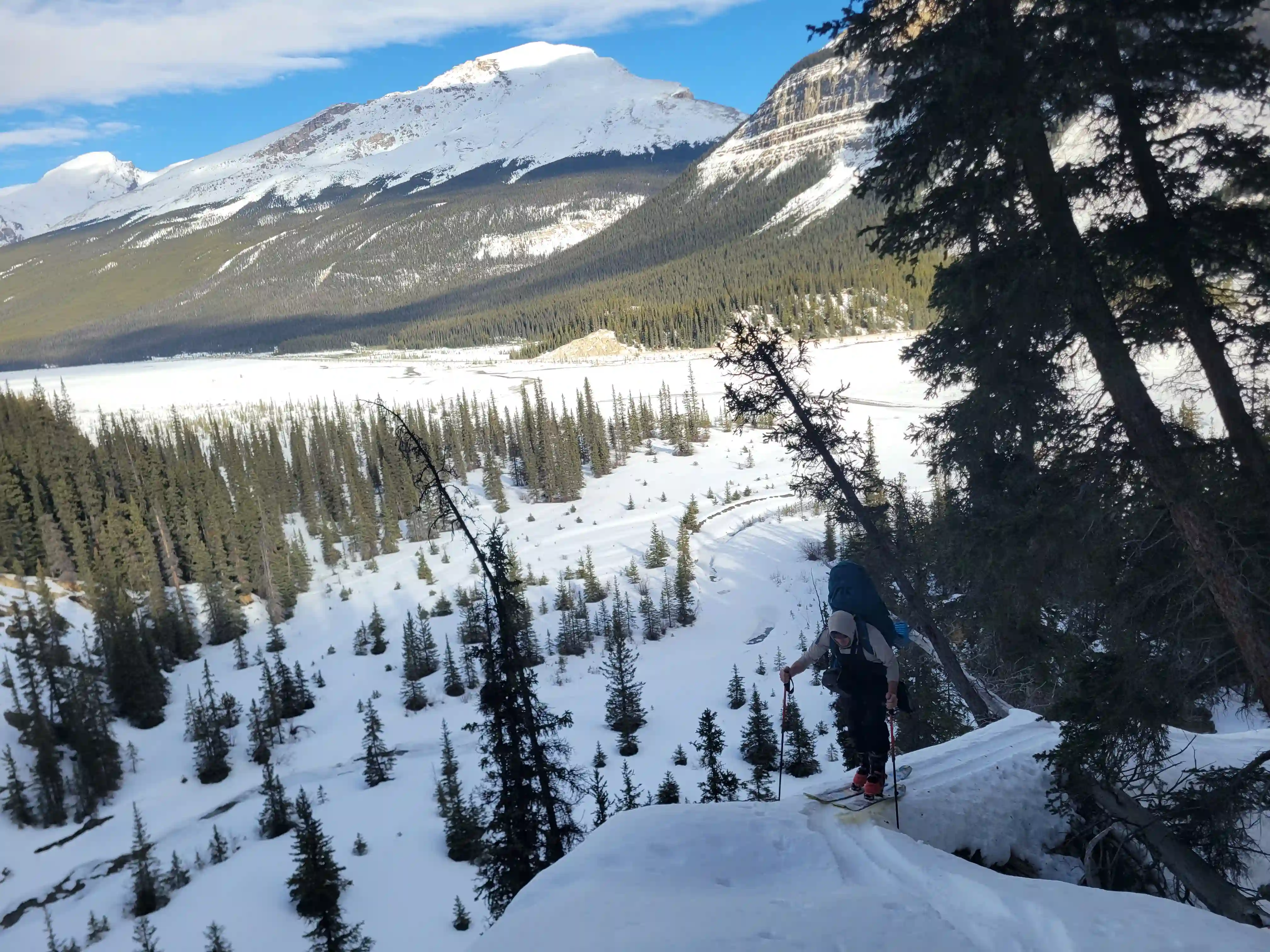 Unfortunately the couloir got a sizable amount of wind which caused it to accumulate a bunch of small rocks so we downclimbed the upper half before conditions softened and I threw the skis on for the bottom portion. From this point the descent to camp was pretty chill although the snow conditions weren't great in places and once we got back we were focussed on packing up quickly before making our exit in the dark. The steeper sections of the exit were a bit tedious with a heavy pack given the mixed conditions but once things flattened out travel was fast and easy. All that was left was the final treed steep portion which was about as annoying as you'd expect to descend and took a decent amount of time but once we were back at the Sunwapta River it was just a few more minutes before we were back on the highway.