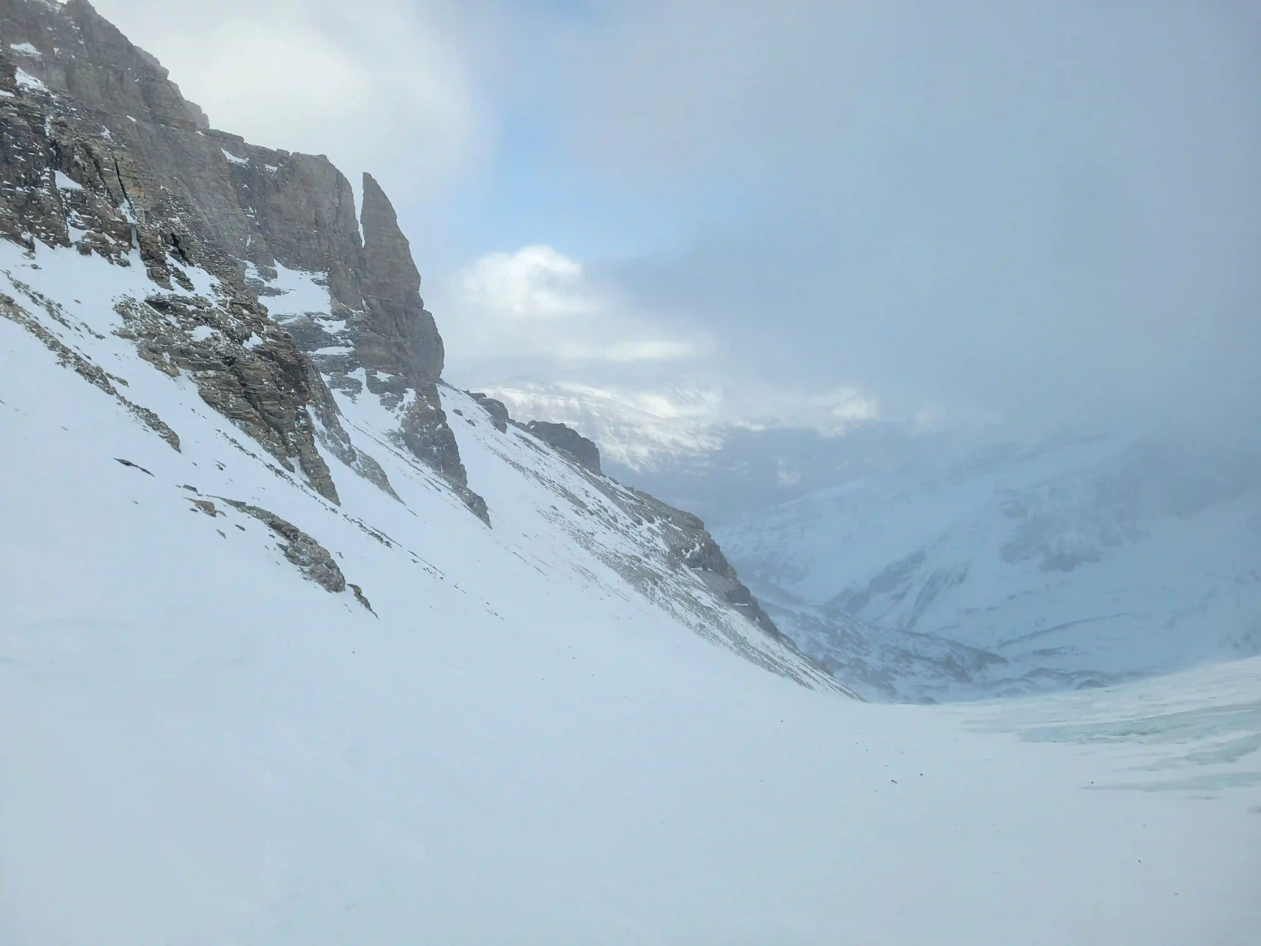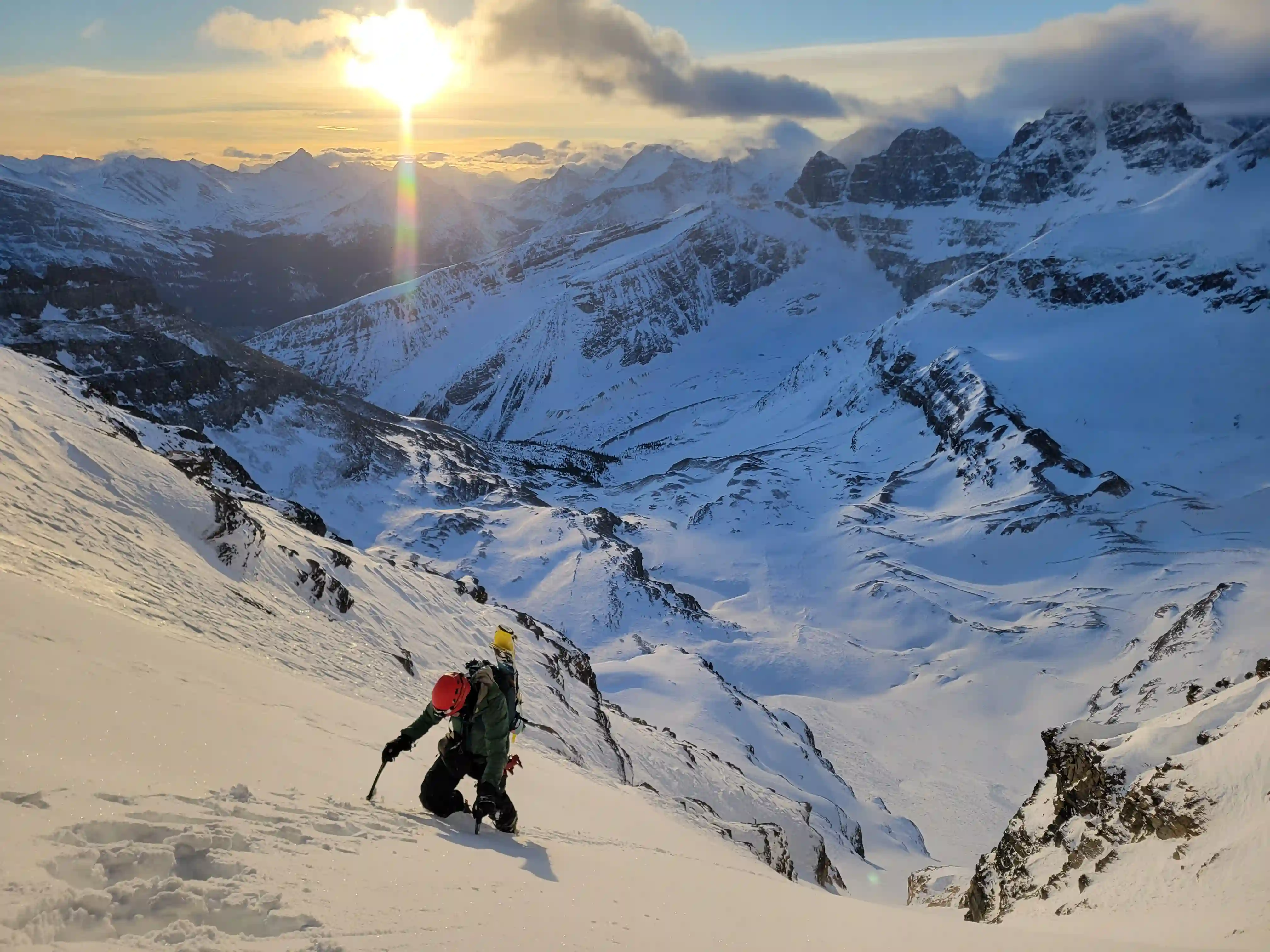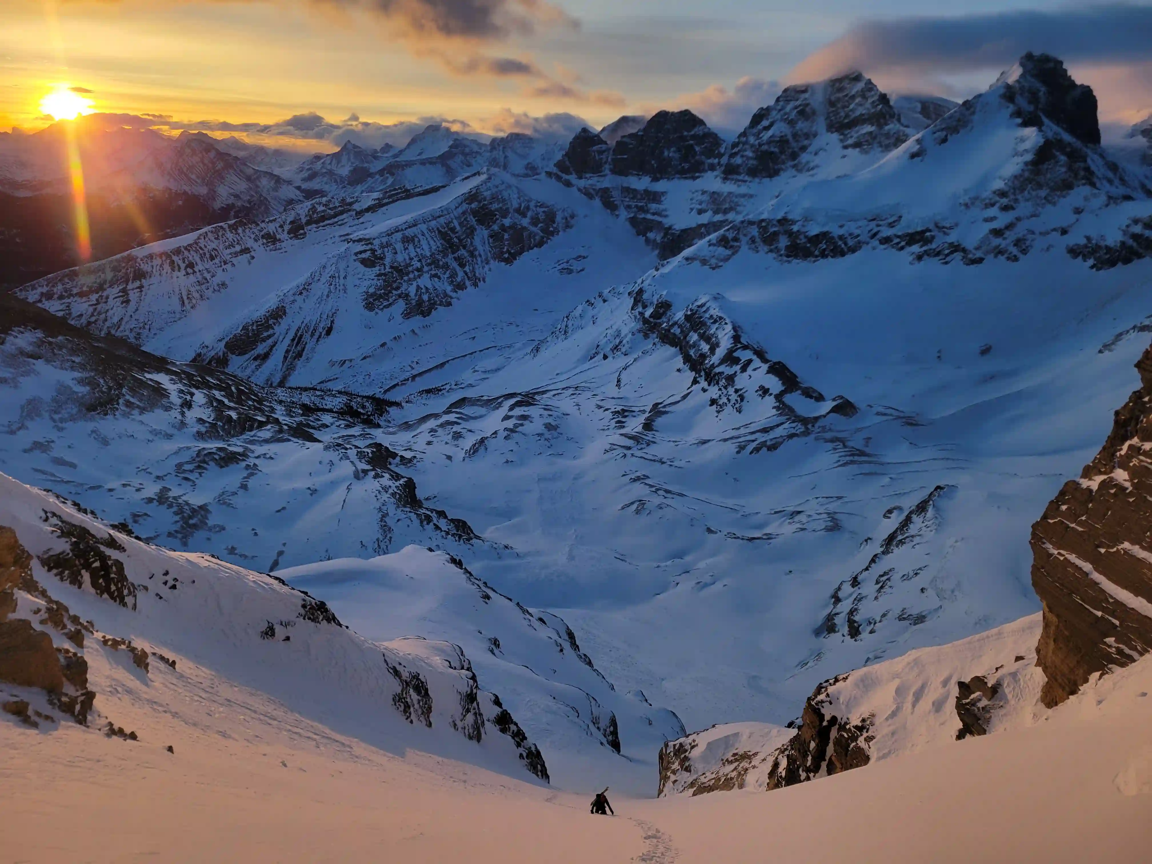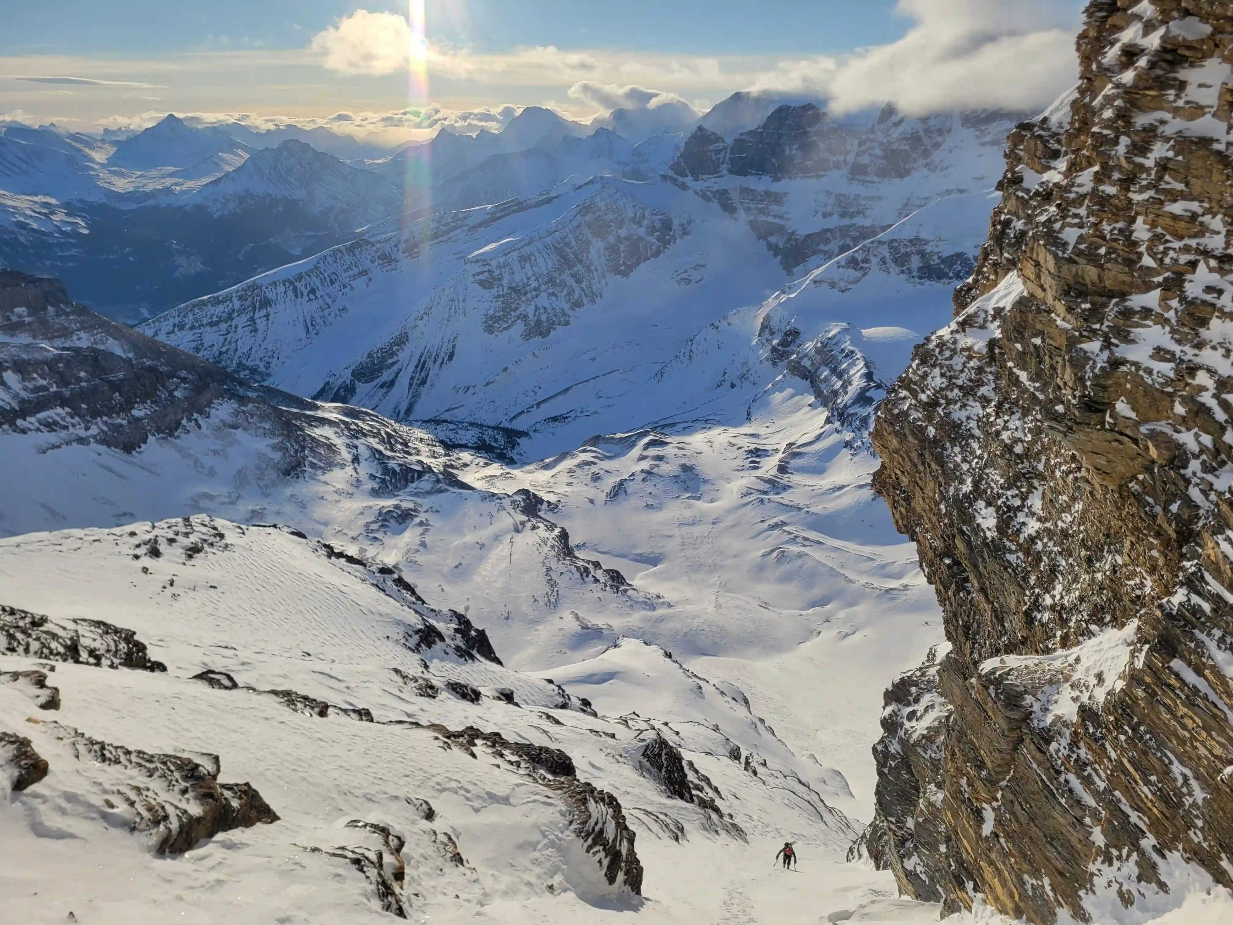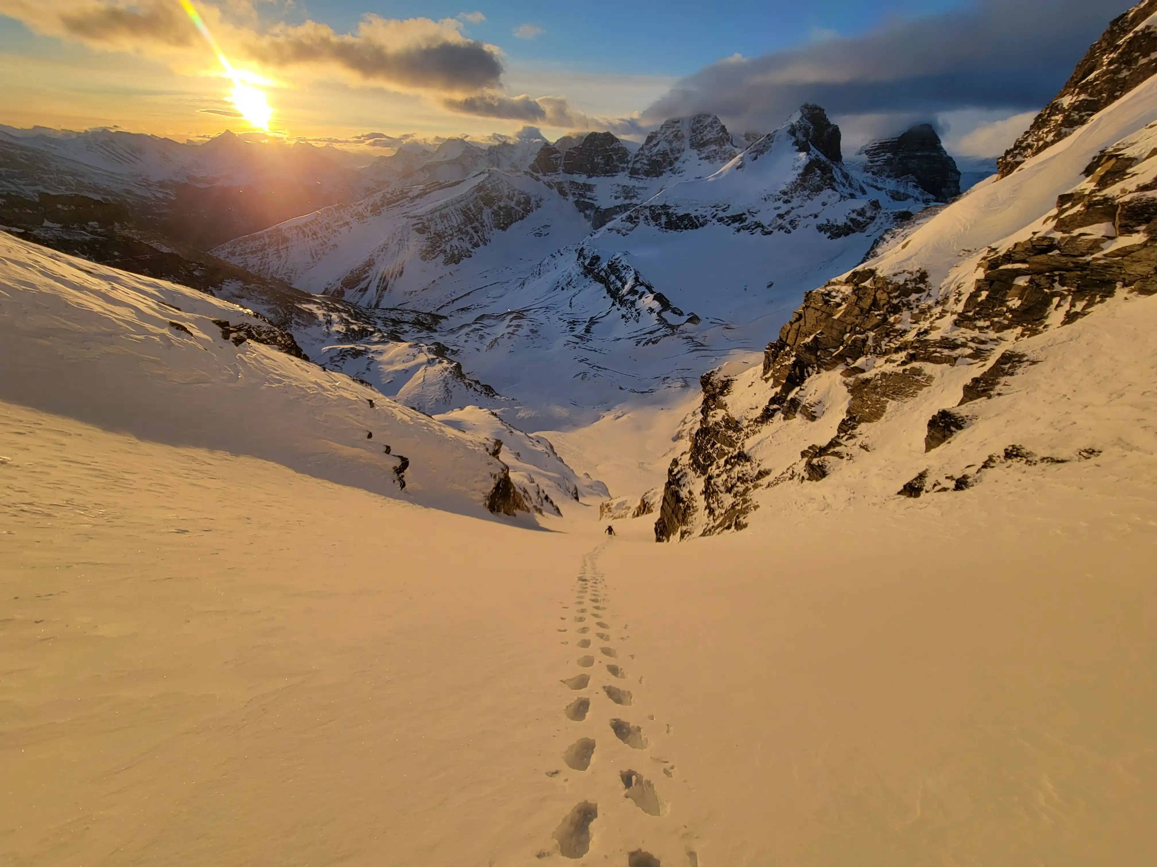 Unfortunately the couloir got a sizable amount of wind which caused it to accumulate a bunch of small rocks so we downclimbed the upper half before conditions softened and I threw the skis on for the bottom portion. From this point the descent to camp was pretty chill although the snow conditions weren't great in places and once we got back we were focussed on packing up quickly before making our exit in the dark. The steeper sections of the exit were a bit tedious with a heavy pack given the mixed conditions but once things flattened out travel was fast and easy. All that was left was the final treed steep portion which was about as annoying as you'd expect to descend and took a decent amount of time but once we were back at the Sunwapta River it was just a few more minutes before we were back on the highway.
