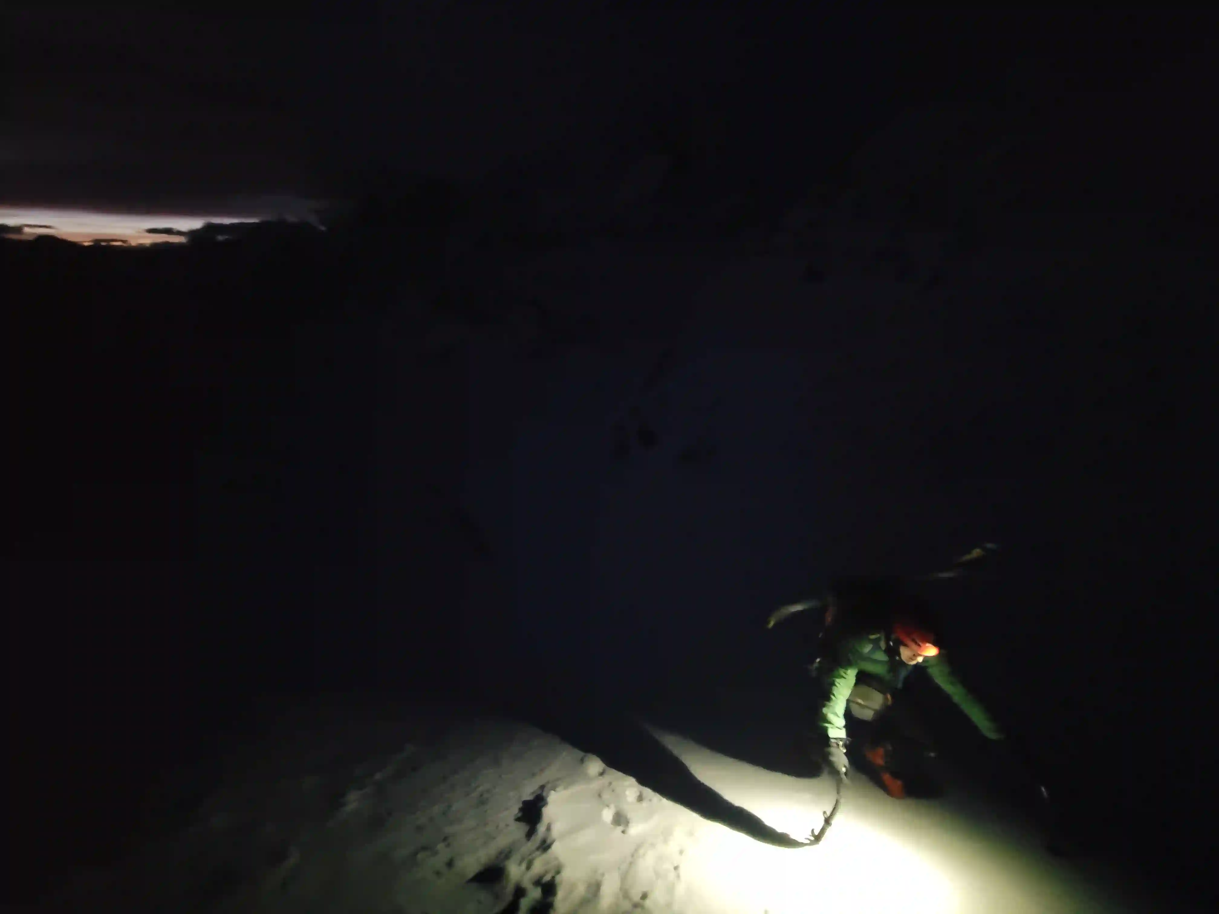 One thing we didn't realize was that even once you're in the base of the SE face direct couloir you're still technically on glacier but the snowpack was pretty good so it didn't seem like the most dangerous terrain to be unroped on. Once we were about a third up the couloir we got a sweet sunrise which helped with navigation and after branching right at an obvious rock feature the couloir continues at a steep grade until you reach the ridge at an access point where you don't have to break through a cornice.