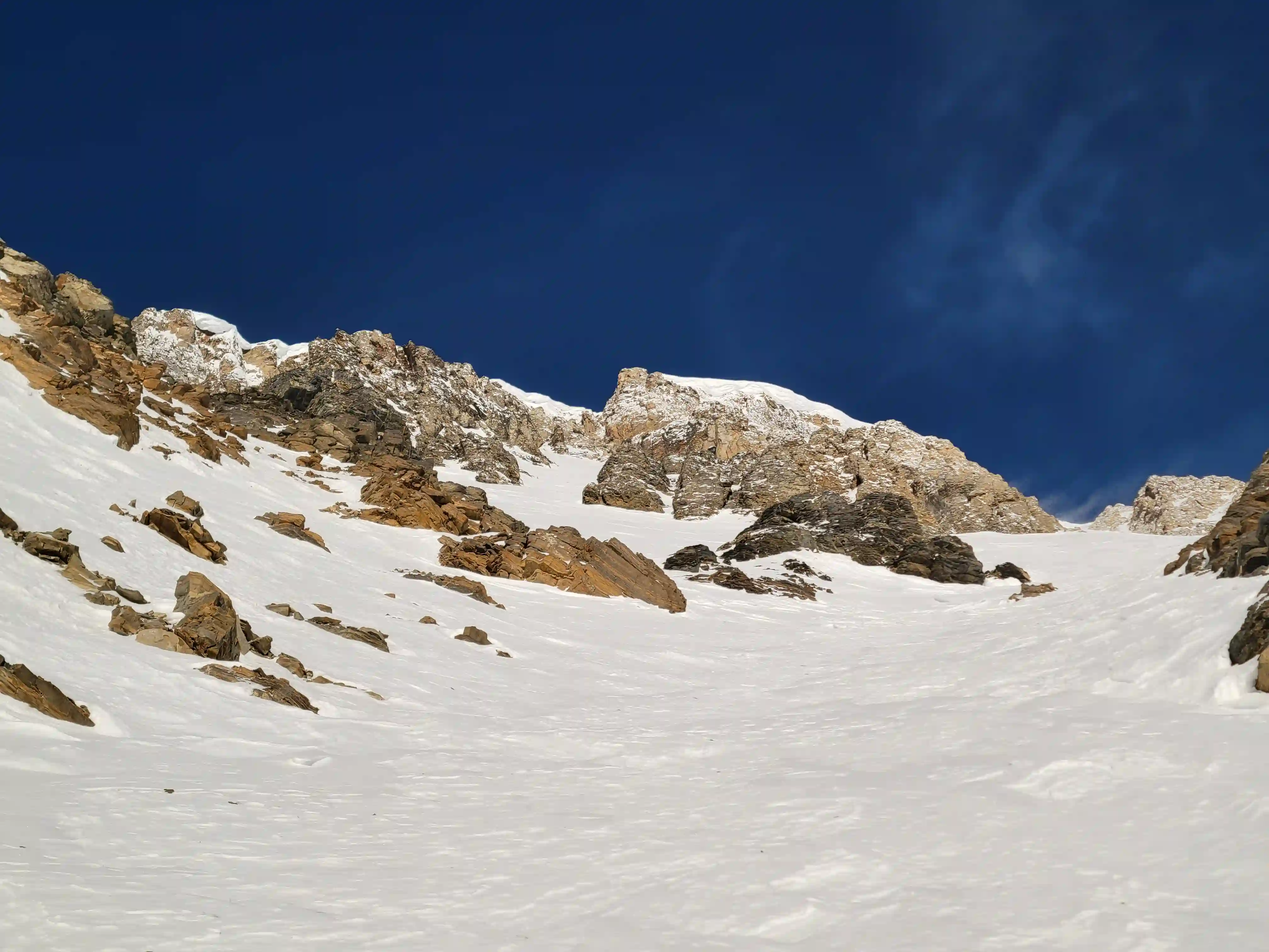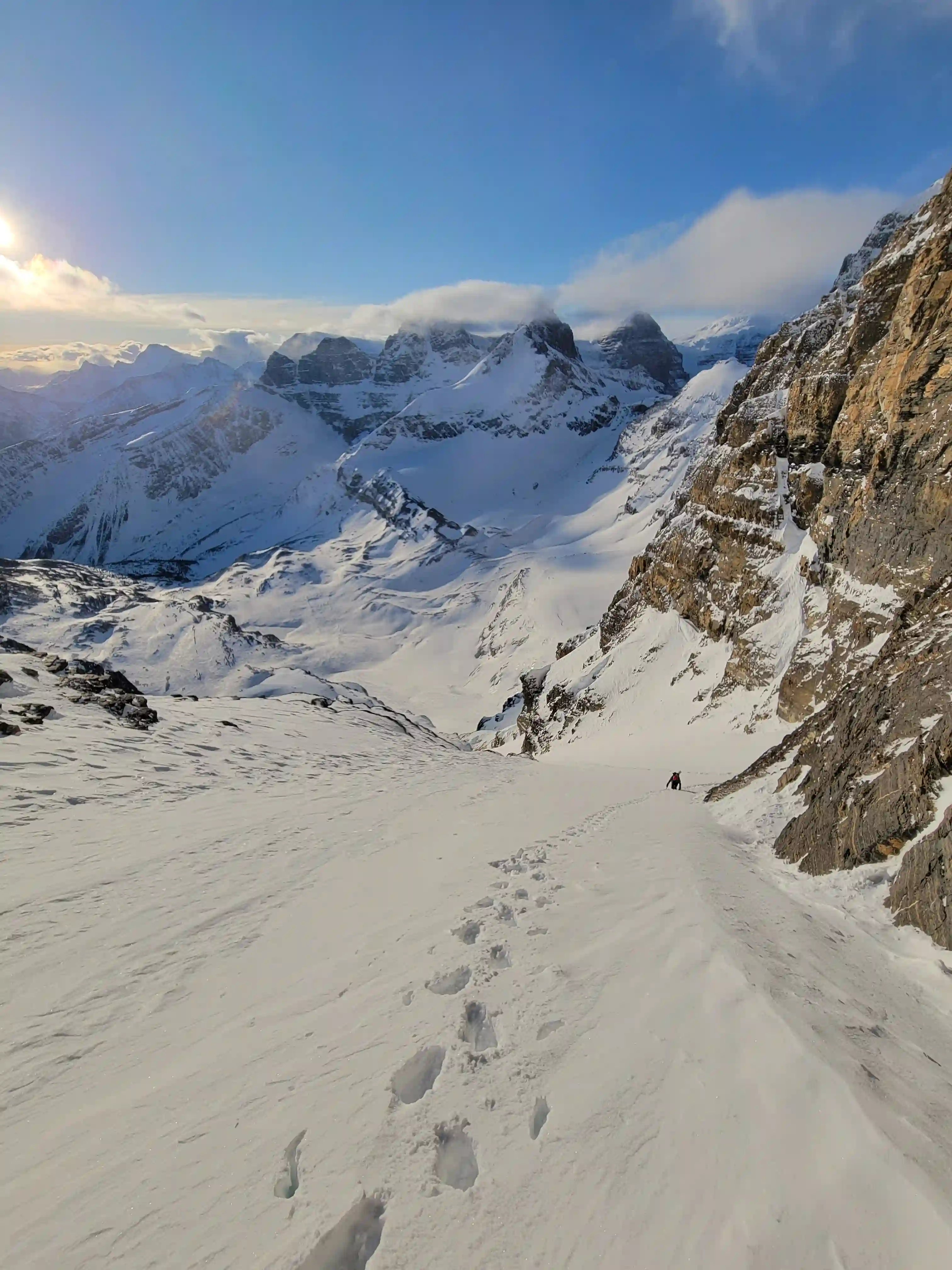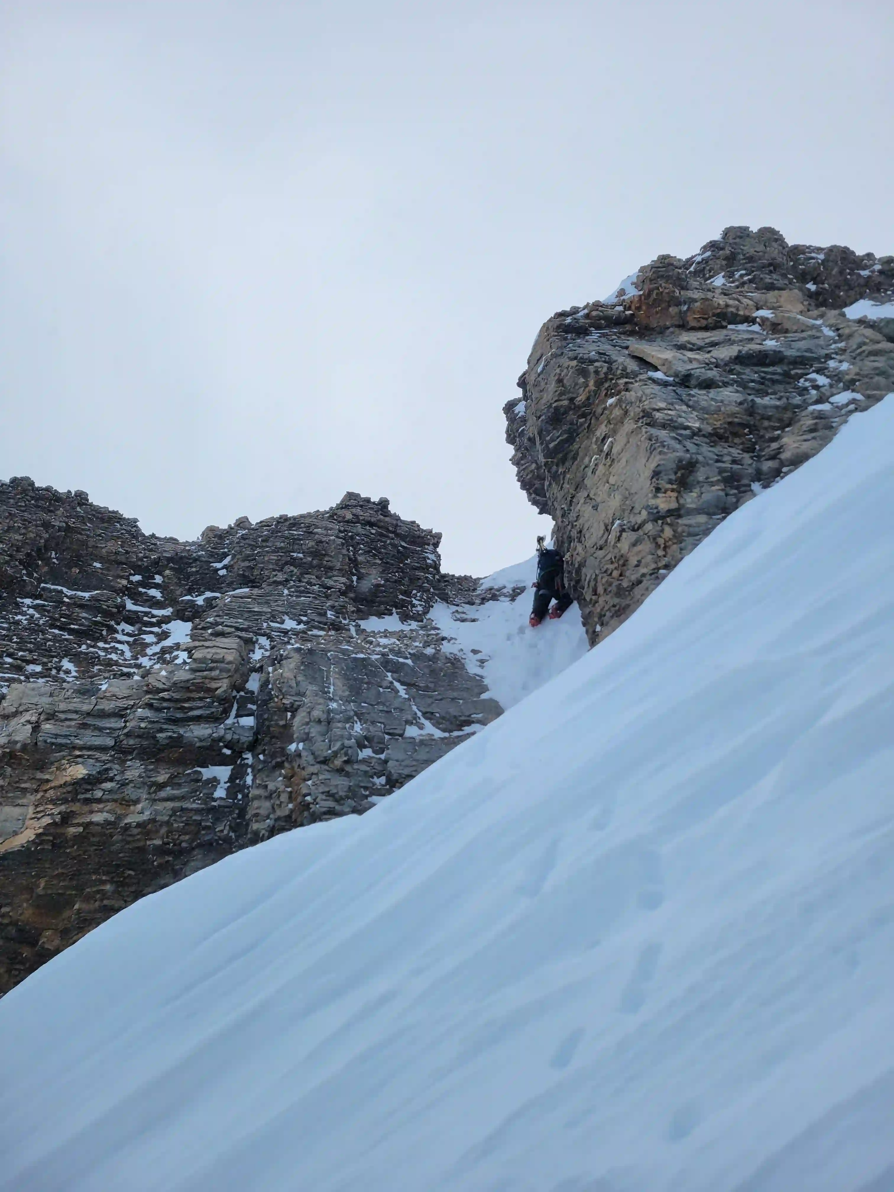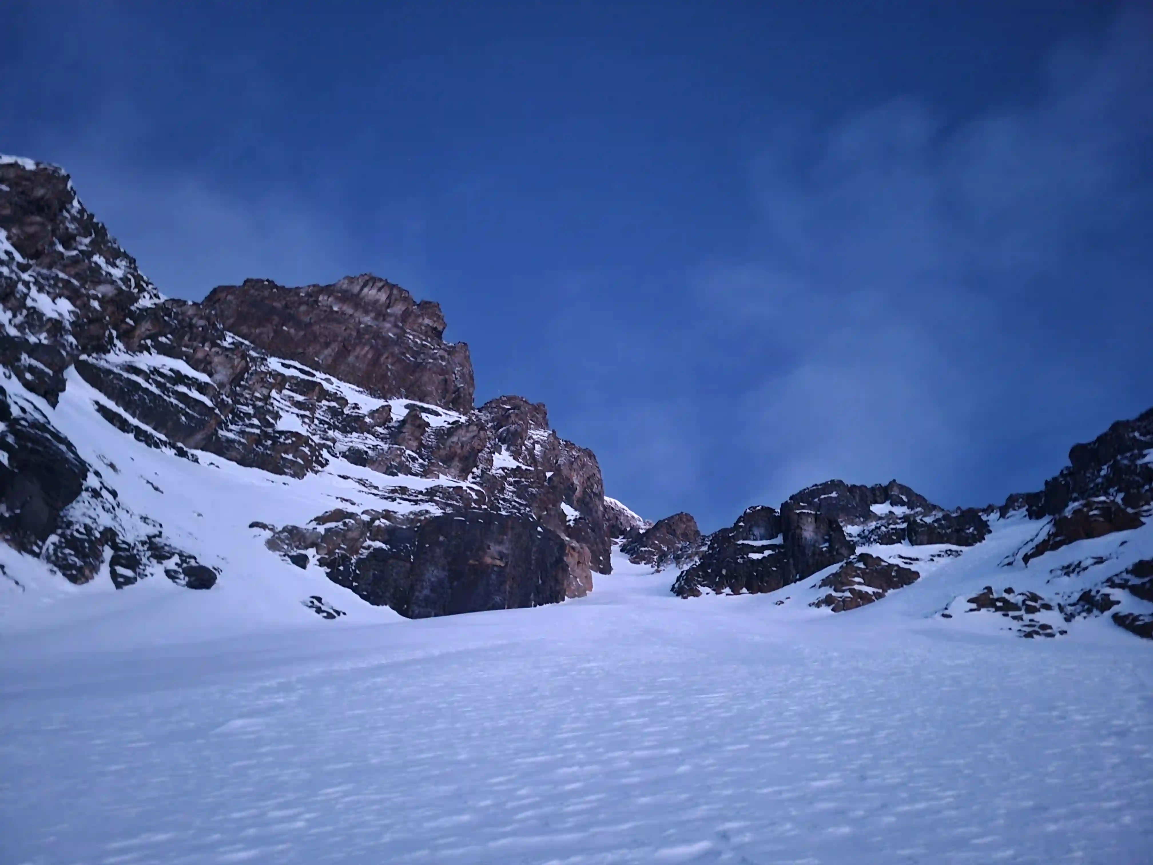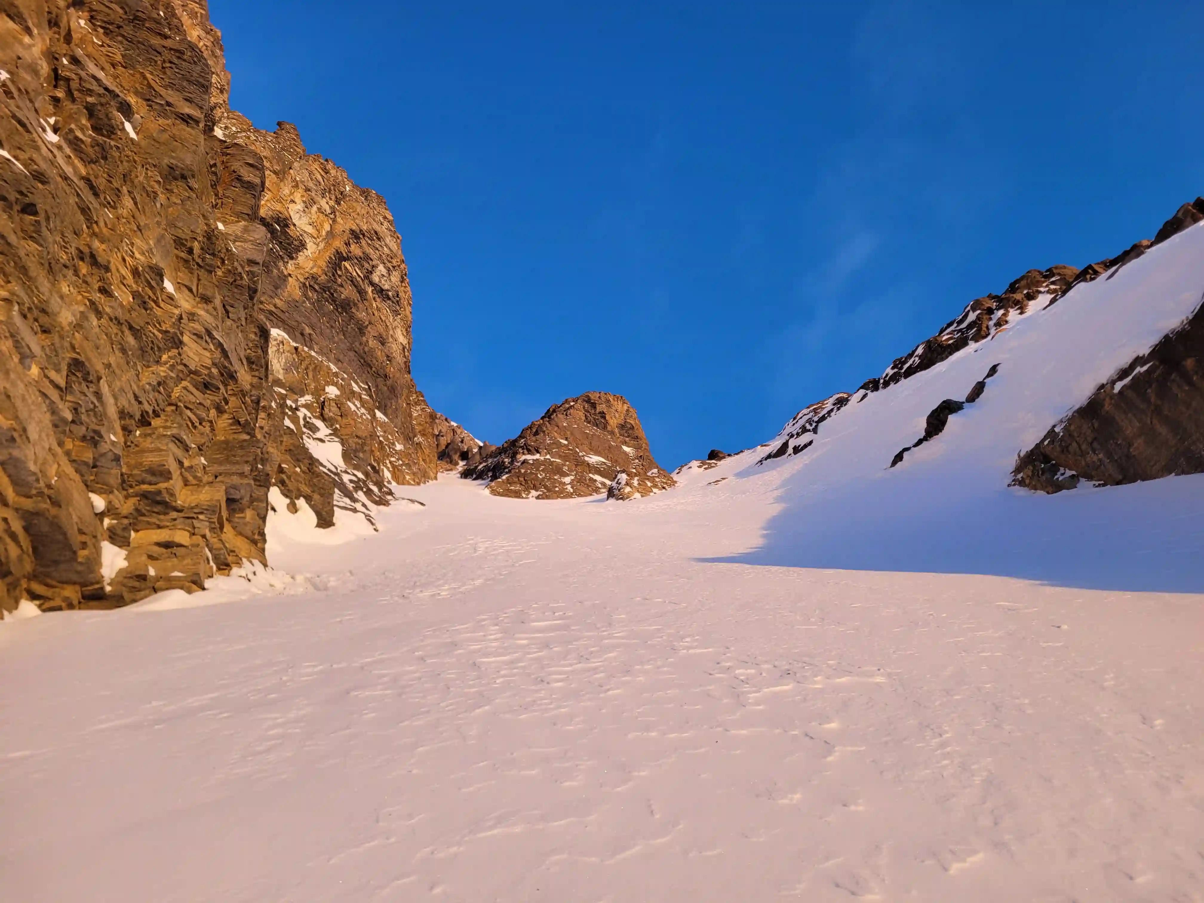 I had forgotten to download a GPS track leading into this trip so navigating in the dark was a bit trickier than it needed to be but turning off the headlamps allowed us to get a sense of direction and once we started getting close to the rocky features at the base of Diadem we were able to get our bearings and reach the start of the couloir relatively easily. There was a sizable icefall section below this slope before we started ascending and it definitely has some big slides so we were glad avy conditions were low risk.