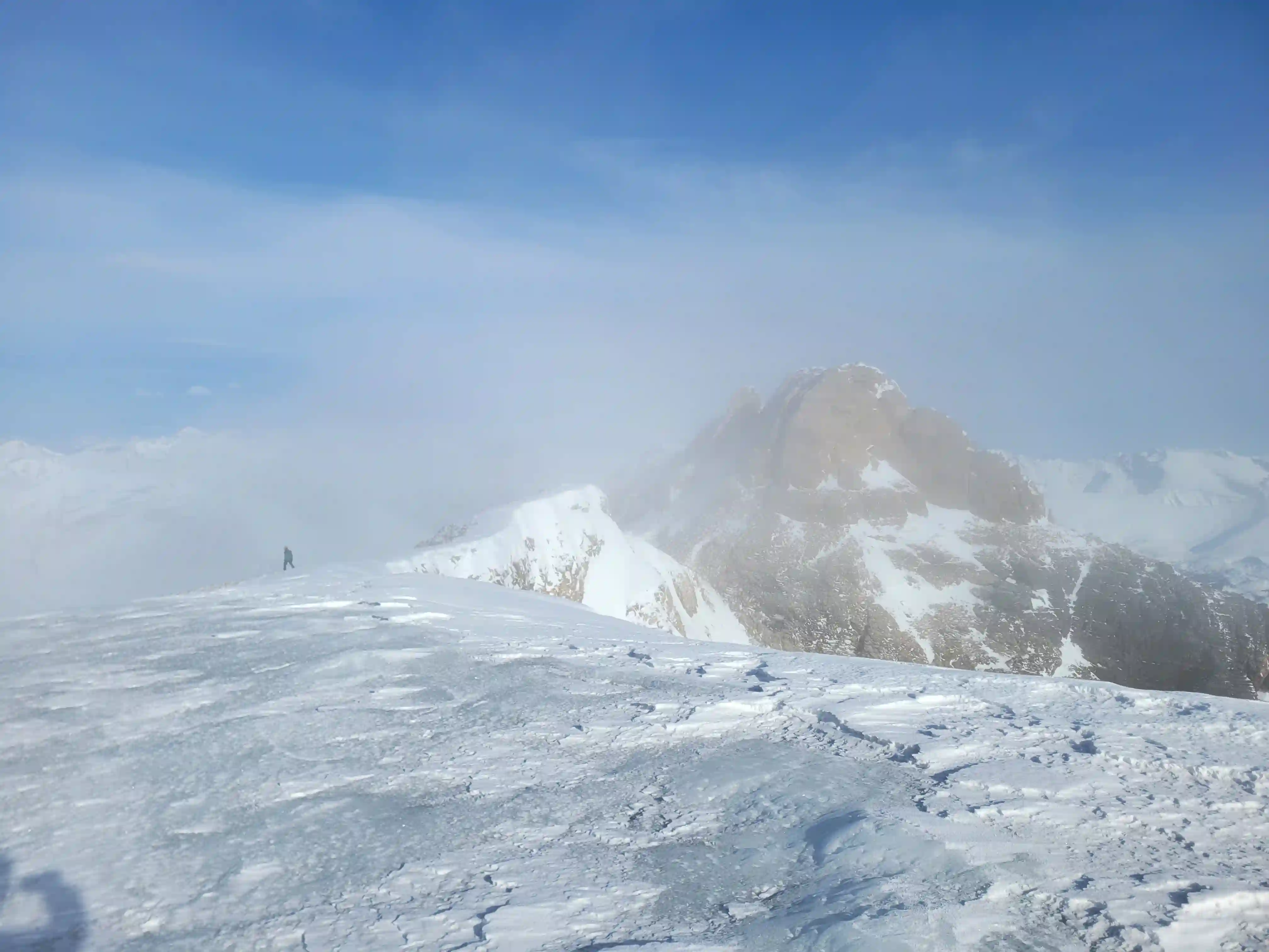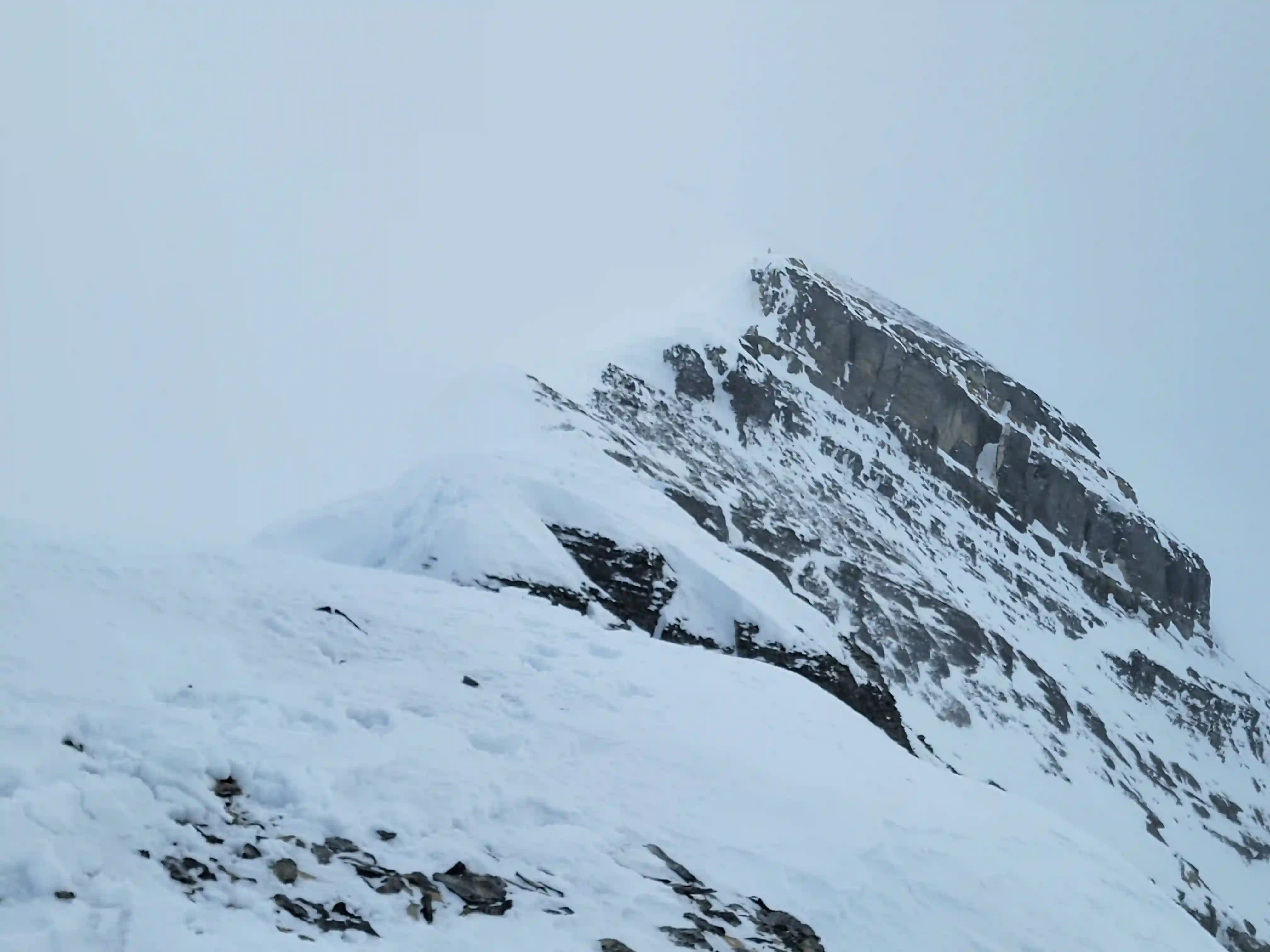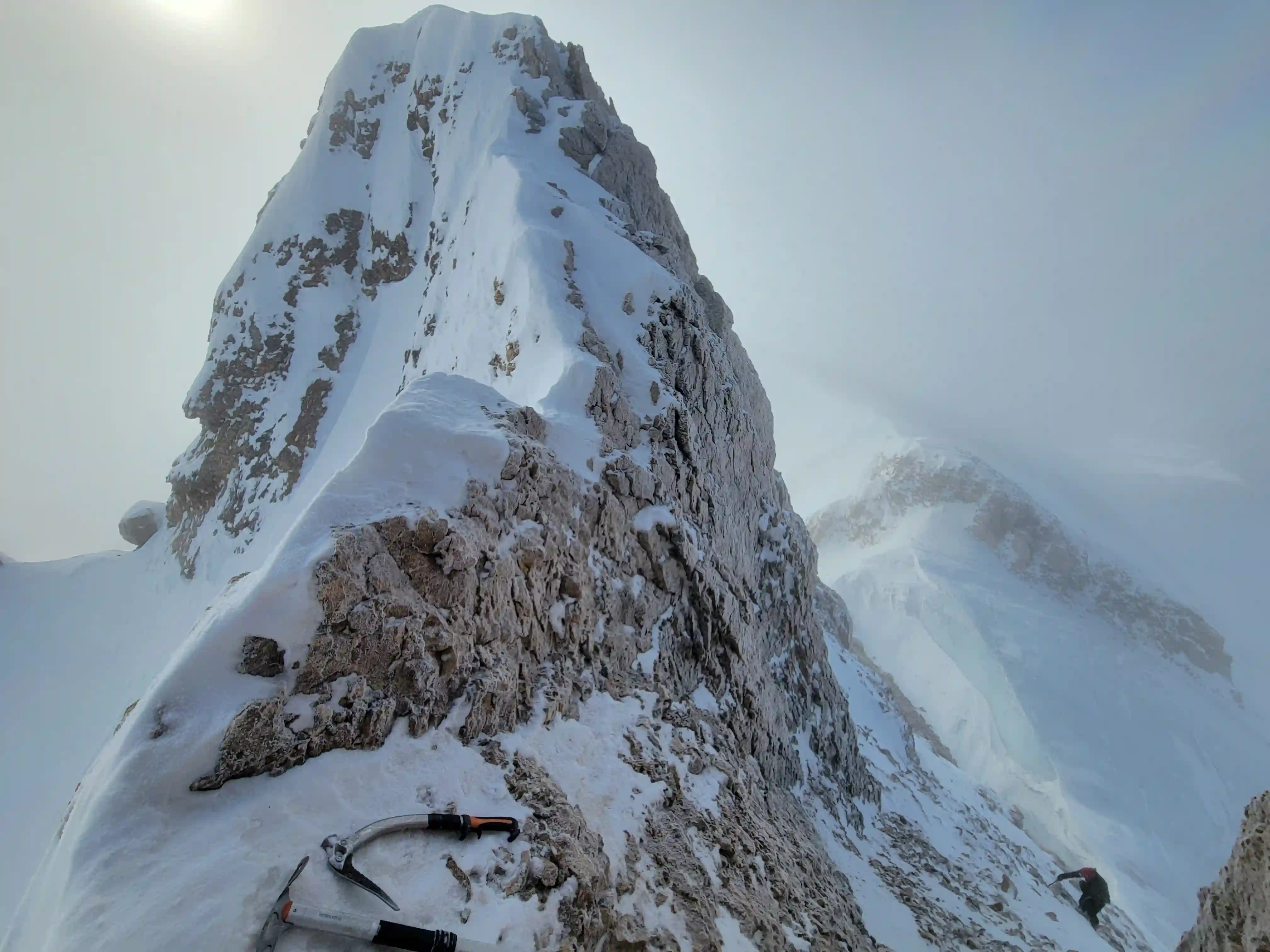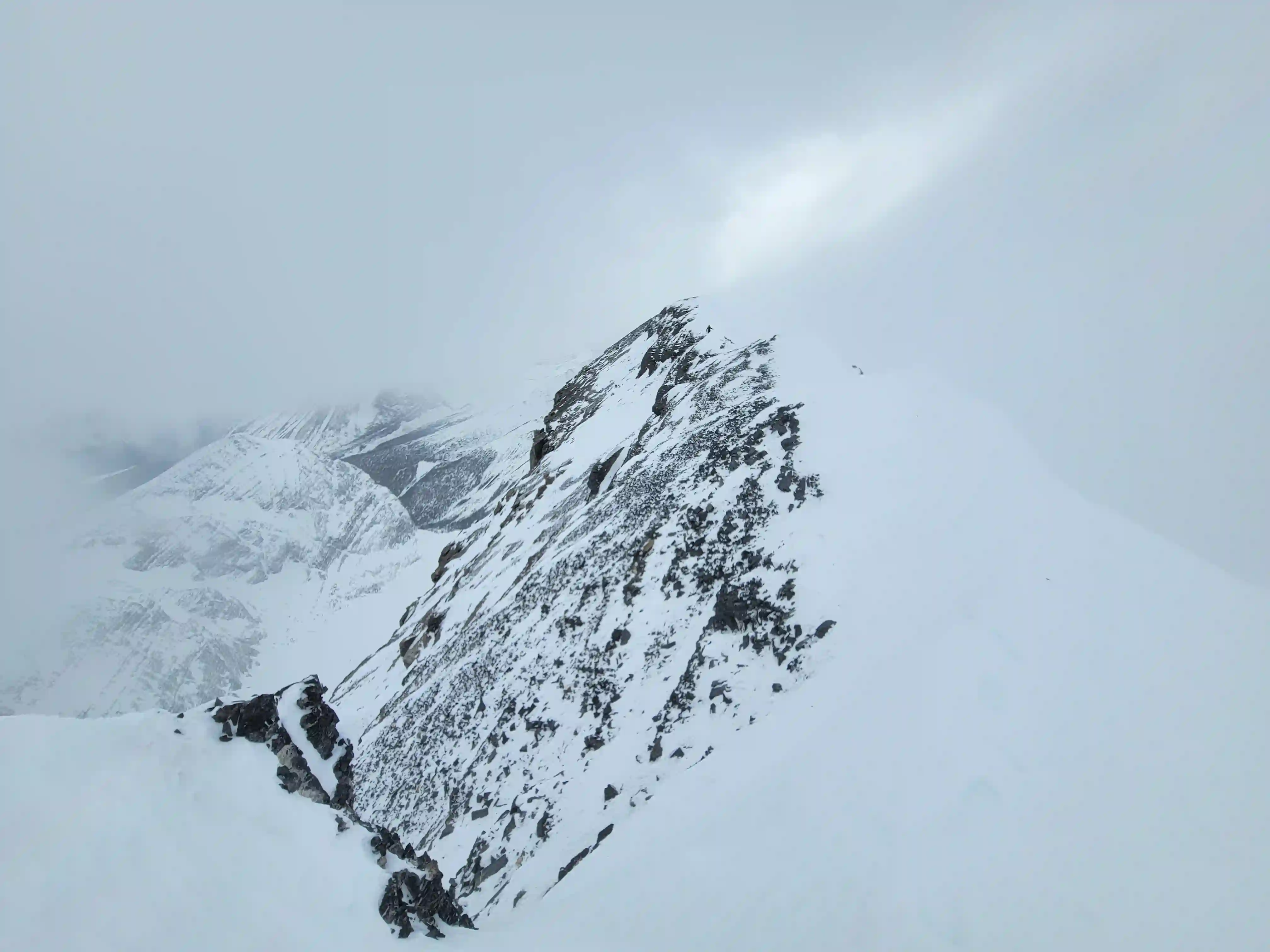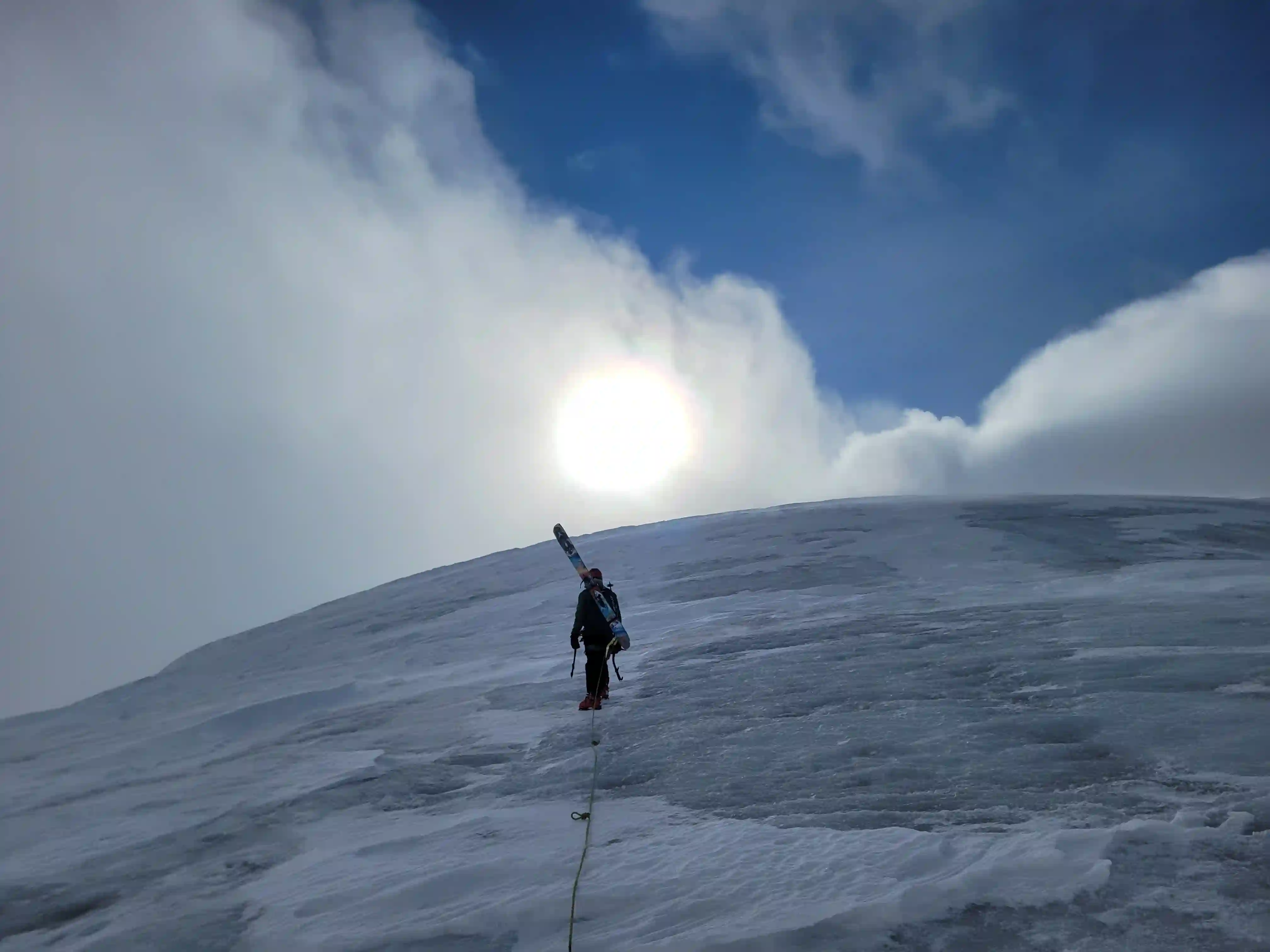 3405m, 11171ftAfter reaching the col we roped up and headed for Woolley's ridge sticking mostly to ice so that we could see any gaps on the glacier nearby. This section didn't last long and once on the ridge we ditched the skis and headed for the summit. This is where the galeforce winds started so we decided to unrope and Rob and I ended up going at different paces to the summit but aside from some sharp wind this final portion of the ascent was straightforward. It's worth noting that the upper mountain is glacier so in an ideal world you stay roped up for the upper mountain but with the wind we were dealing with this would've proven to be a pain in the ass and given the decent snowpack on the upper mountain we decided not to bother.