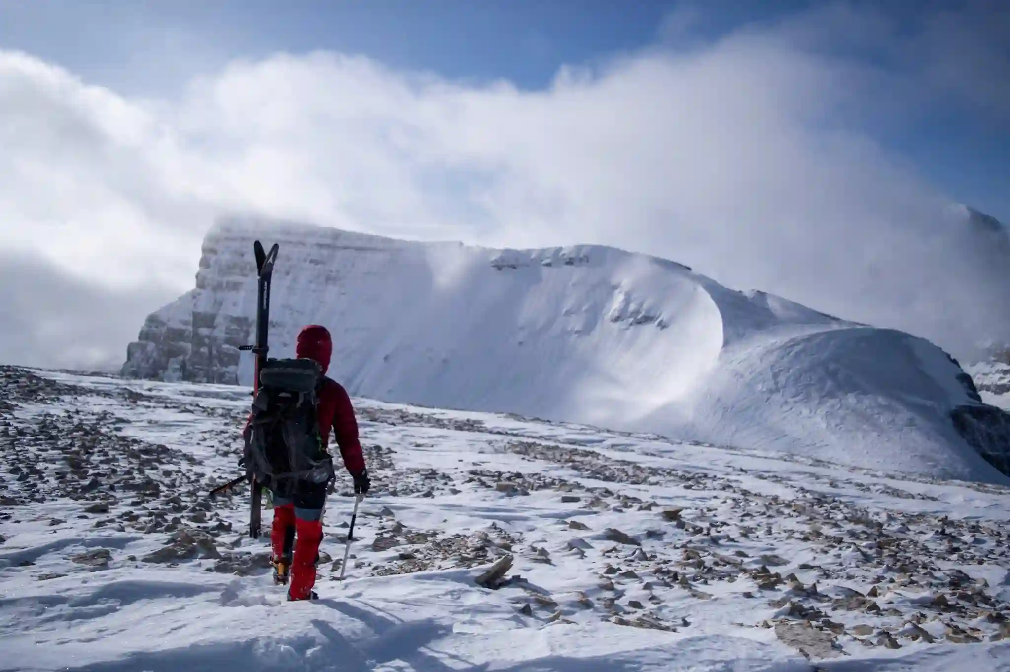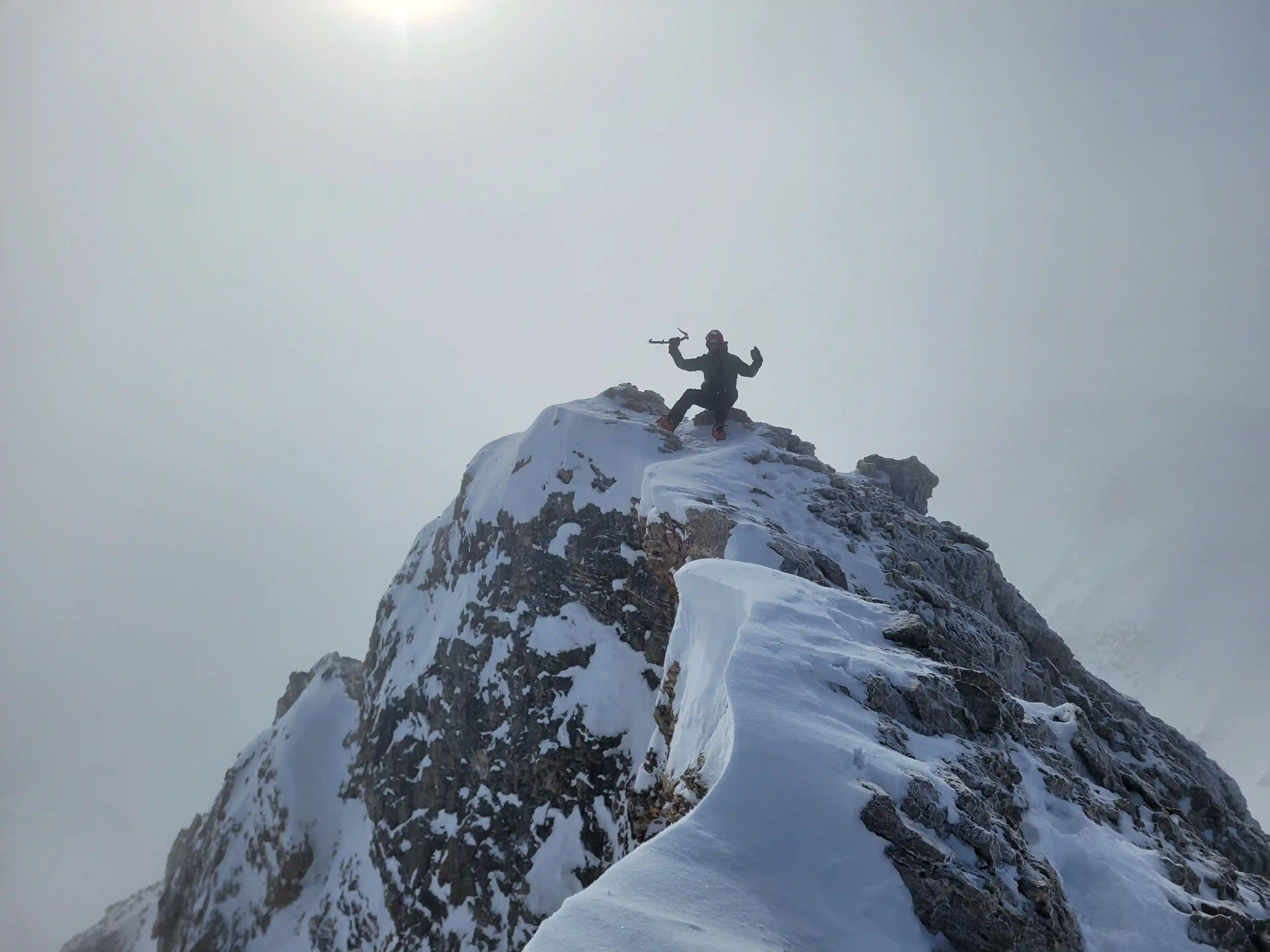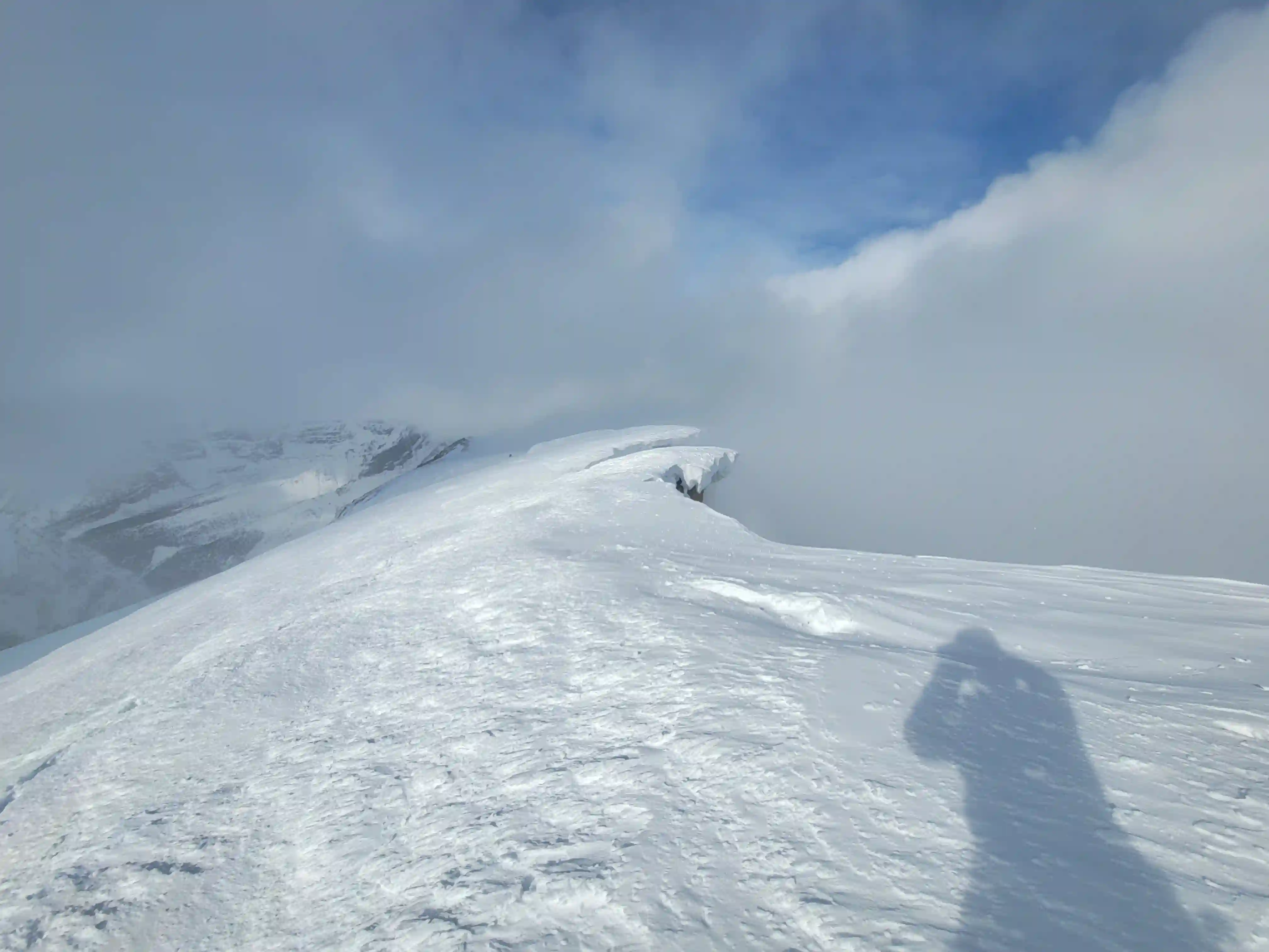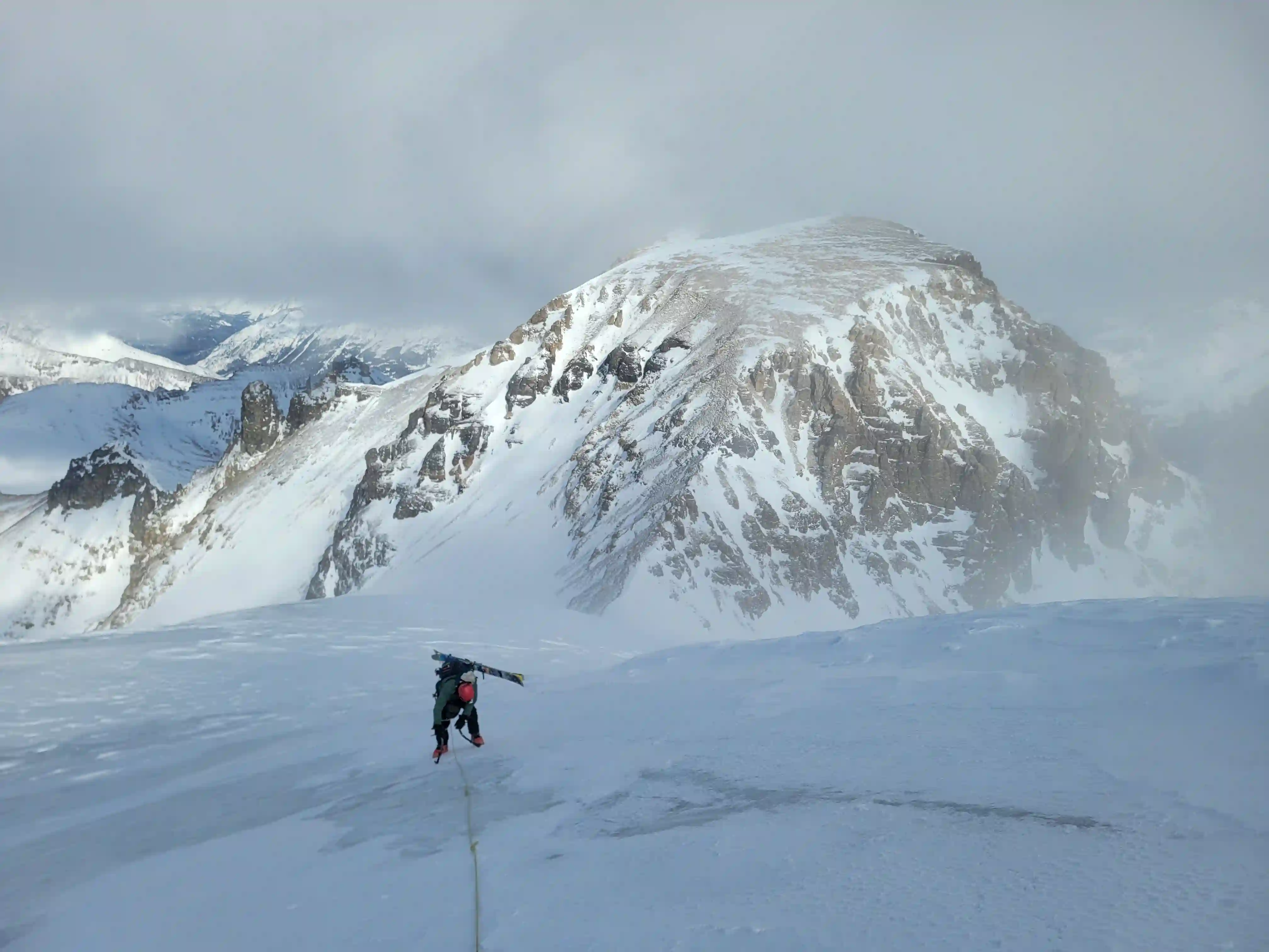 3405m, 11171ftAfter reaching the col we roped up and headed for Woolley's ridge sticking mostly to ice so that we could see any gaps on the glacier nearby. This section didn't last long and once on the ridge we ditched the skis and headed for the summit. This is where the galeforce winds started so we decided to unrope and Rob and I ended up going at different paces to the summit but aside from some sharp wind this final portion of the ascent was straightforward. It's worth noting that the upper mountain is glacier so in an ideal world you stay roped up for the upper mountain but with the wind we were dealing with this would've proven to be a pain in the ass and given the decent snowpack on the upper mountain we decided not to bother.