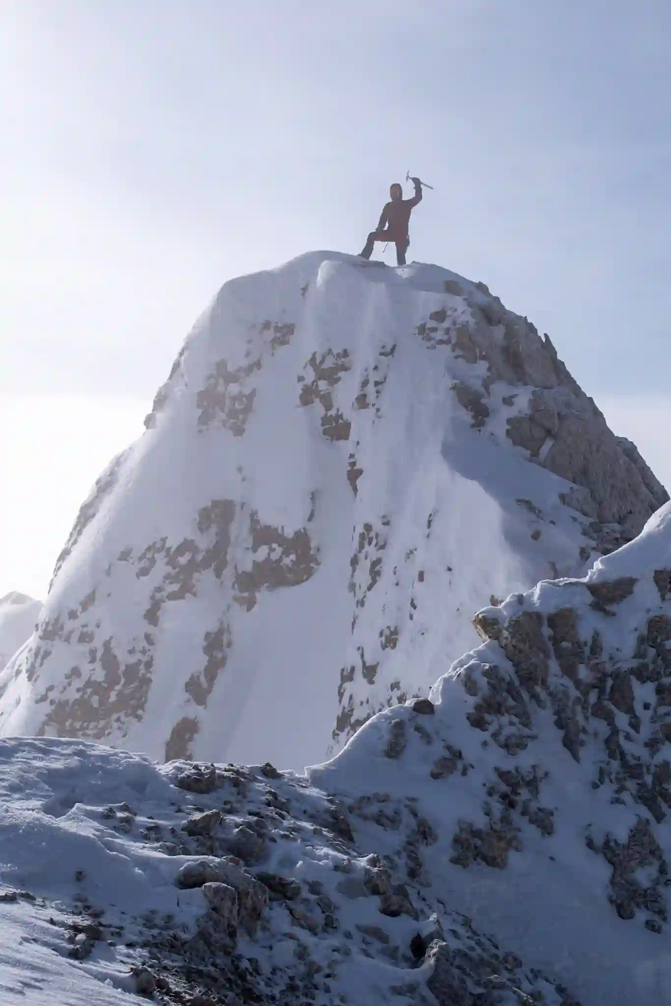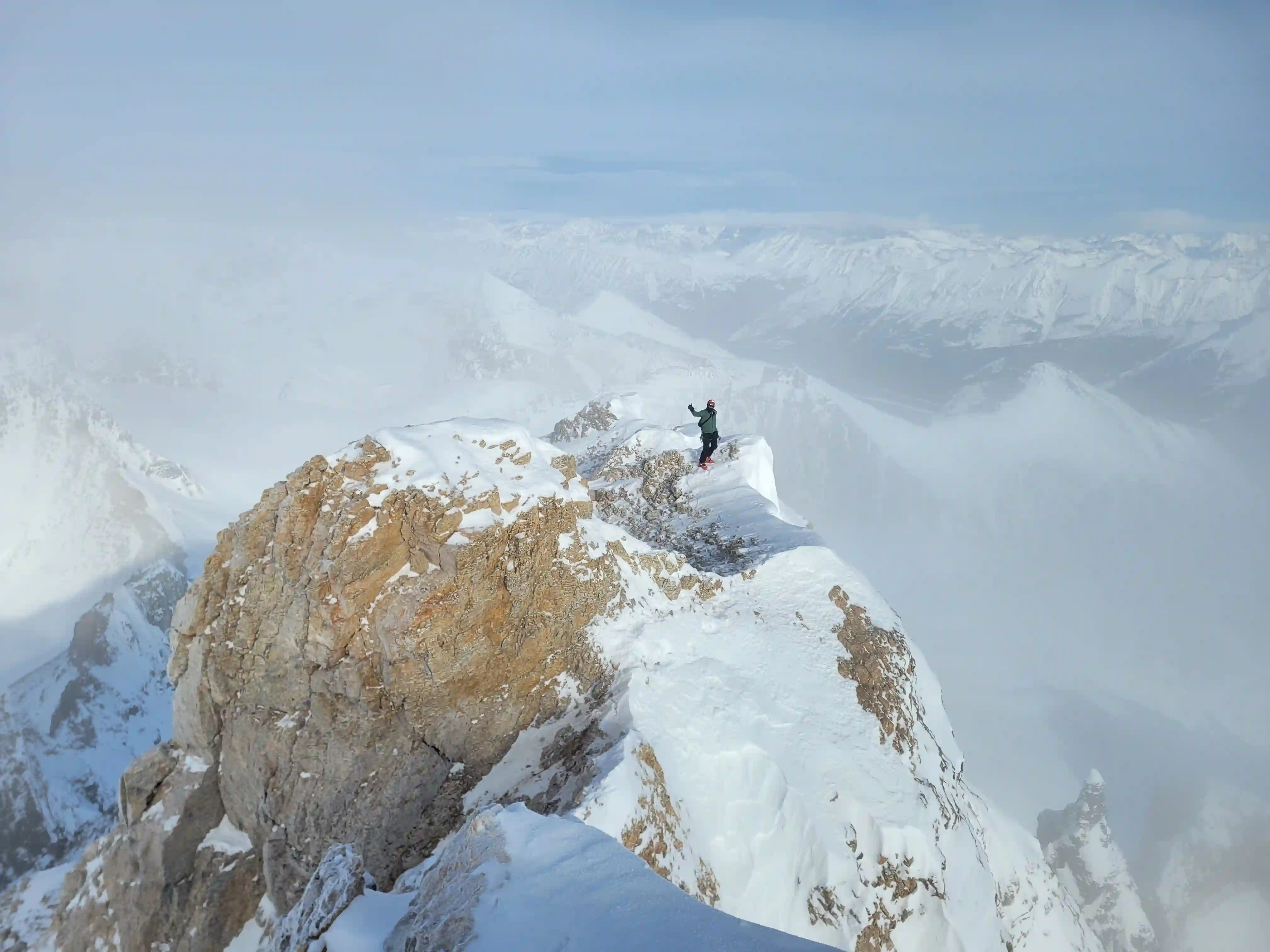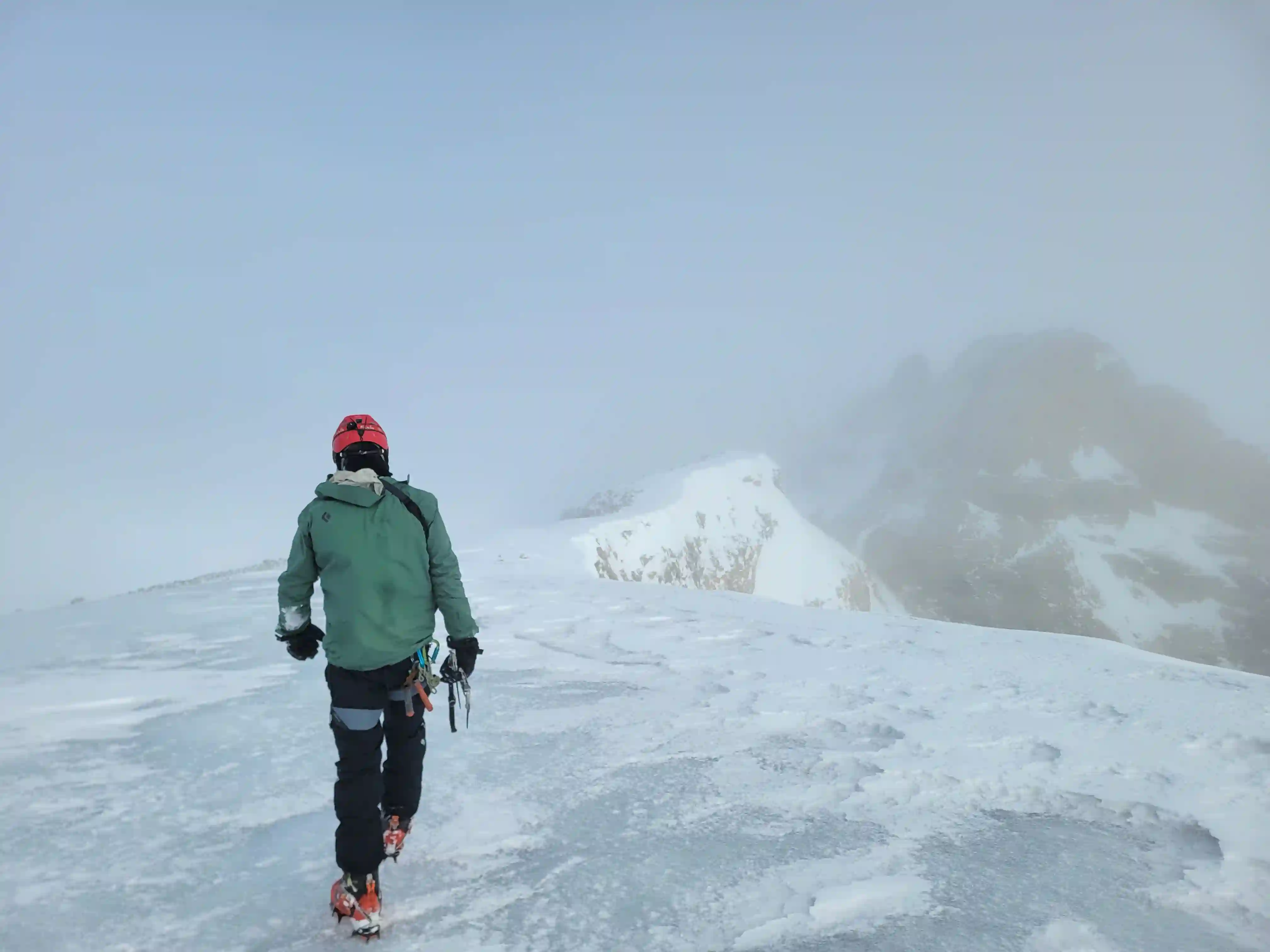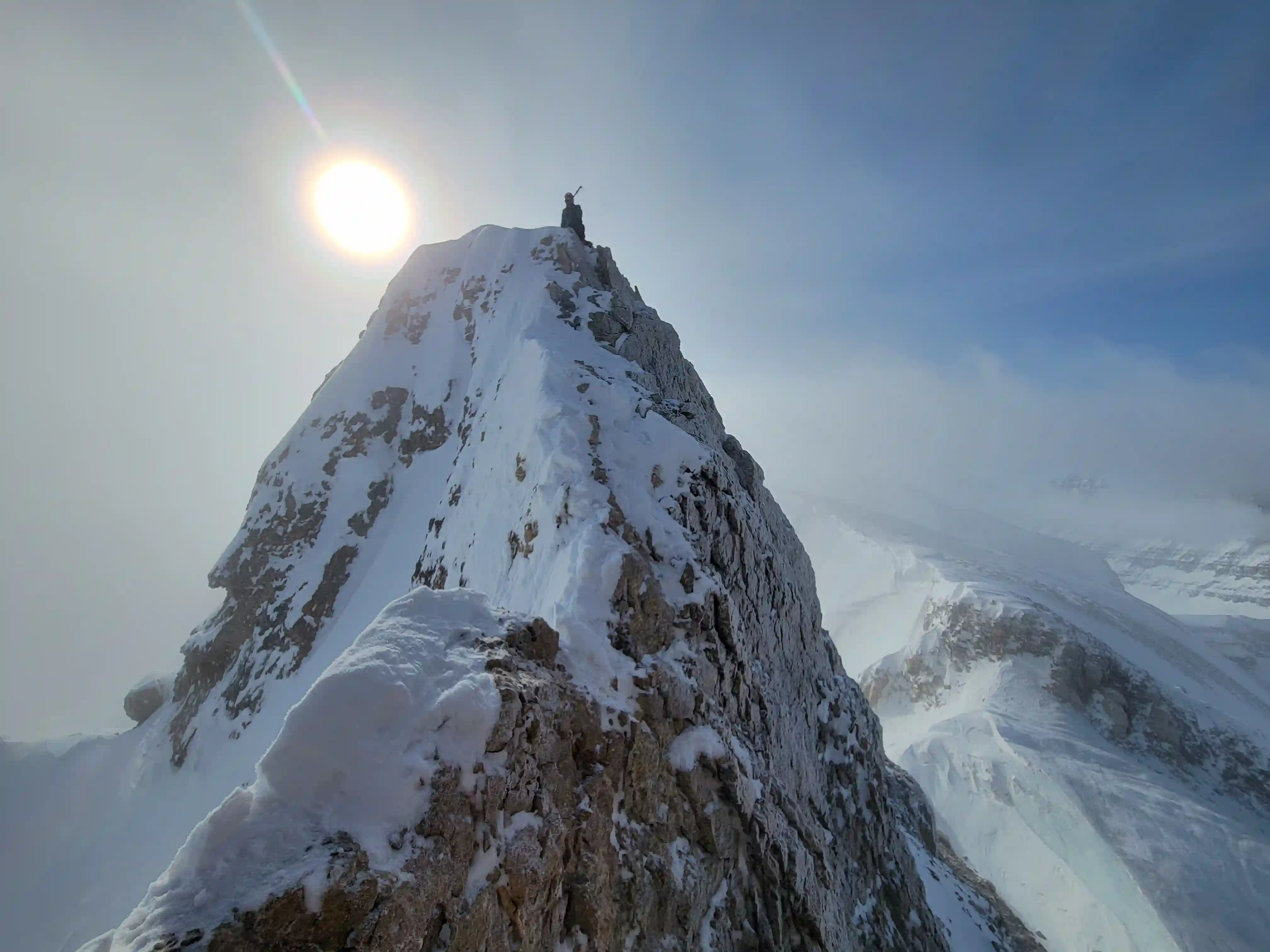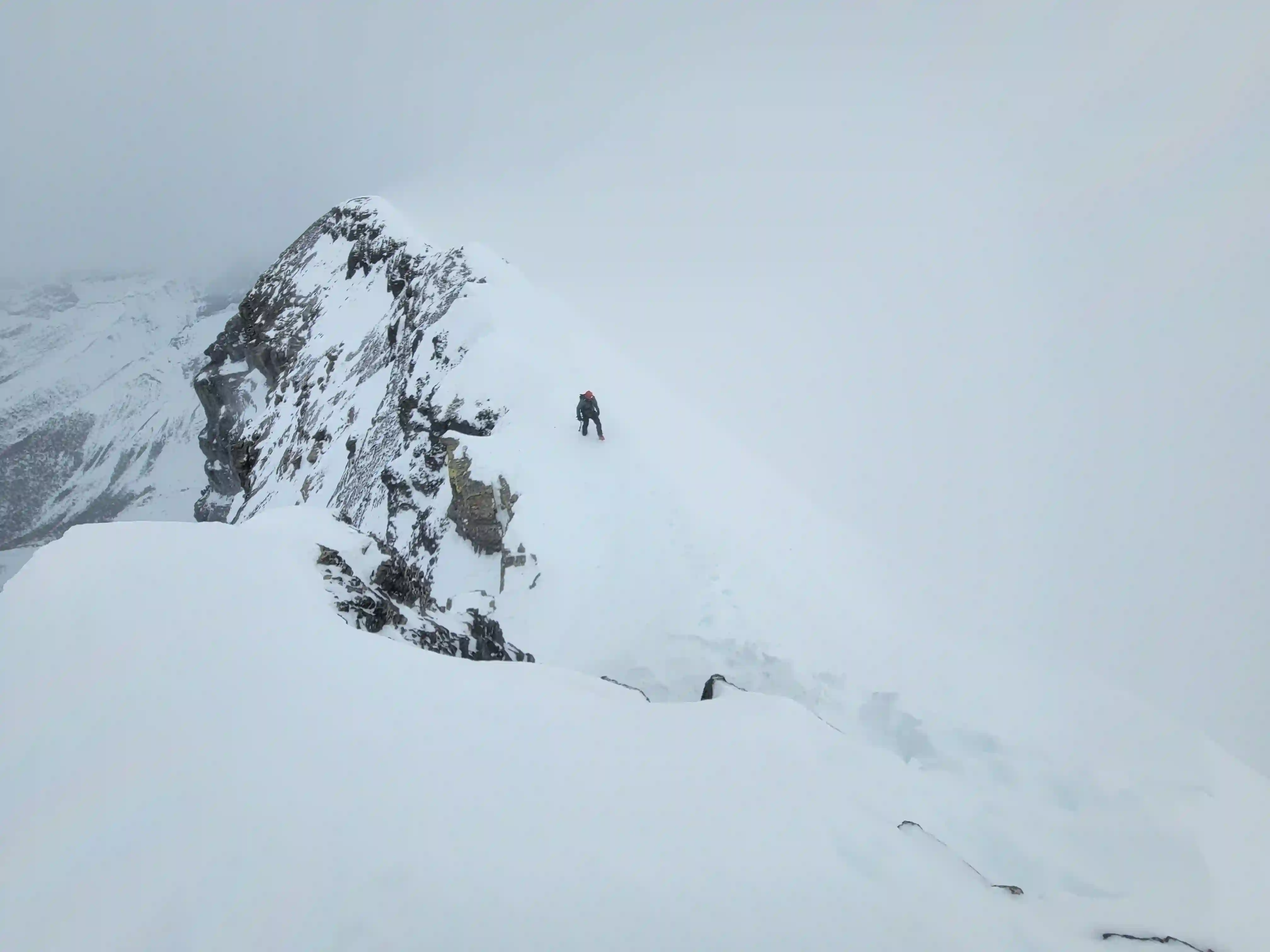 3405m, 11171ftAfter reaching the col we roped up and headed for Woolley's ridge sticking mostly to ice so that we could see any gaps on the glacier nearby. This section didn't last long and once on the ridge we ditched the skis and headed for the summit. This is where the galeforce winds started so we decided to unrope and Rob and I ended up going at different paces to the summit but aside from some sharp wind this final portion of the ascent was straightforward. It's worth noting that the upper mountain is glacier so in an ideal world you stay roped up for the upper mountain but with the wind we were dealing with this would've proven to be a pain in the ass and given the decent snowpack on the upper mountain we decided not to bother.