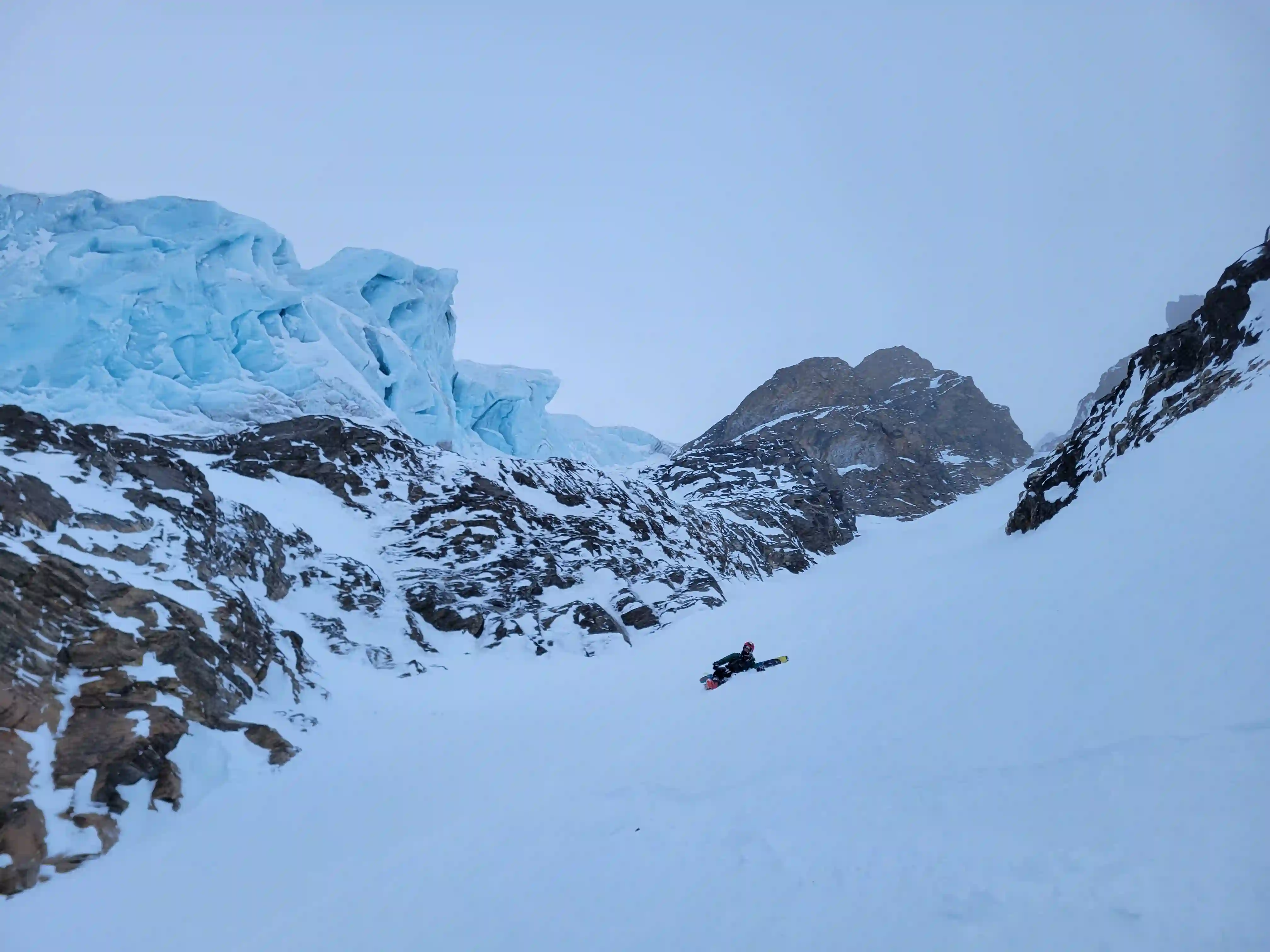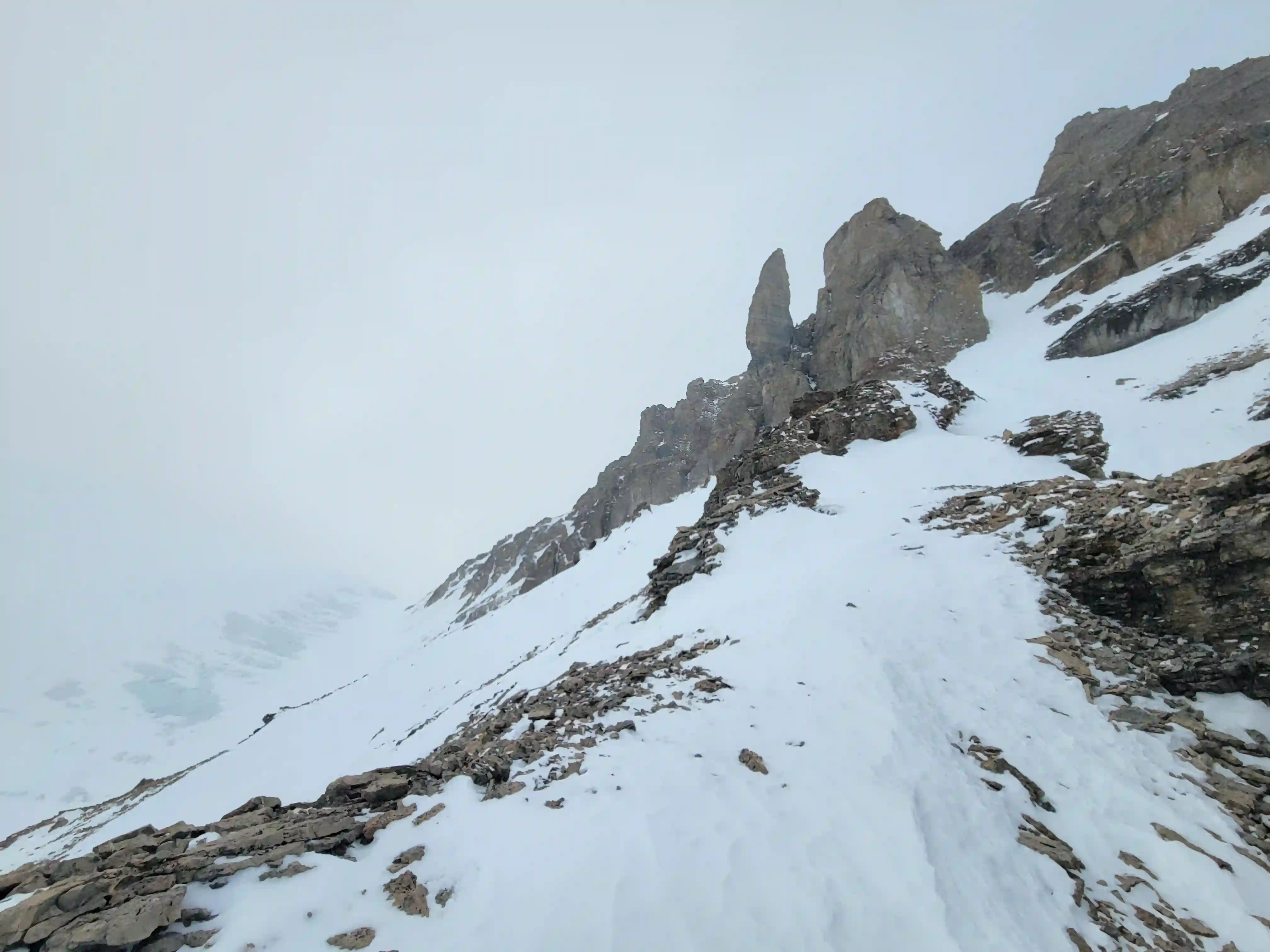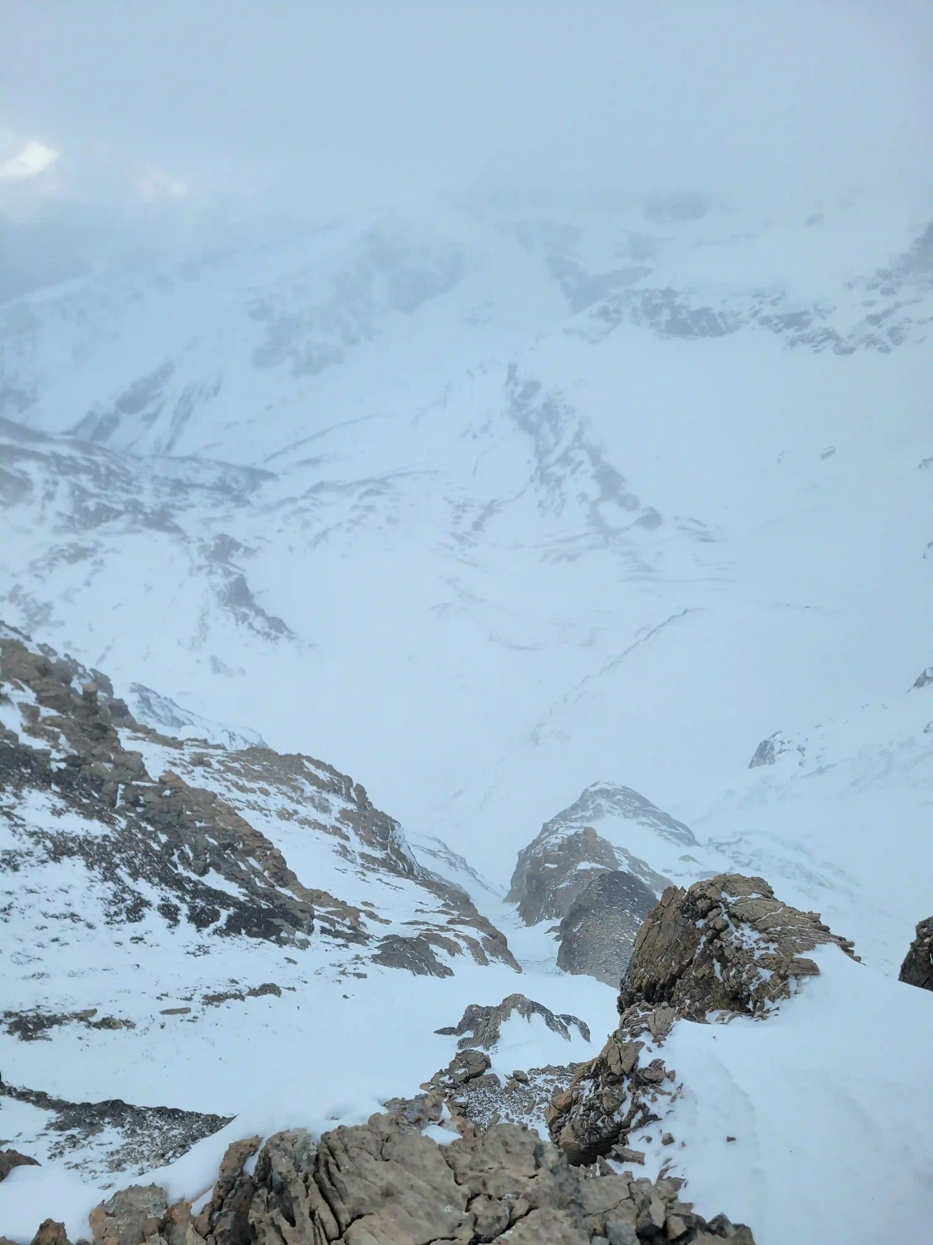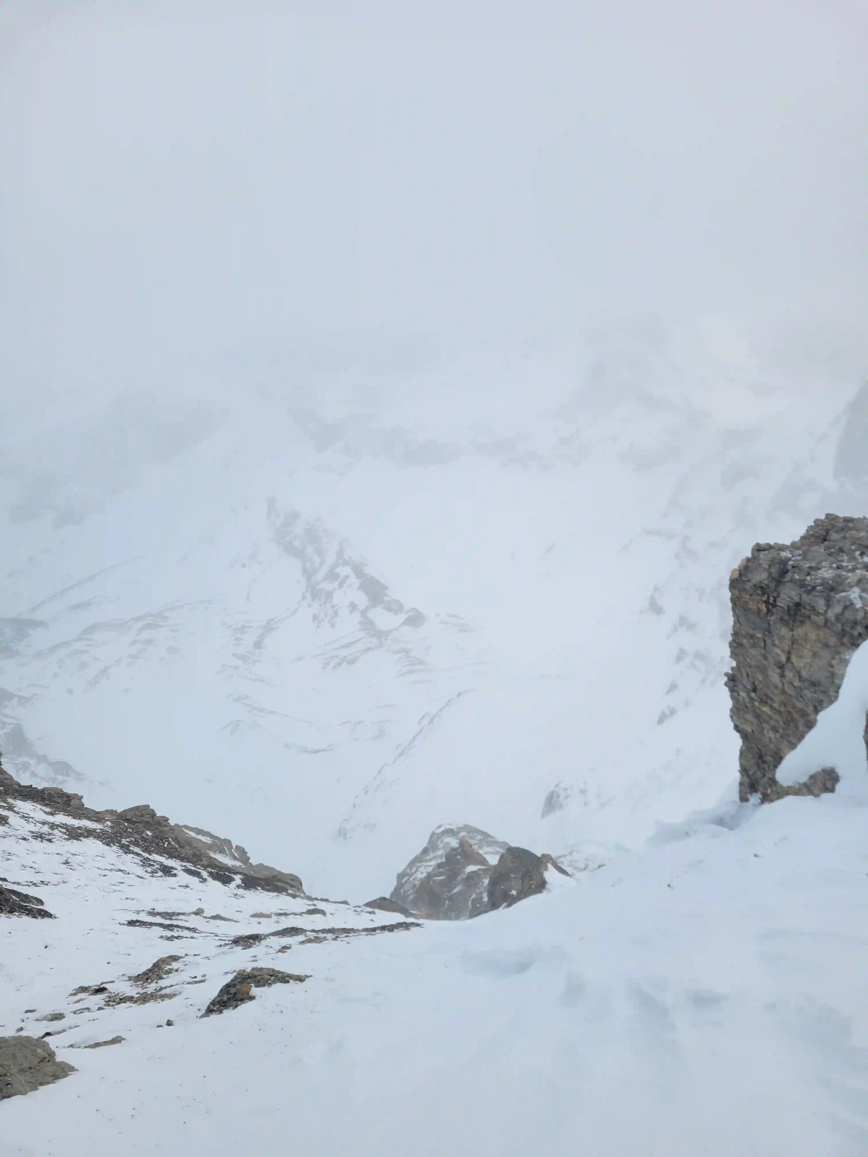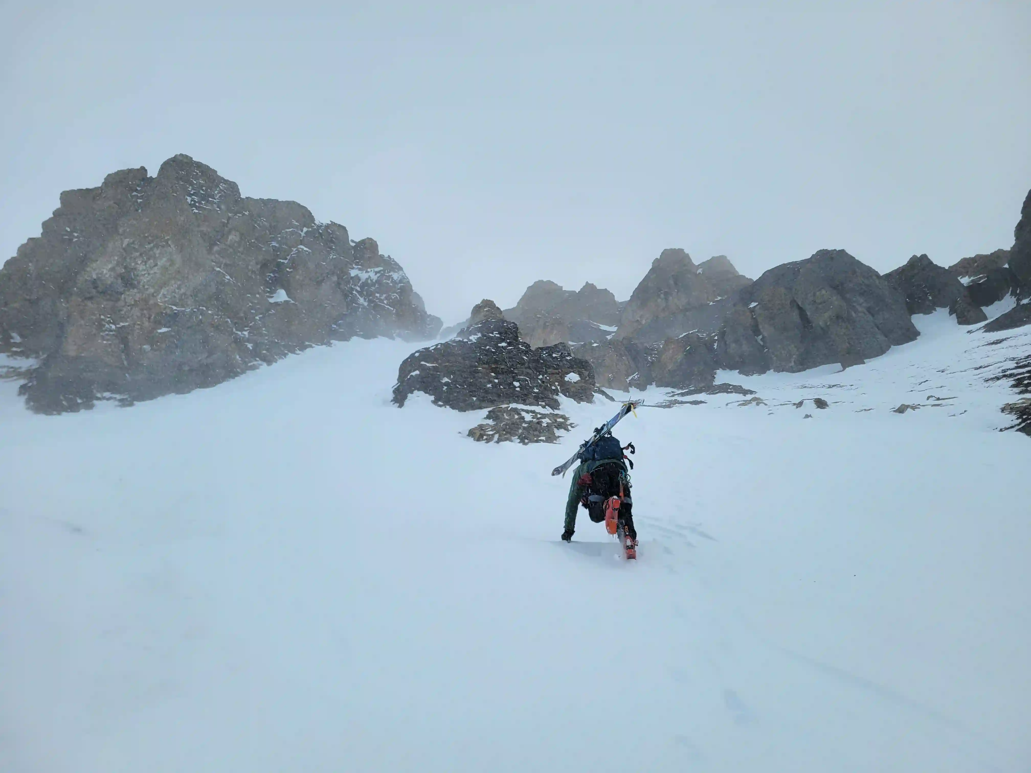 After Rob reached the summit we didn't hang around for long before heading down. The thing about mountain conditions in February is that when it's good it's fine, but when it's bad it can get serious quickly. We made our way back to our skis but by this point cloud cover had moved in enough that visibility was quite poor so we decided not to ski from the ridge with all the icy sections below. Once we returned to the col I used some photos from our approach day to navigate to where our descent couloir was and after 400-500m of side hilling we were right above it.