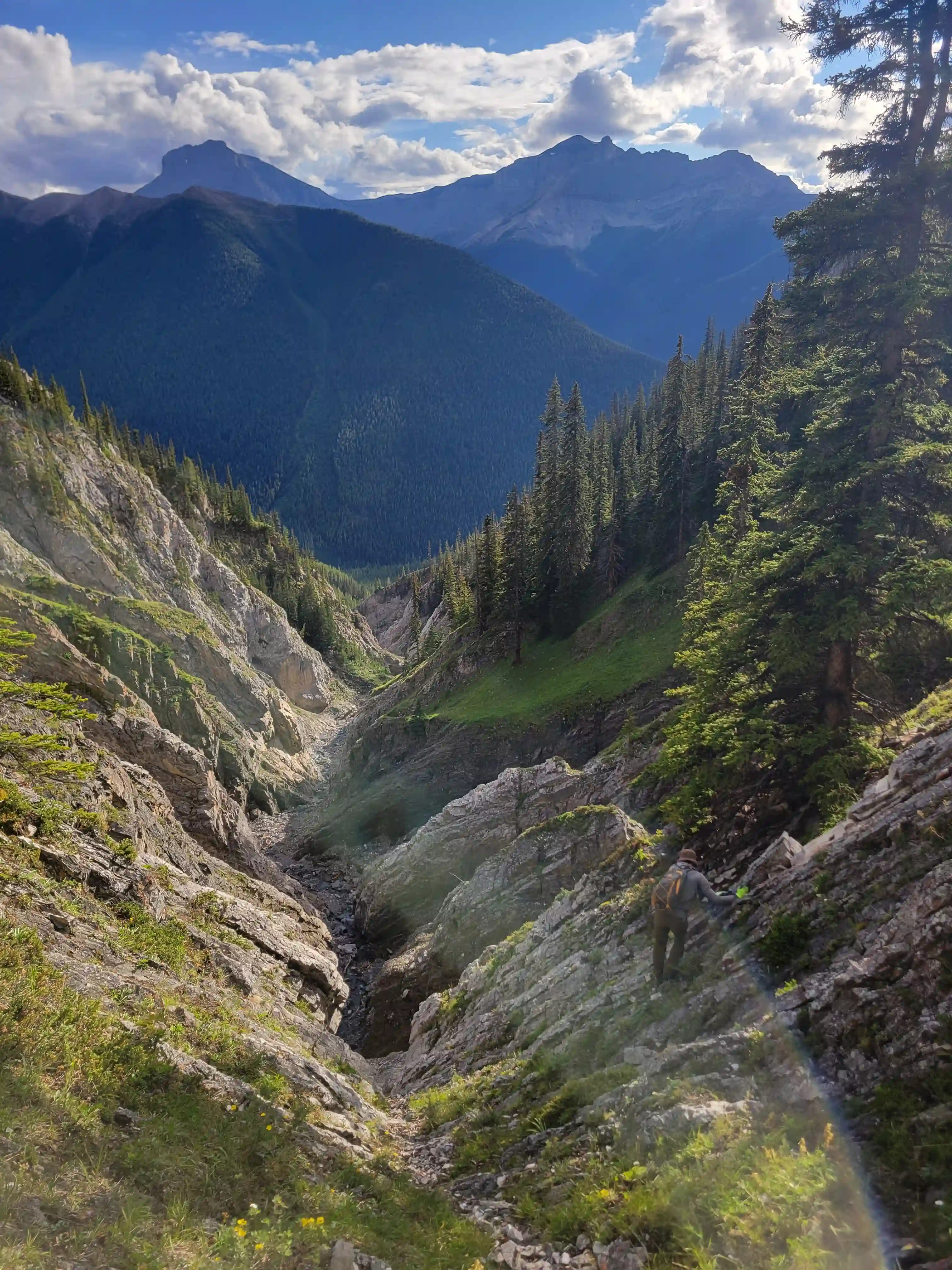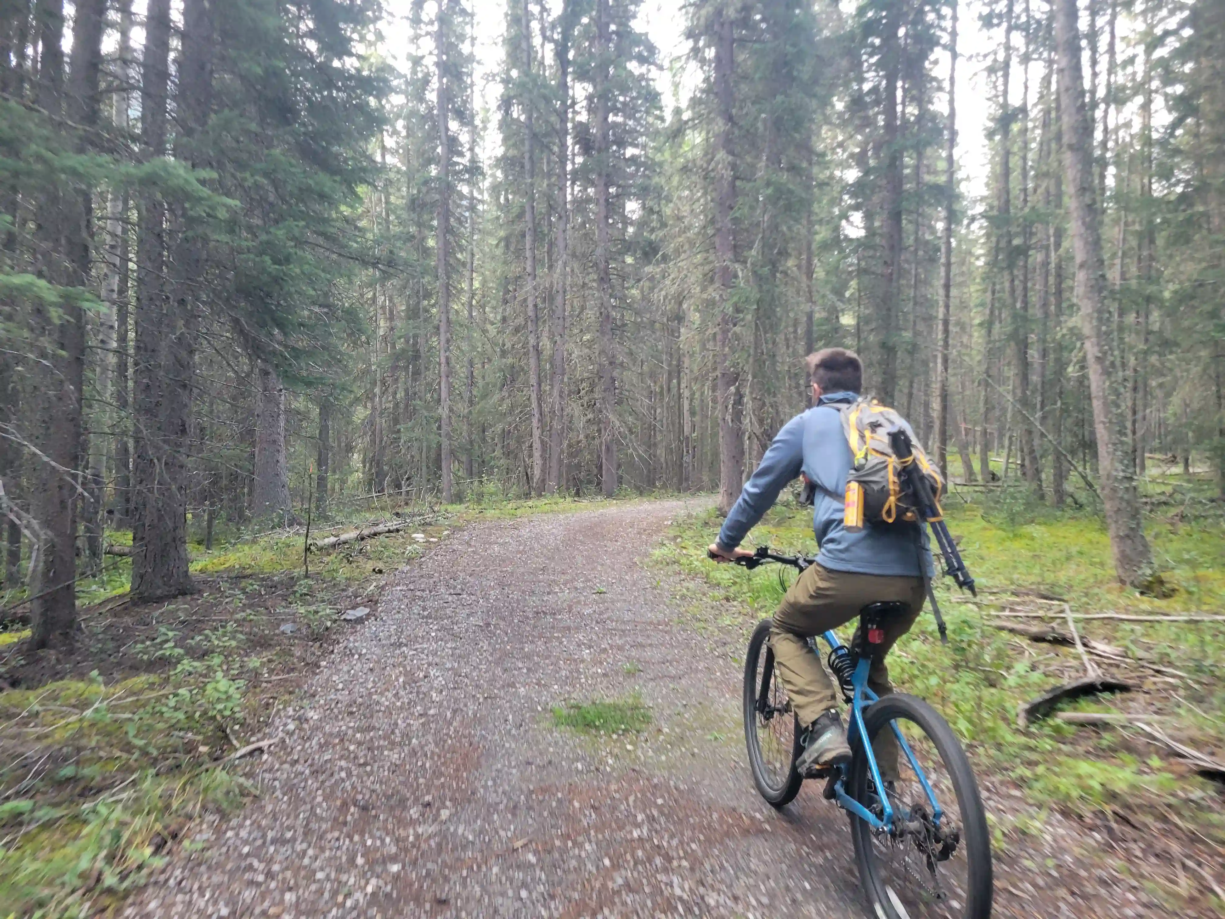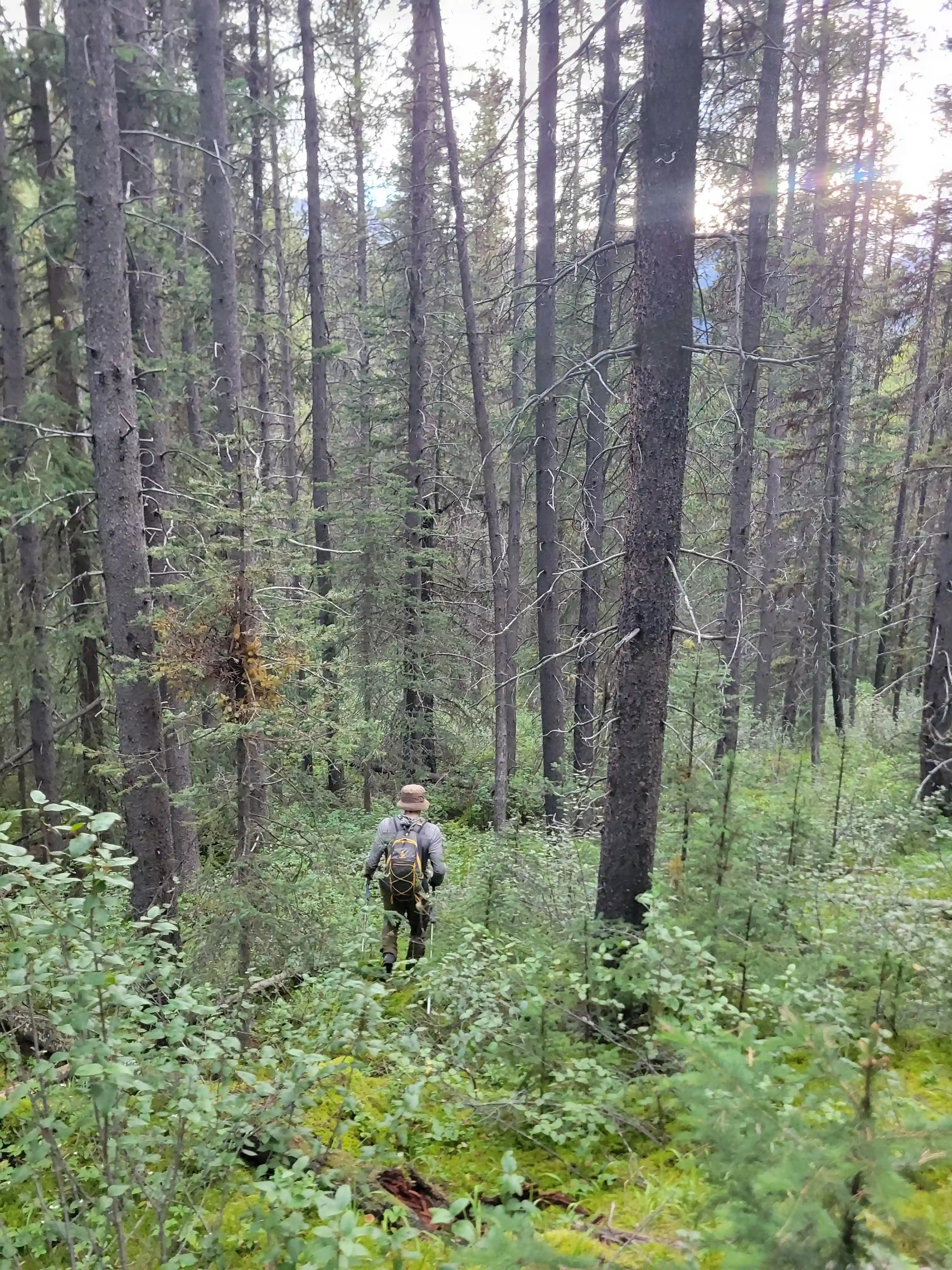 The true crux of the exit for Sundance Peak was probably the getting back to Brewster Creek Trail section. Devan and I were hoping that we could just follow the drainage below the peak back to valley bottom but the mountain had other ideas and we ran into a number of cliffy features as we descended and eventually were convinced it would get worse so we had to do a tedious amount of sidehilling north to get out of the guts of the drainage and finish the descent with some bushwhacking before we regained the trail. Once back on the trail the long plod out began and we were especially annoyed with the horse trail by this point. We had about 15km to cover including the biking section and the nasty state of the trail definitely didn't help to speed things up. We ended up reaching the bikes by around 8pm which wasn't the best sign, and despite our best efforts we got benighted during our bike out and ended up walking the last kilometer or two before reaching the lot.
