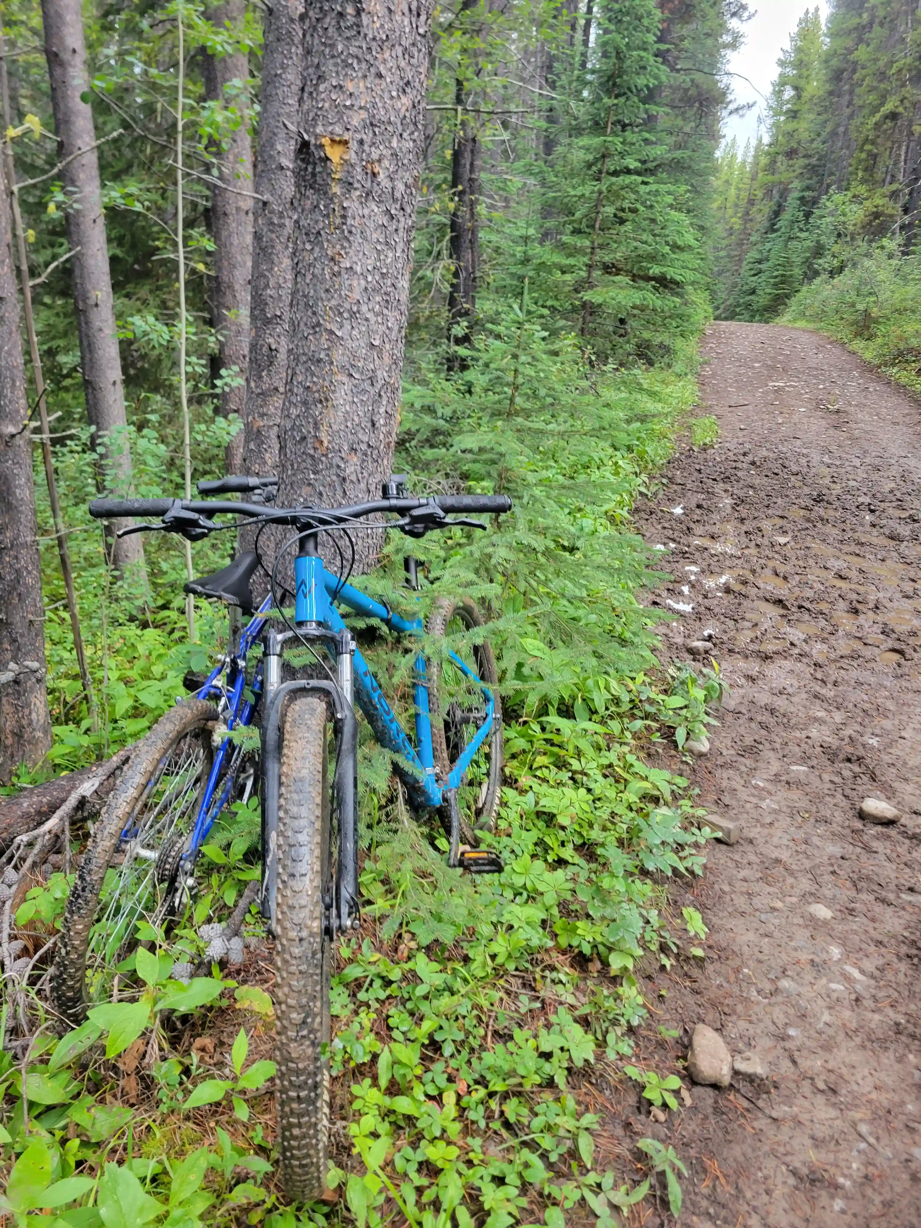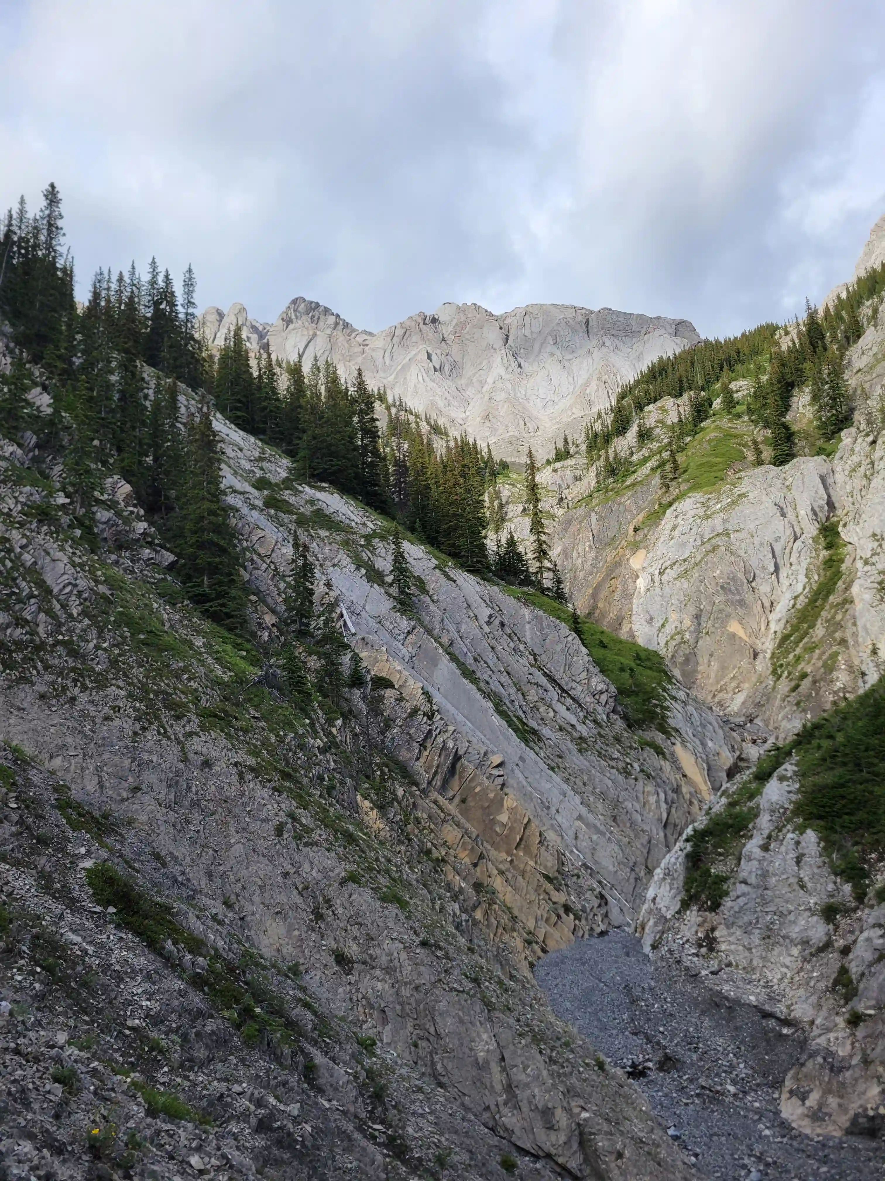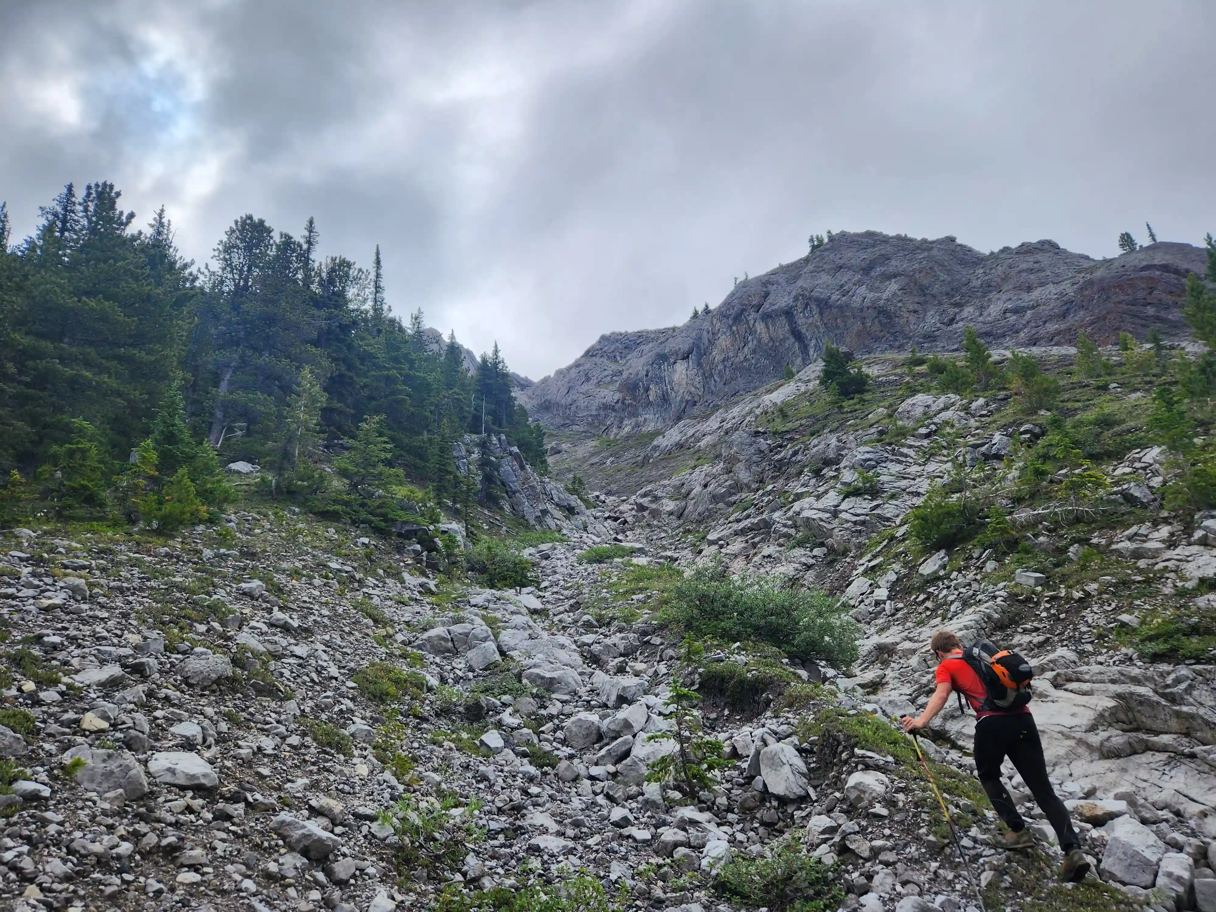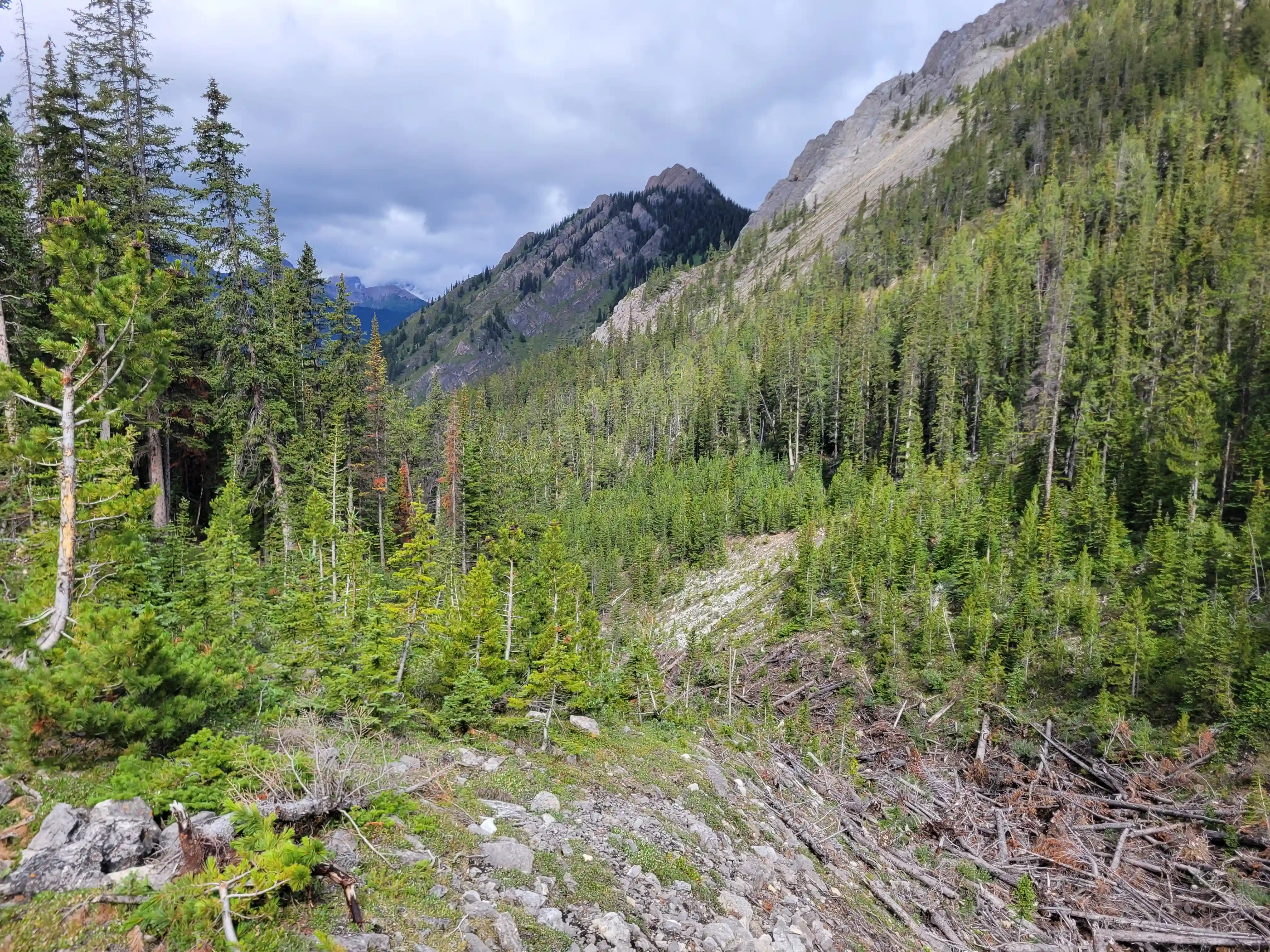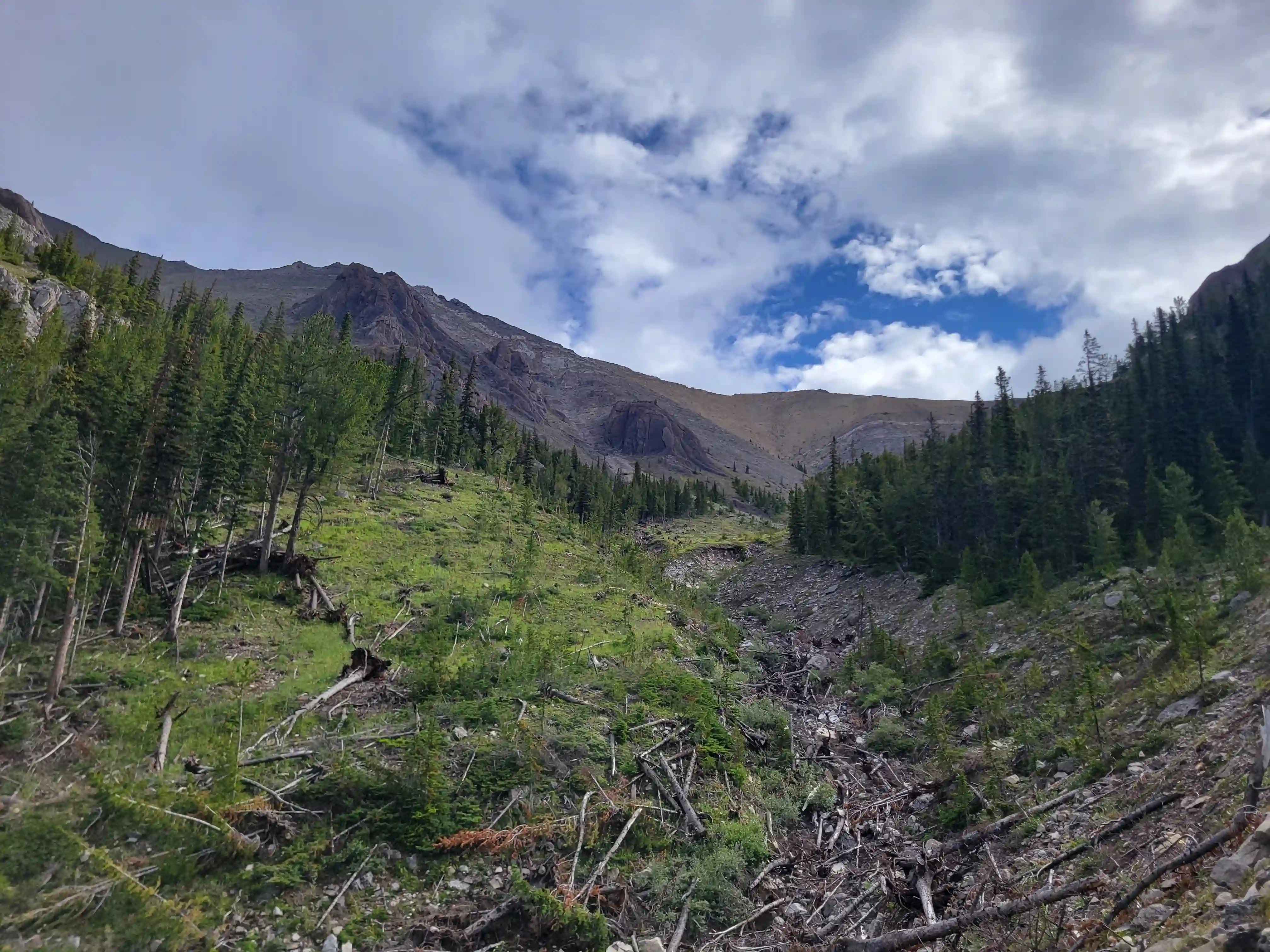 Devan had a gpx for someone that had gone for one of the lower peaks along the Sundance ridge and they had gone up the Brewster Creek Trail for a number of kilometers before heading up the mountain aiming for the ridge. As a result we decided to go for a similar strategy and started the day off on biked headed up the trail. It didn't take us long to put two and two together that this trail was primarily a horse trail and just after a few minutes of biking conditions went from bad to worse as we had to frequently avoid rutted out and muddy / horse crap sections. After around 7km we gave up on biking given how much we were having to hop off the bikes to avoid the nasty sections and we walked the remainder of the way before finding a scree drainage that looked good for ascending and started up towards the ridge there around 9-10km in.
