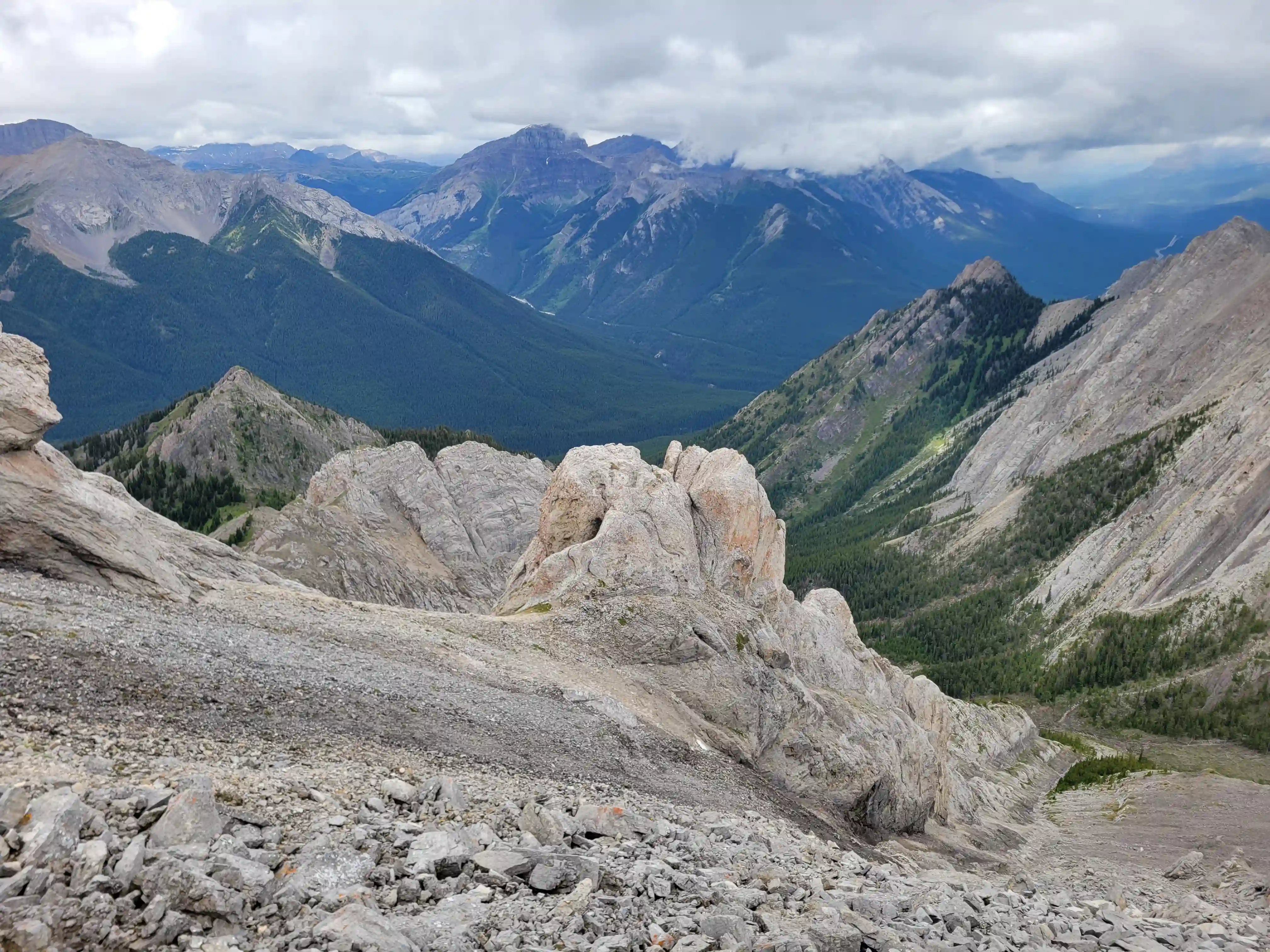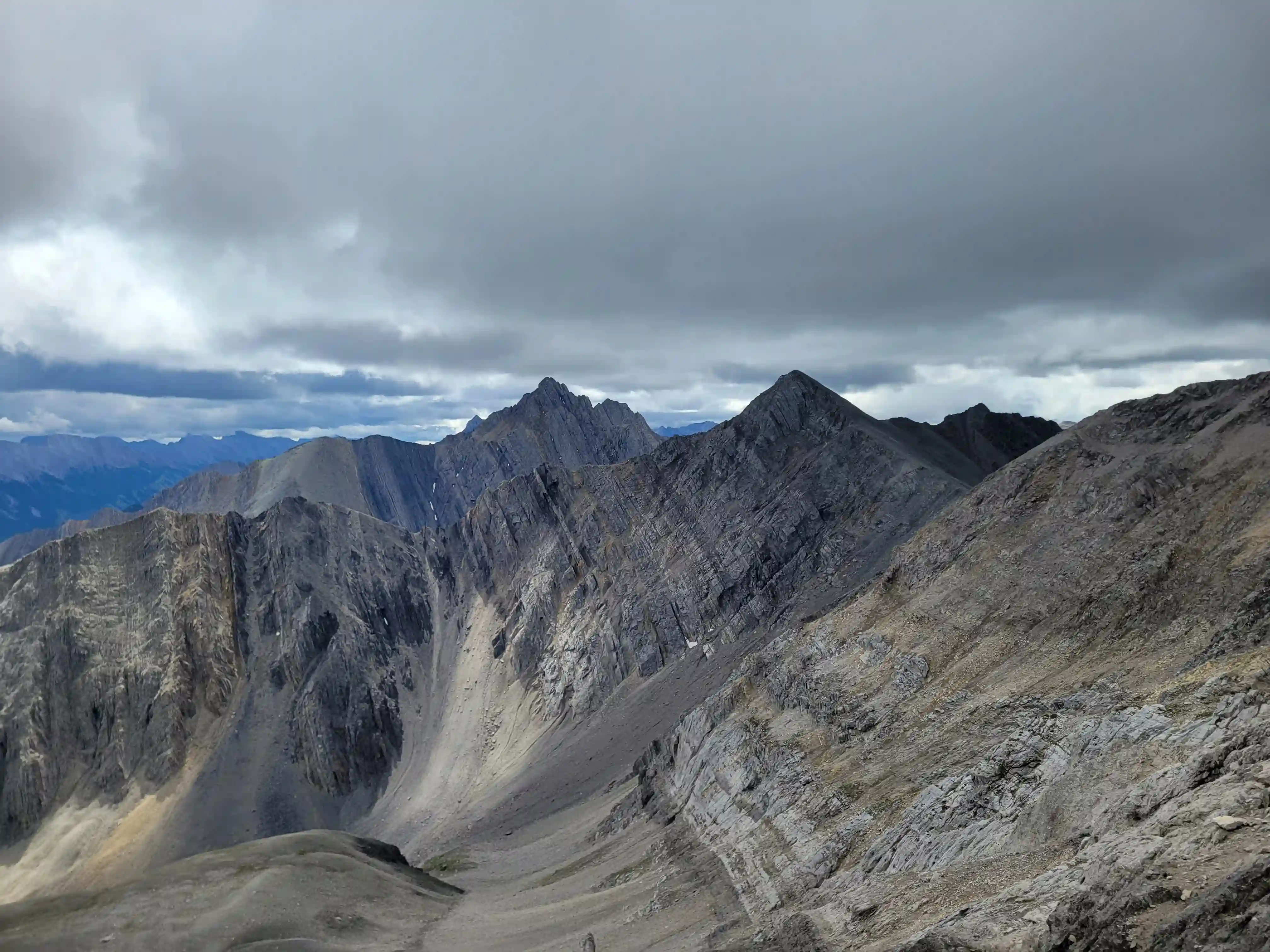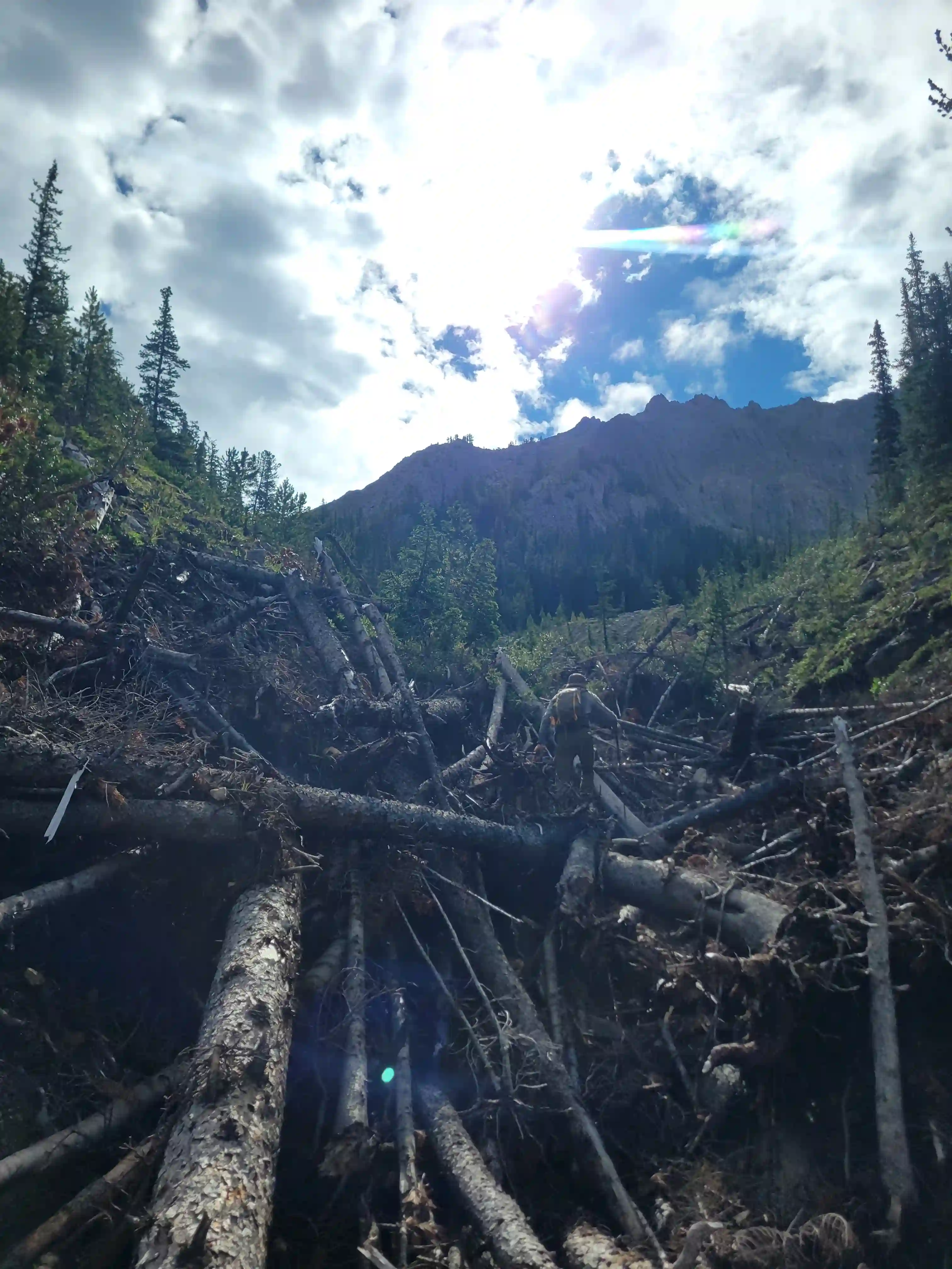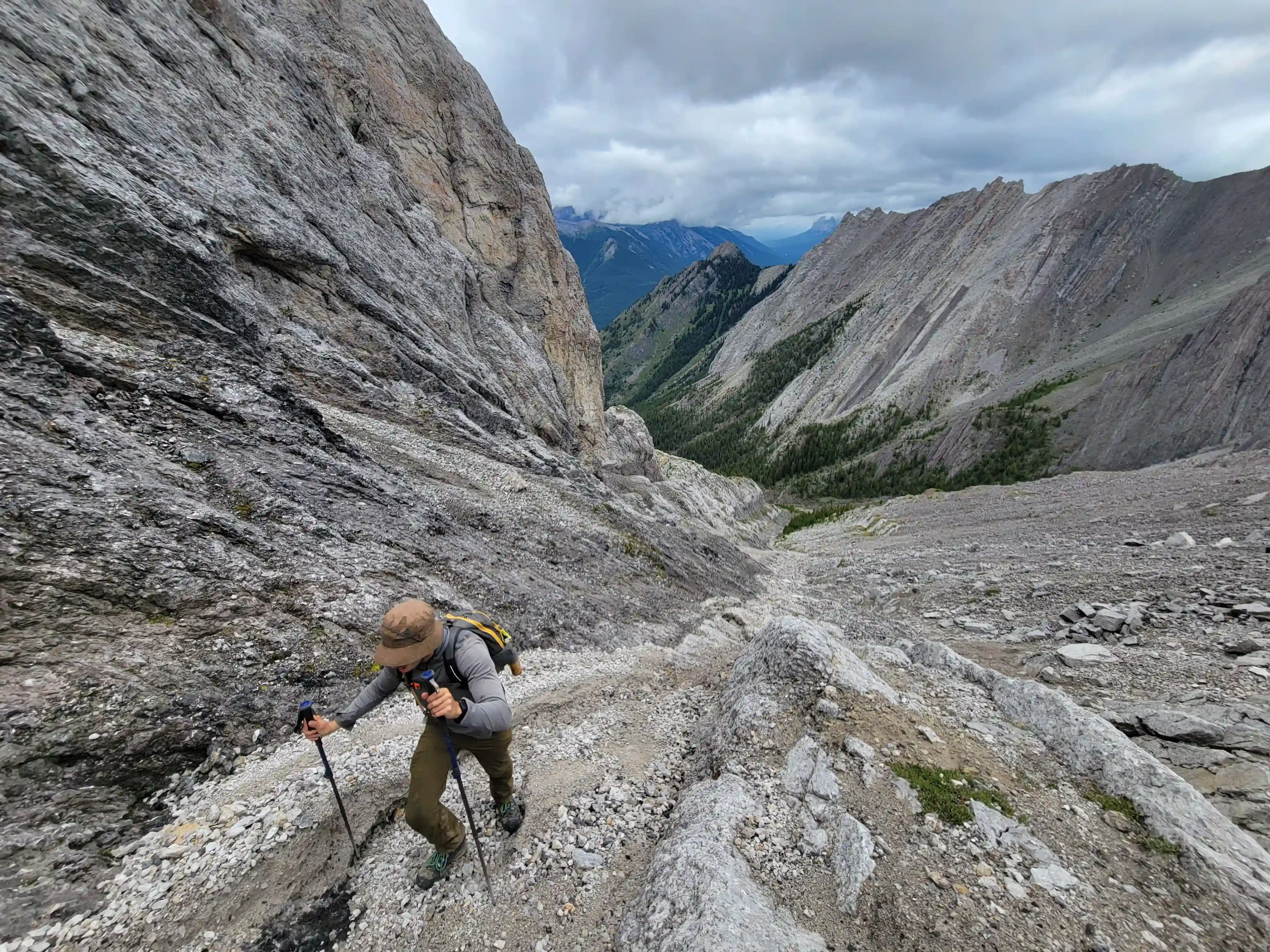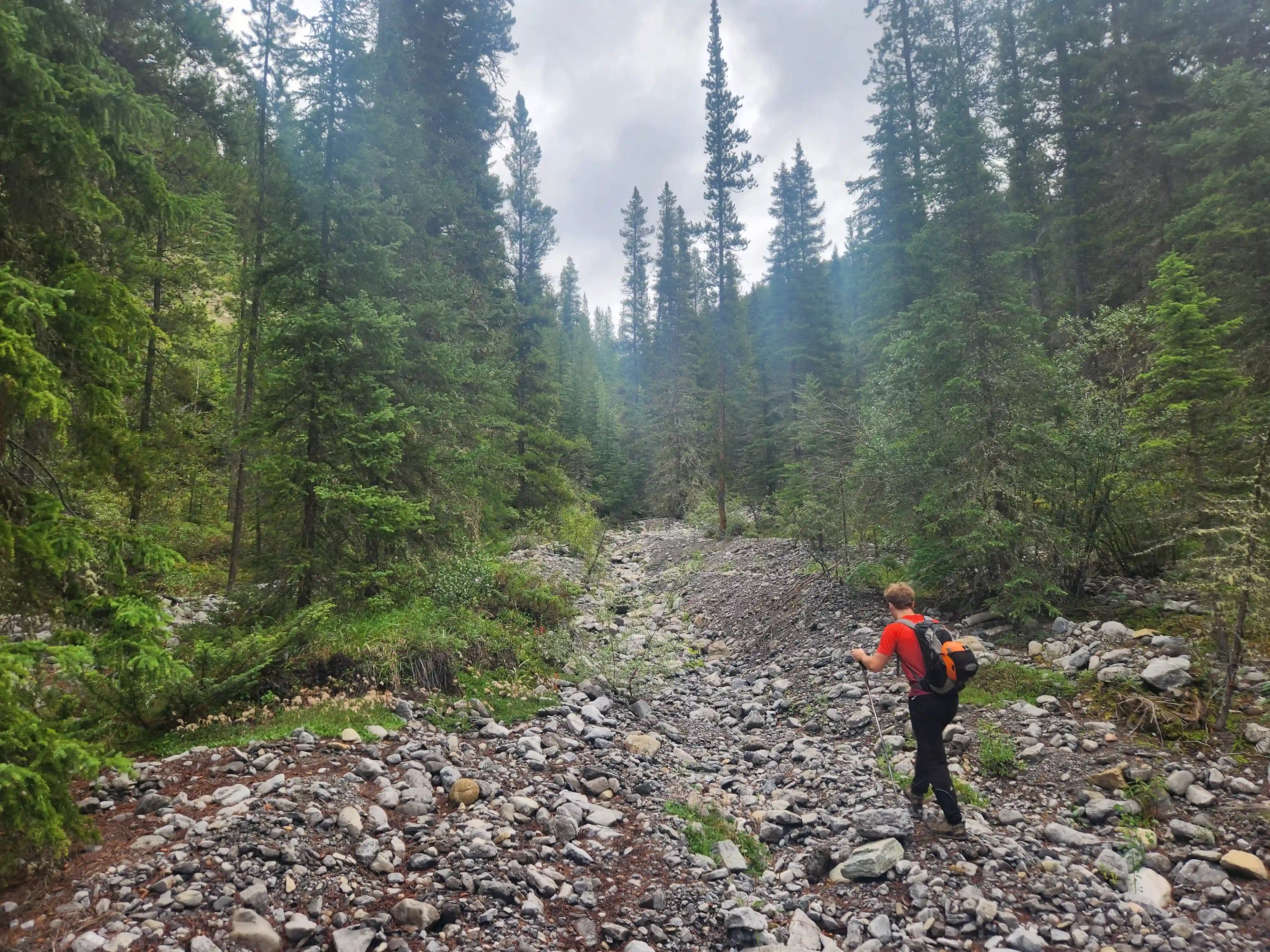 Devan had a gpx for someone that had gone for one of the lower peaks along the Sundance ridge and they had gone up the Brewster Creek Trail for a number of kilometers before heading up the mountain aiming for the ridge. As a result we decided to go for a similar strategy and started the day off on biked headed up the trail. It didn't take us long to put two and two together that this trail was primarily a horse trail and just after a few minutes of biking conditions went from bad to worse as we had to frequently avoid rutted out and muddy / horse crap sections. After around 7km we gave up on biking given how much we were having to hop off the bikes to avoid the nasty sections and we walked the remainder of the way before finding a scree drainage that looked good for ascending and started up towards the ridge there around 9-10km in.