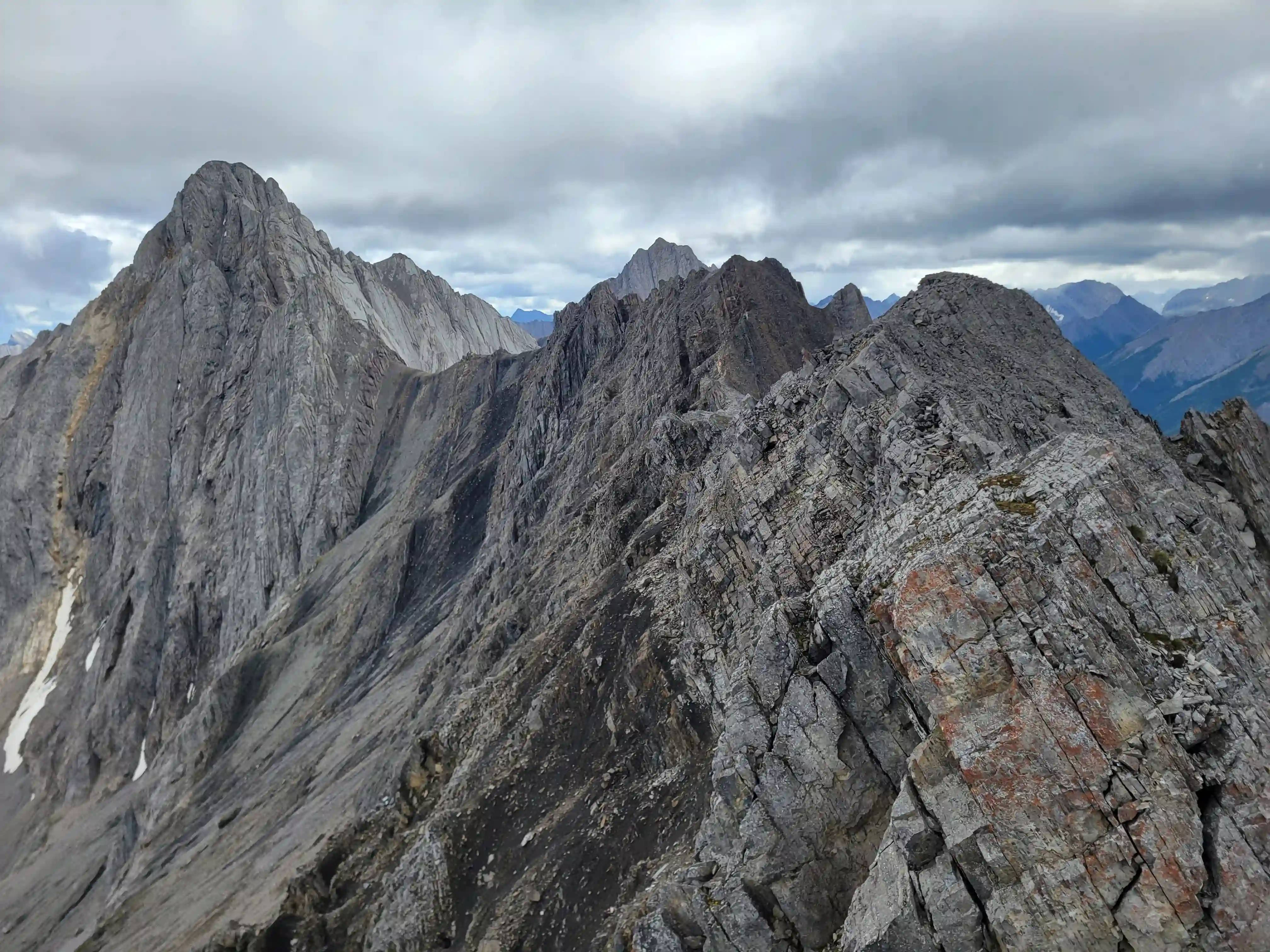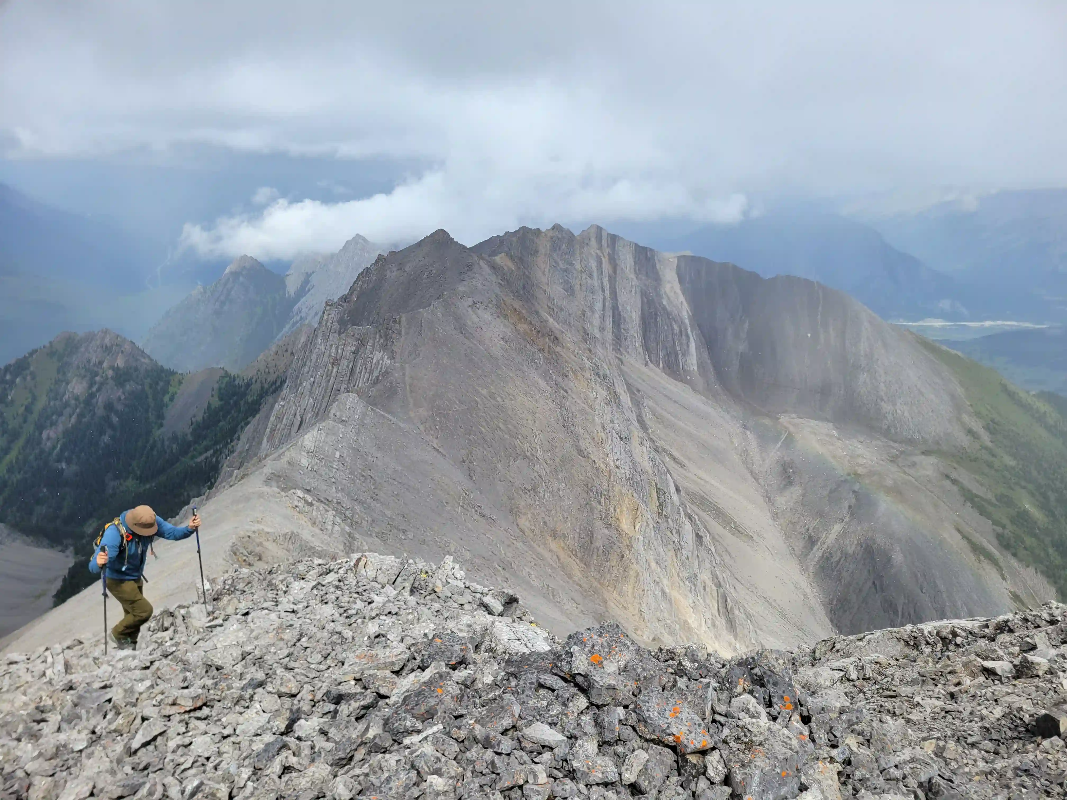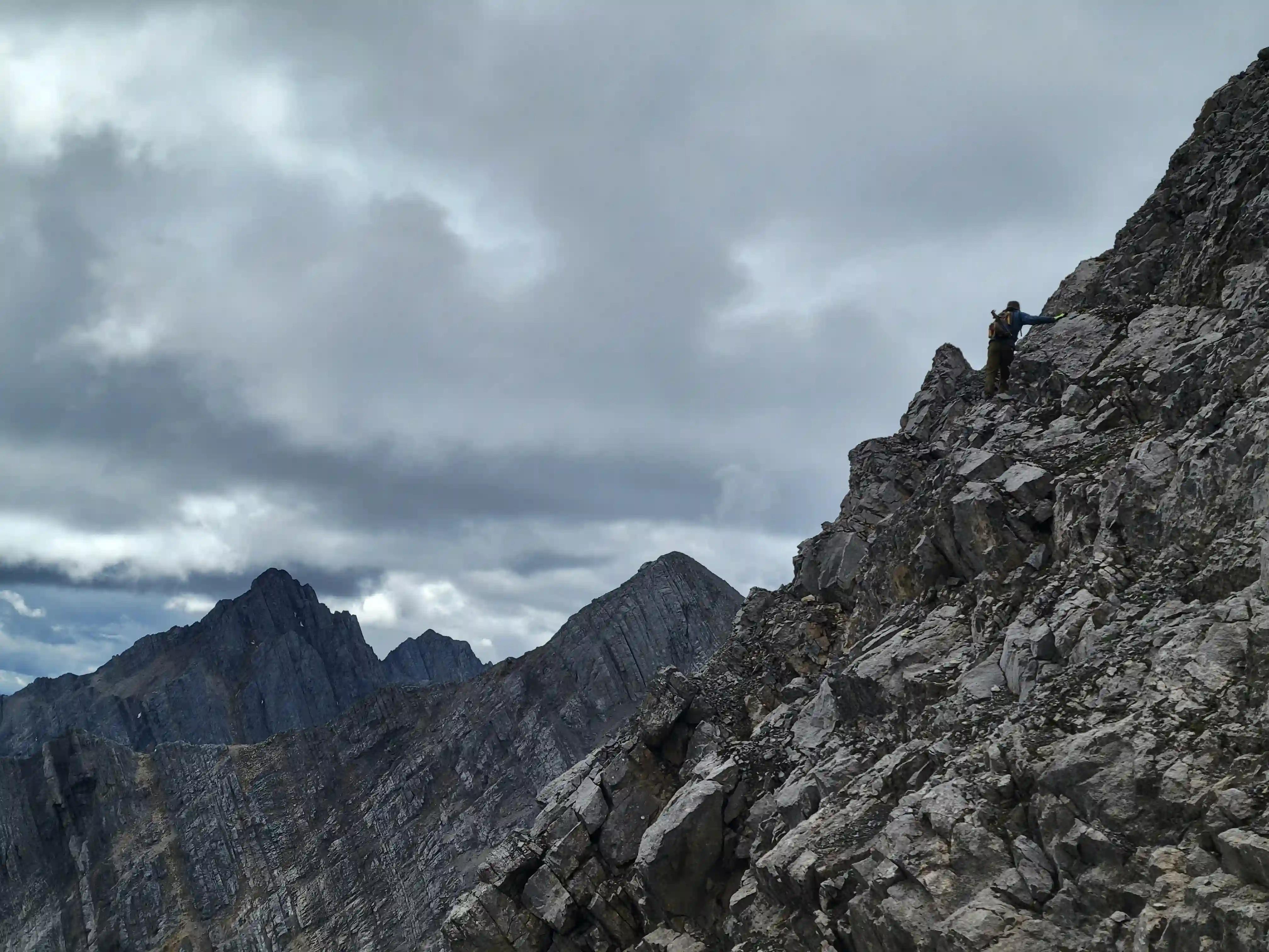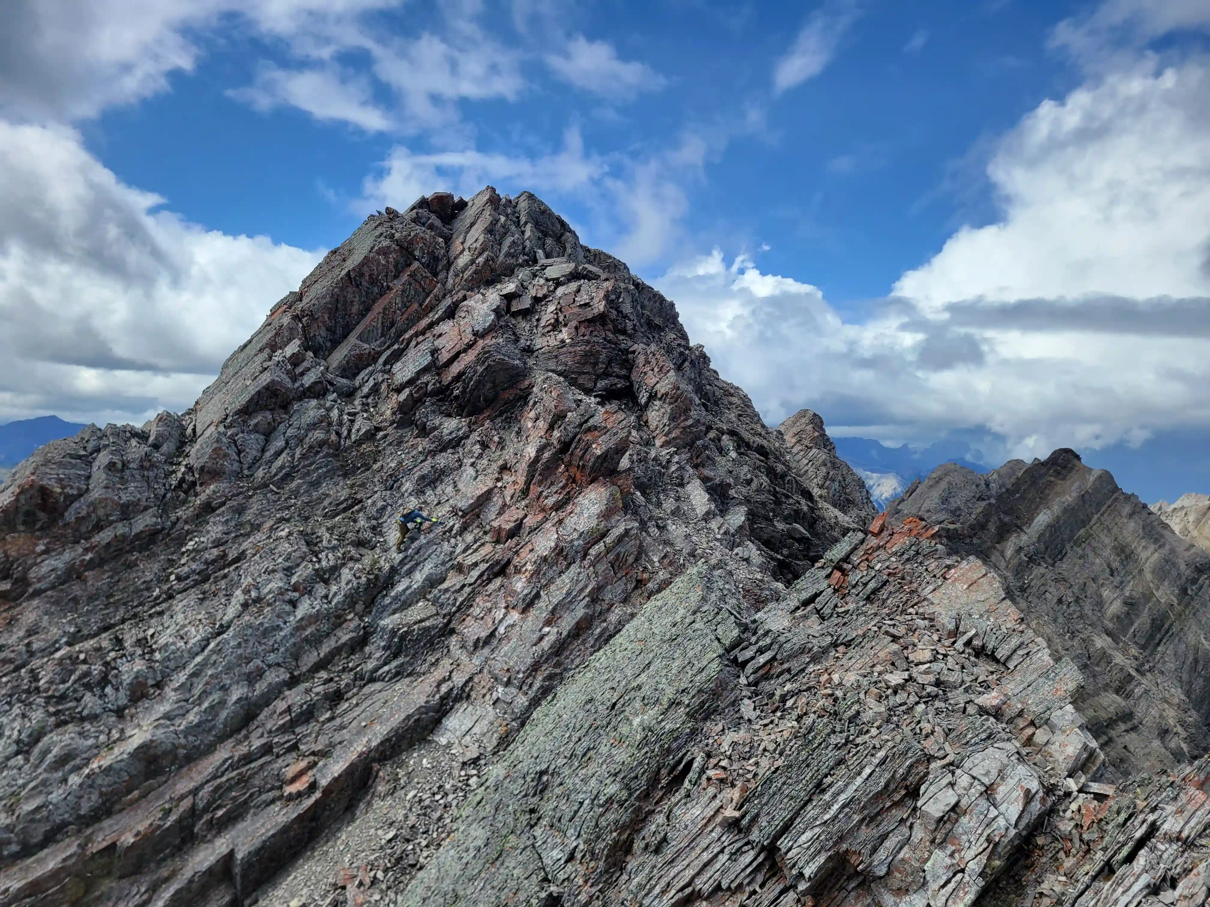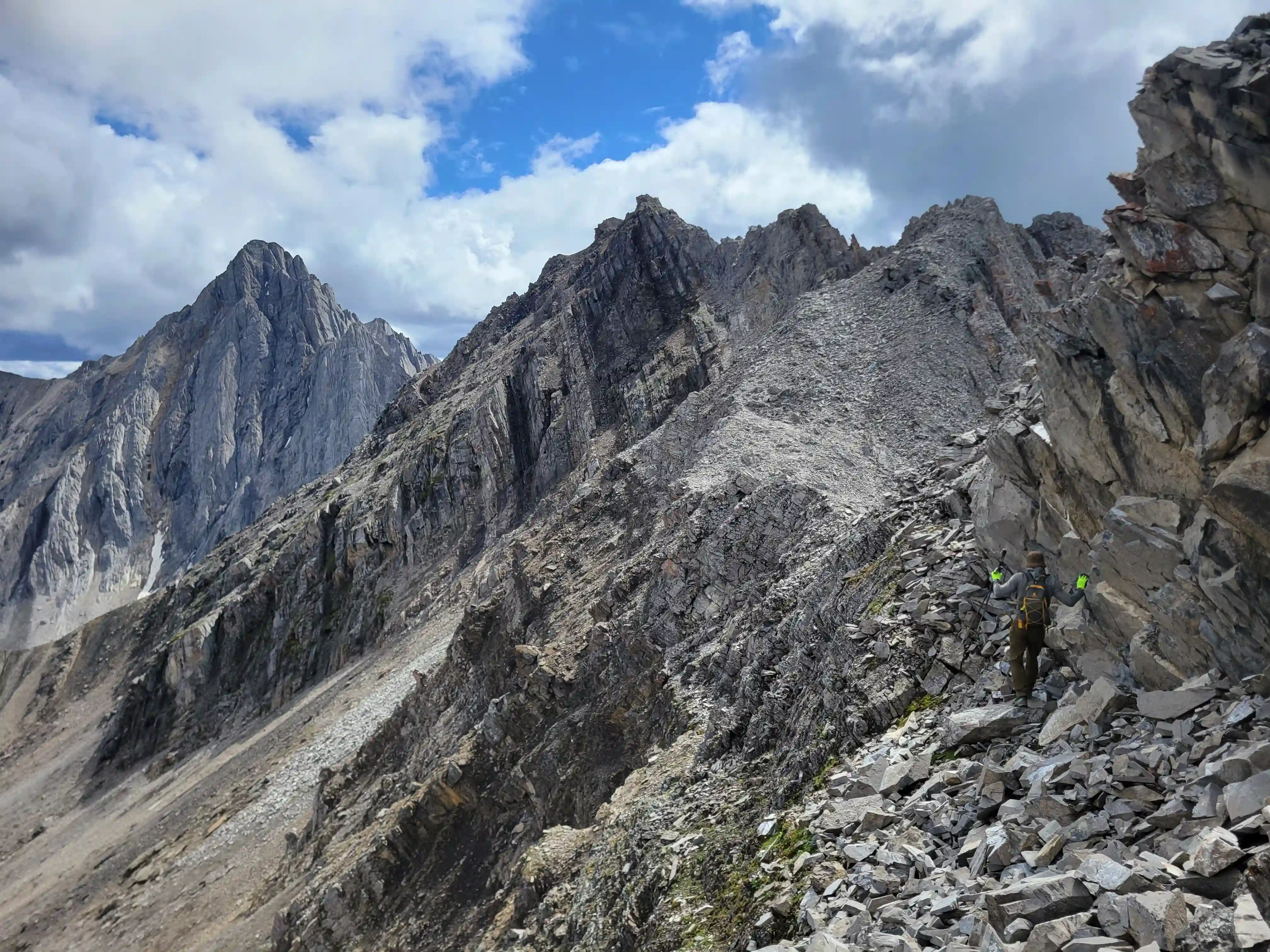 Our ascent line followed an obvious drainage until we reached a section with nasty deadfall and from there we deviated to slopes on the right of it until we found a line that looked like it would take us all the way to the ridge. Not long after we were on the ridge and could see the upcoming ridge and pekas that would be the next section of our day. The ridge started off relatively tame with a few bypasses making things a lot easier but once we got past our first high point of the day things got more technical. Following the first peak we had one 5th class downclimb before more technical ridge followed which wasn't too difficult with some detouring from side to side. Once we had gotten properly close to Sundance Peak however things got a bit more complicated with a downclimb and a gully feature leading us around a difficulty that closed the final distance between us and our main objective for the day!
