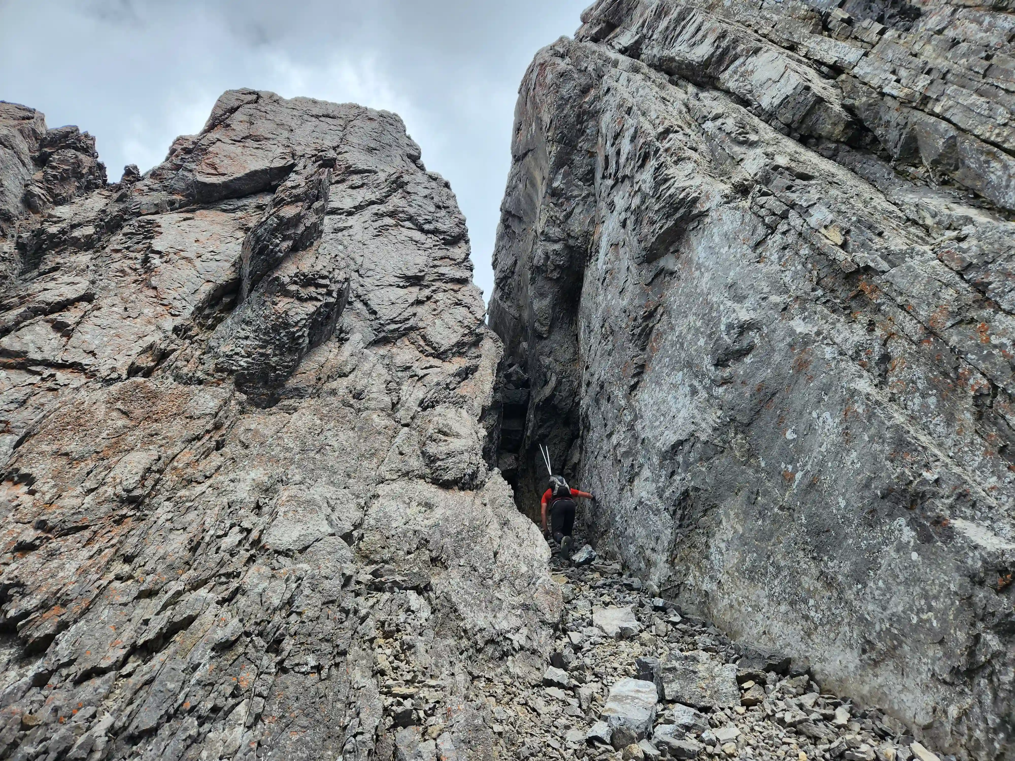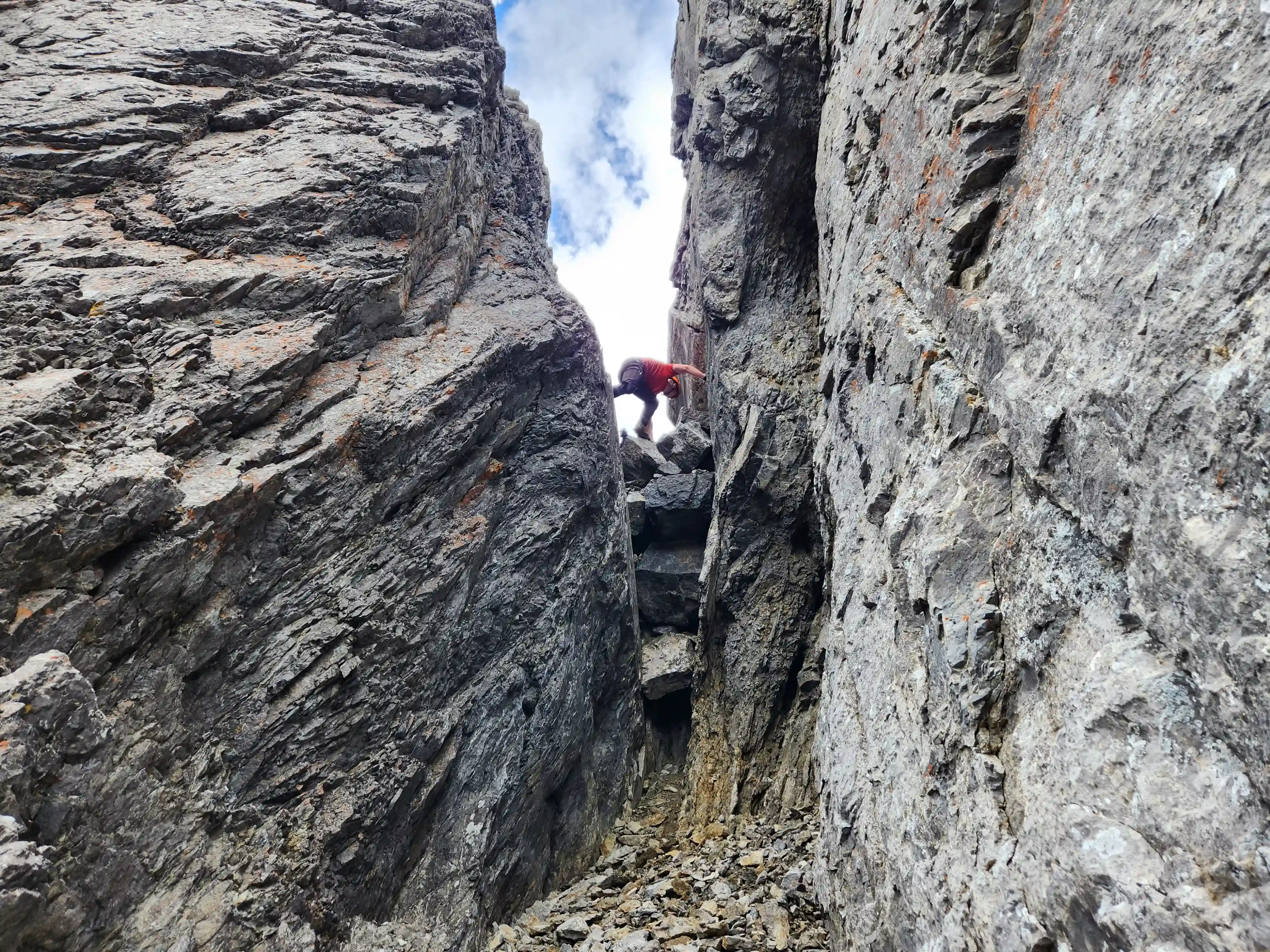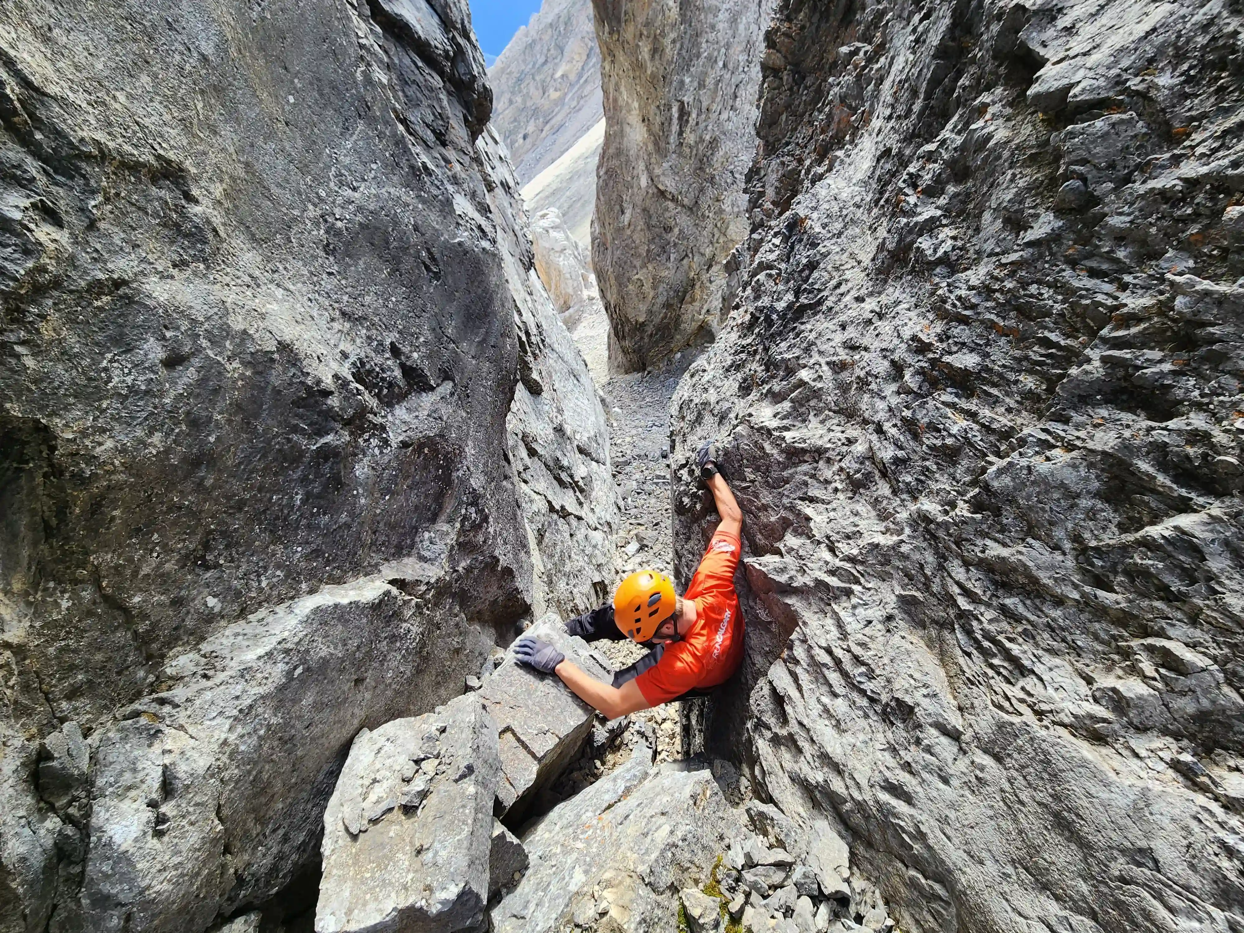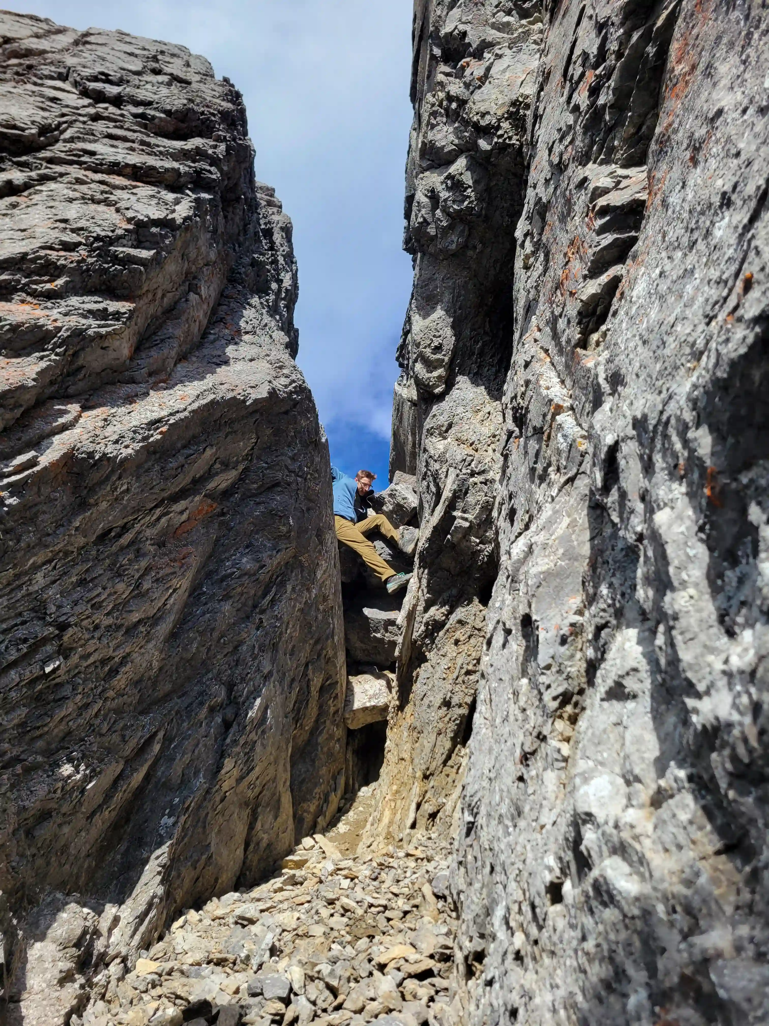 Once we got closer to the slabby face of Sundance a weakness looked like it could go although we weren't entirely sure if it would lead to a dead end but we didn't really have any other options so we decided to go for it. It started off as low 5th slabby moves until we reached a bit of a plateau where scree terrain resumed, then we followed it into a narrow gap between the mountain and a pinnacle and that's where things got interesting. The was another gap that lead to a low point between another pinnacle and the upper mountain with a chockstone in it but it looked decently technical and we weren't sure it would lead us anywhere. We did some looking around and once we were sure that we had no other options we decided to check it out as it was either that gap would go or we'd have to turn around and thankfully it ended up being the key to our route's success!