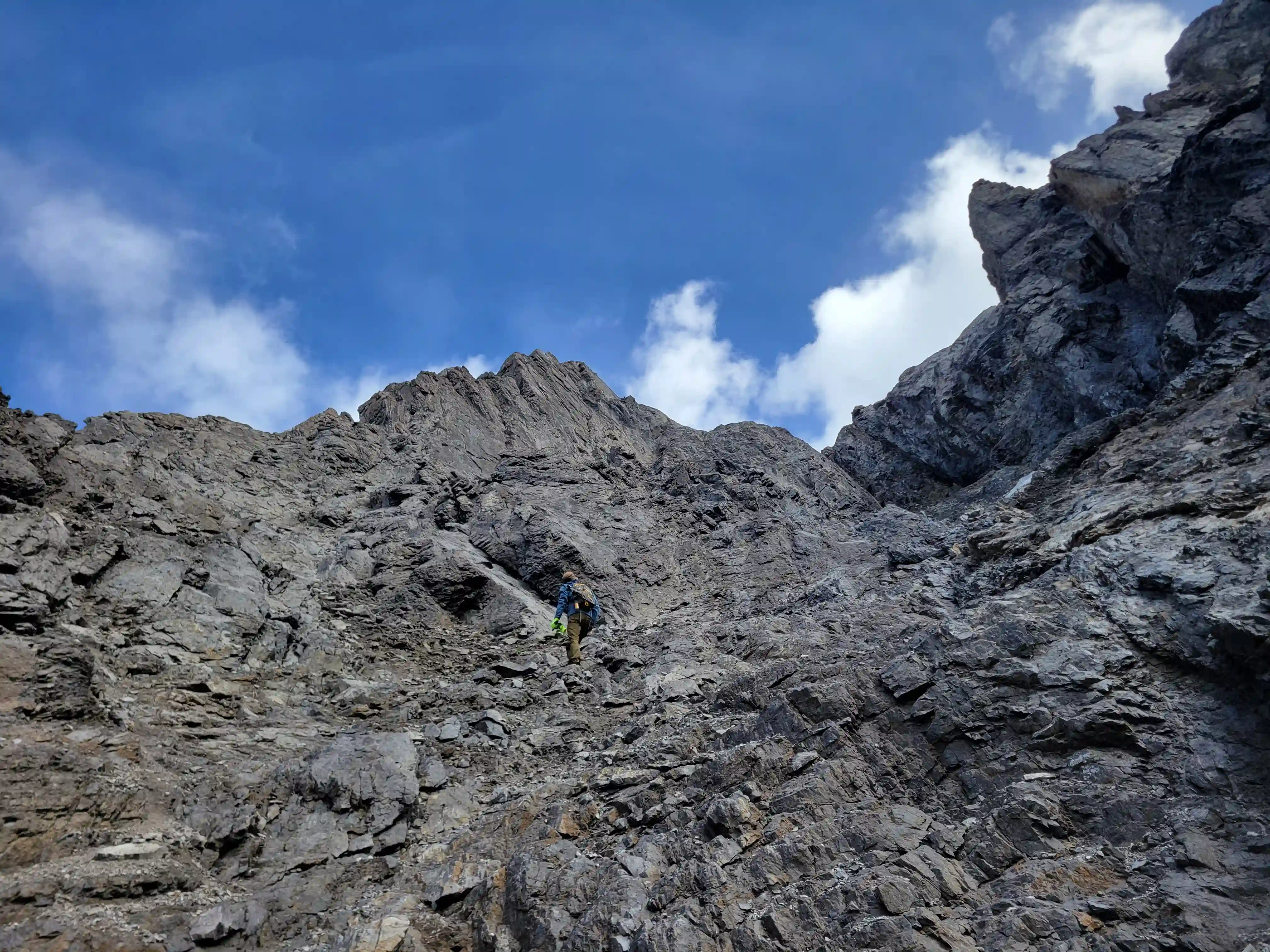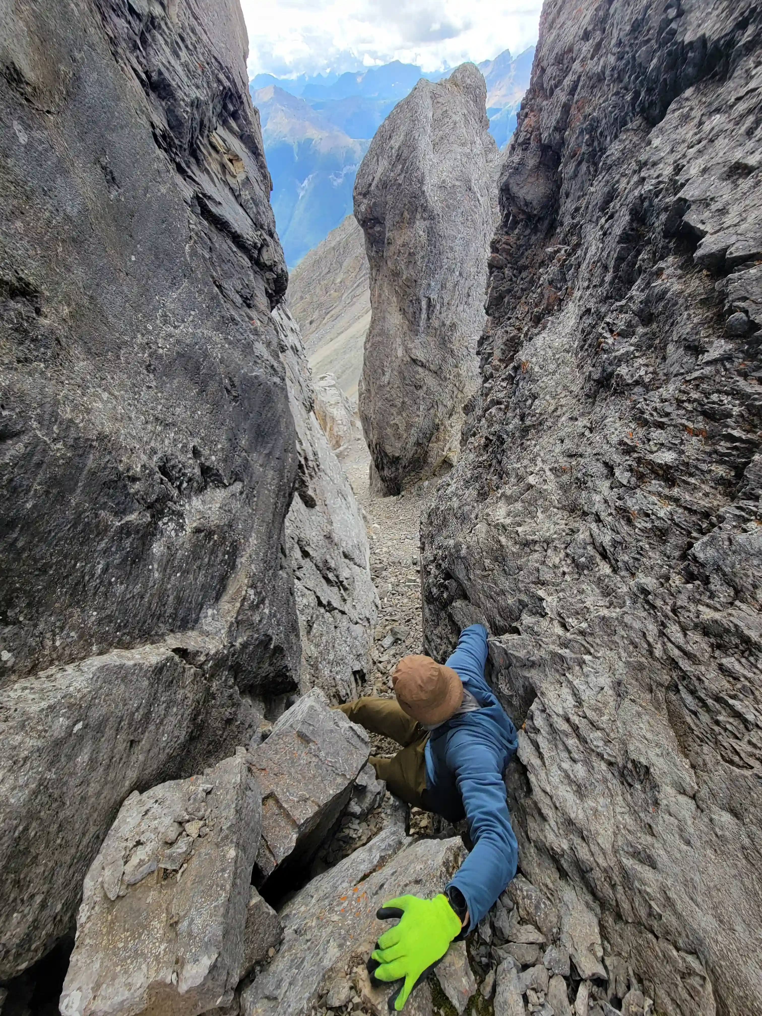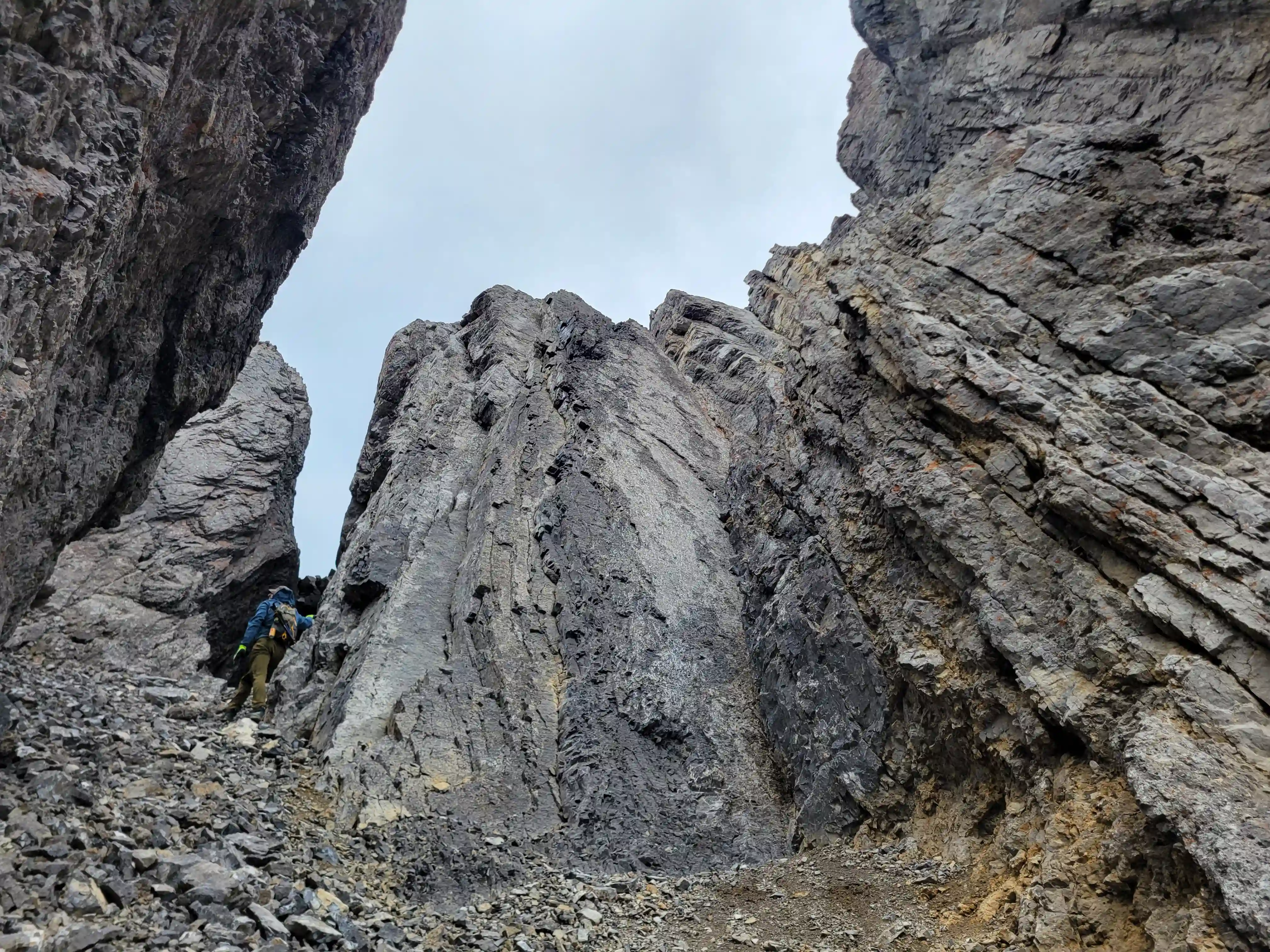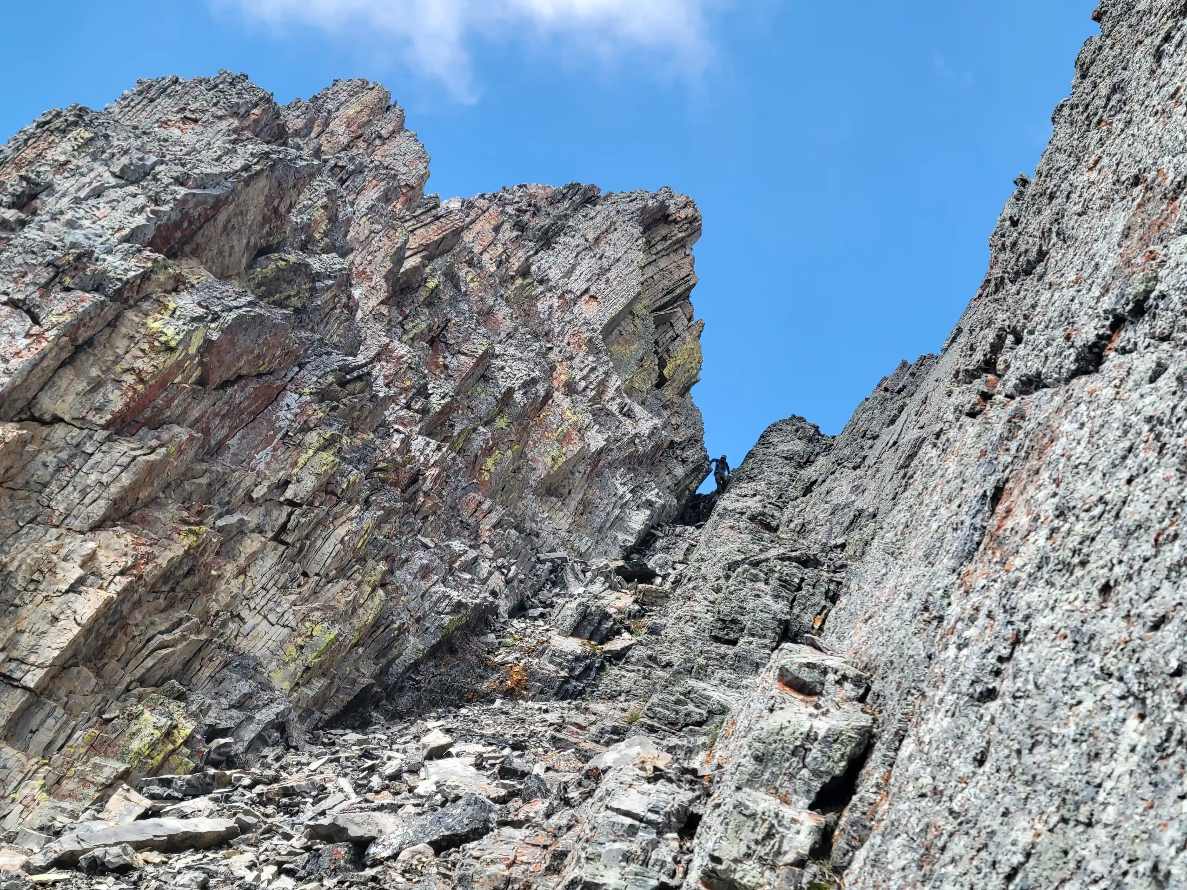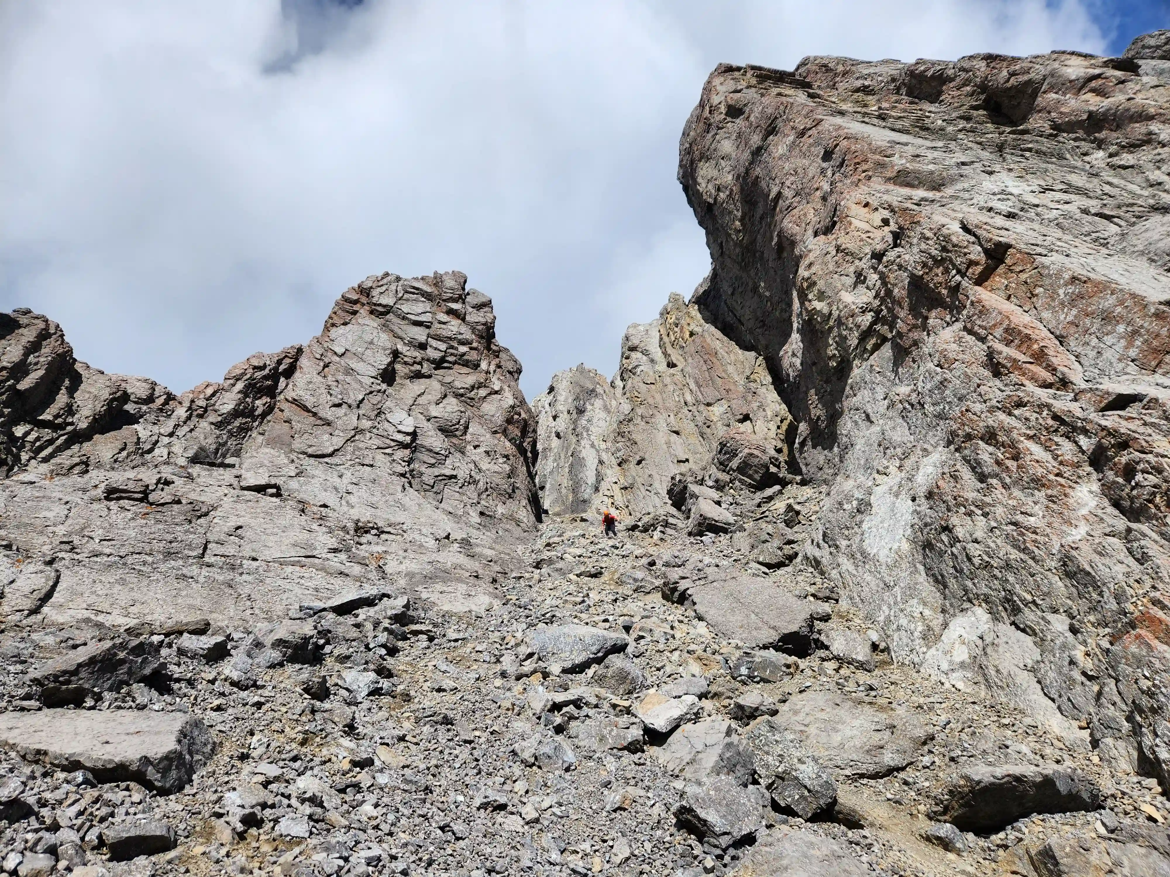 Once we got closer to the slabby face of Sundance a weakness looked like it could go although we weren't entirely sure if it would lead to a dead end but we didn't really have any other options so we decided to go for it. It started off as low 5th slabby moves until we reached a bit of a plateau where scree terrain resumed, then we followed it into a narrow gap between the mountain and a pinnacle and that's where things got interesting. The was another gap that lead to a low point between another pinnacle and the upper mountain with a chockstone in it but it looked decently technical and we weren't sure it would lead us anywhere. We did some looking around and once we were sure that we had no other options we decided to check it out as it was either that gap would go or we'd have to turn around and thankfully it ended up being the key to our route's success!