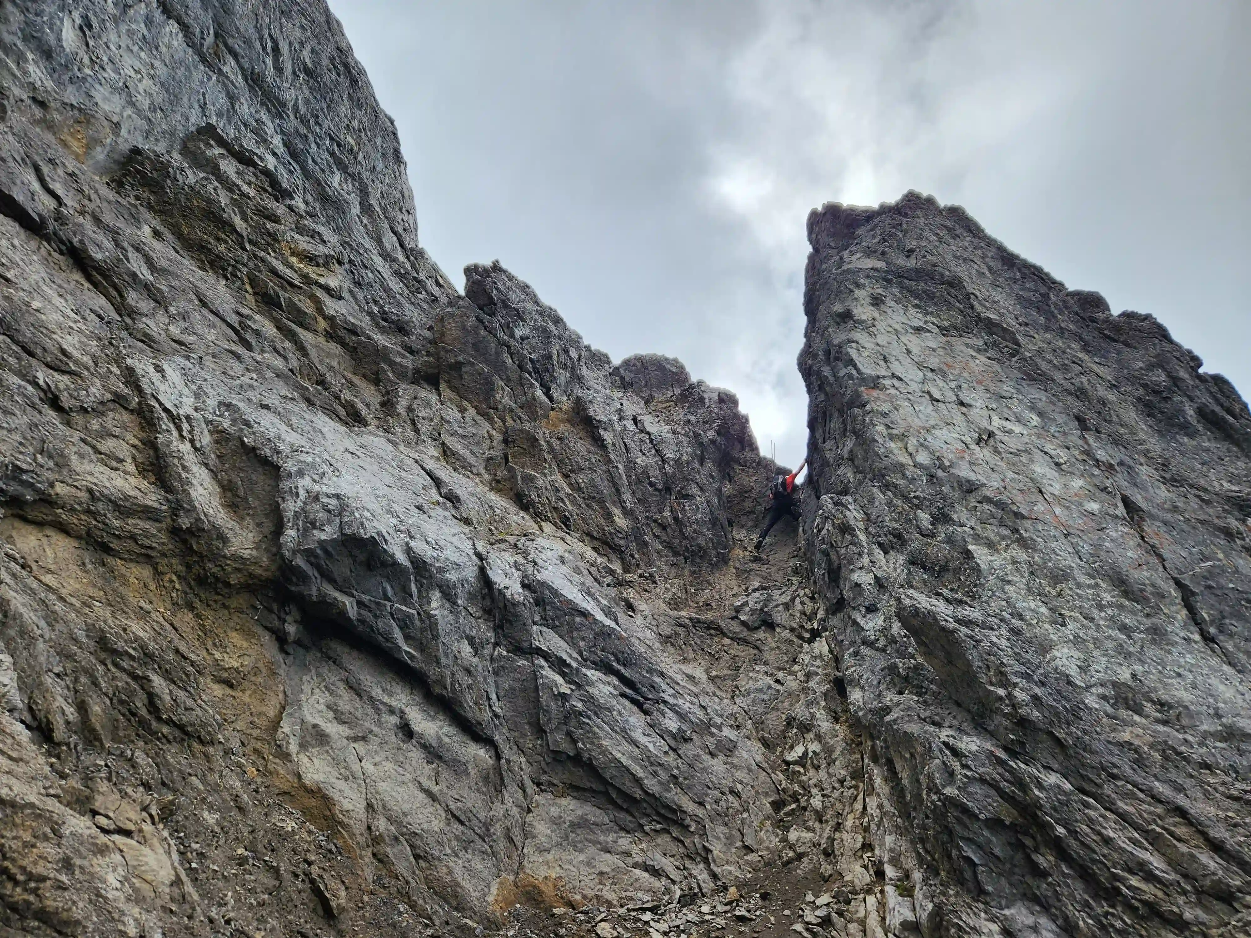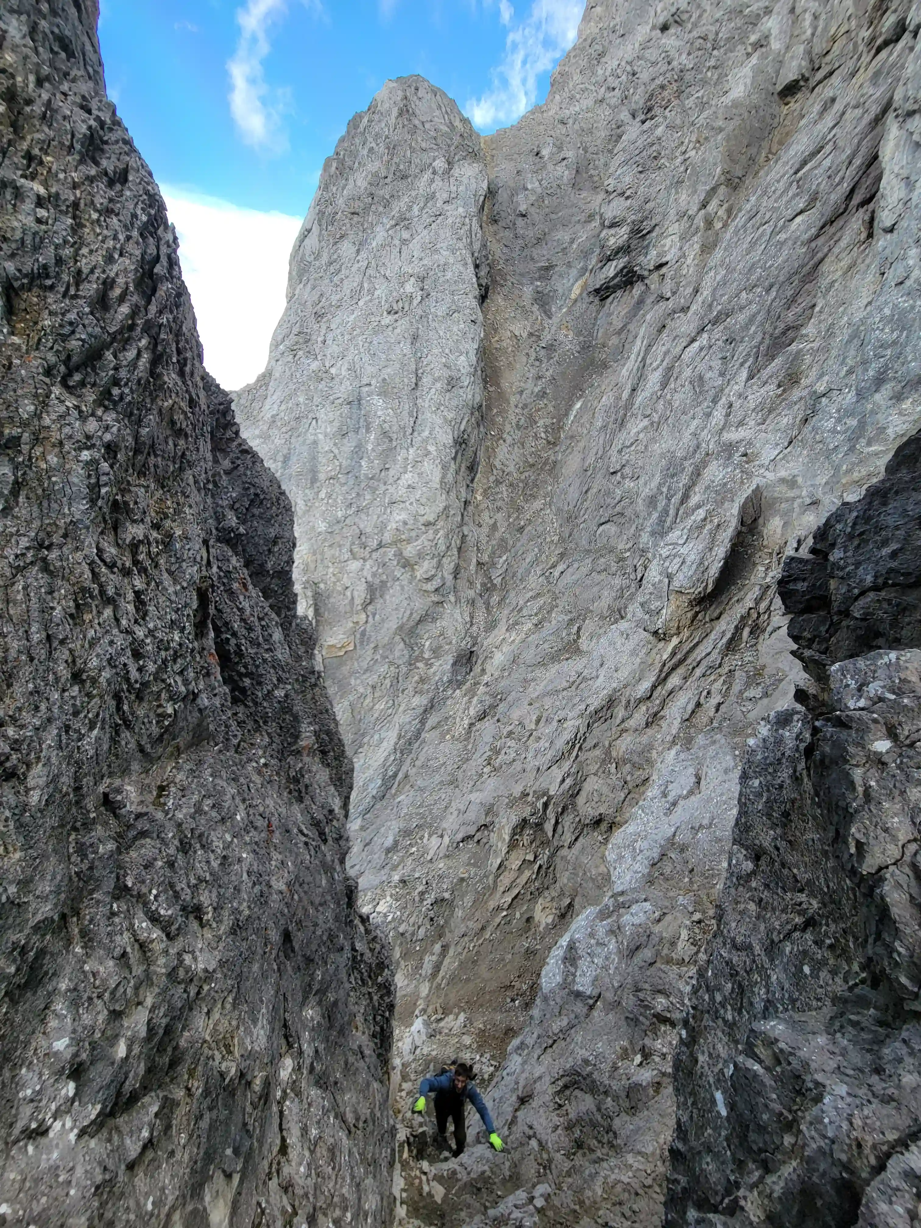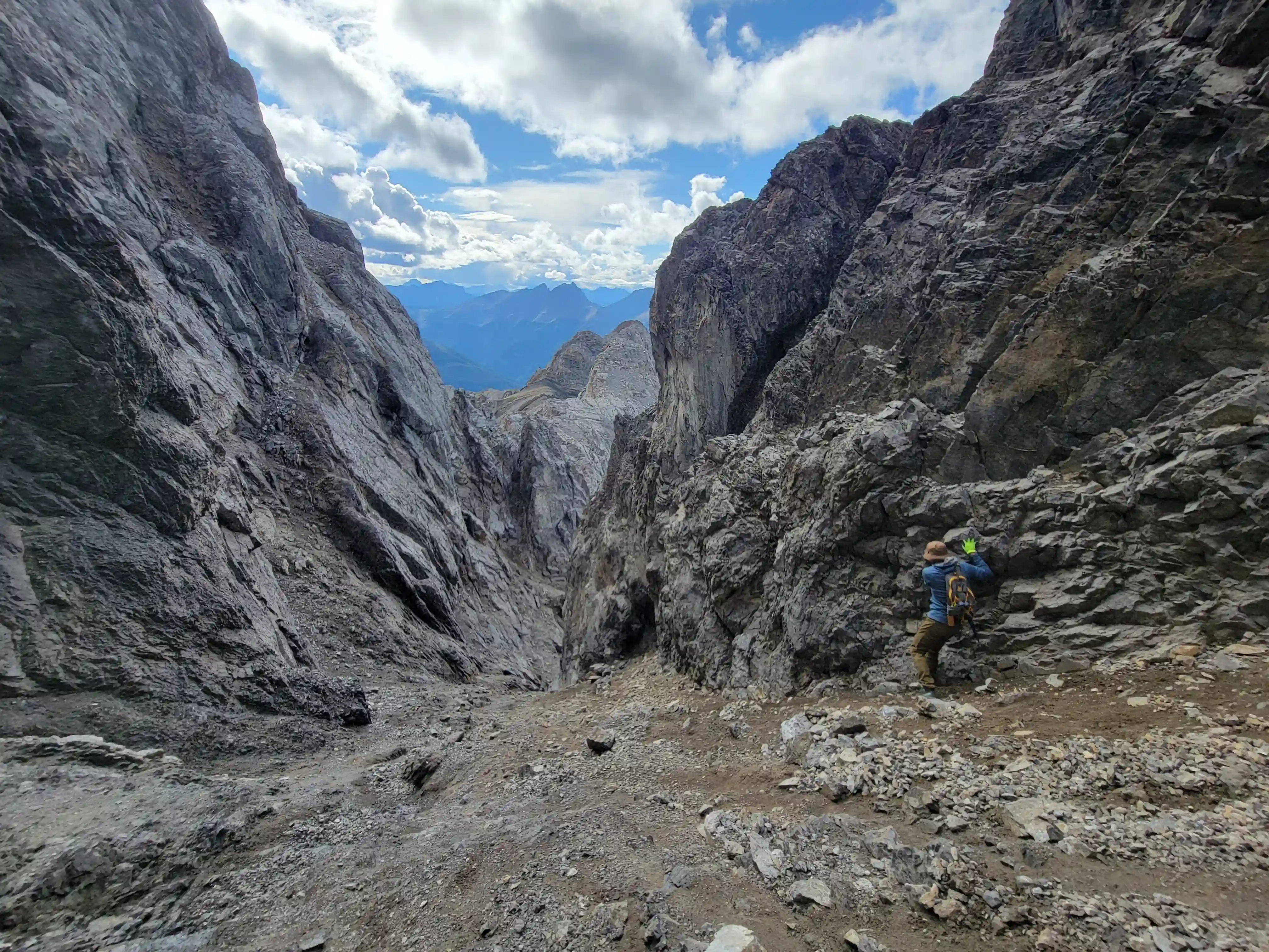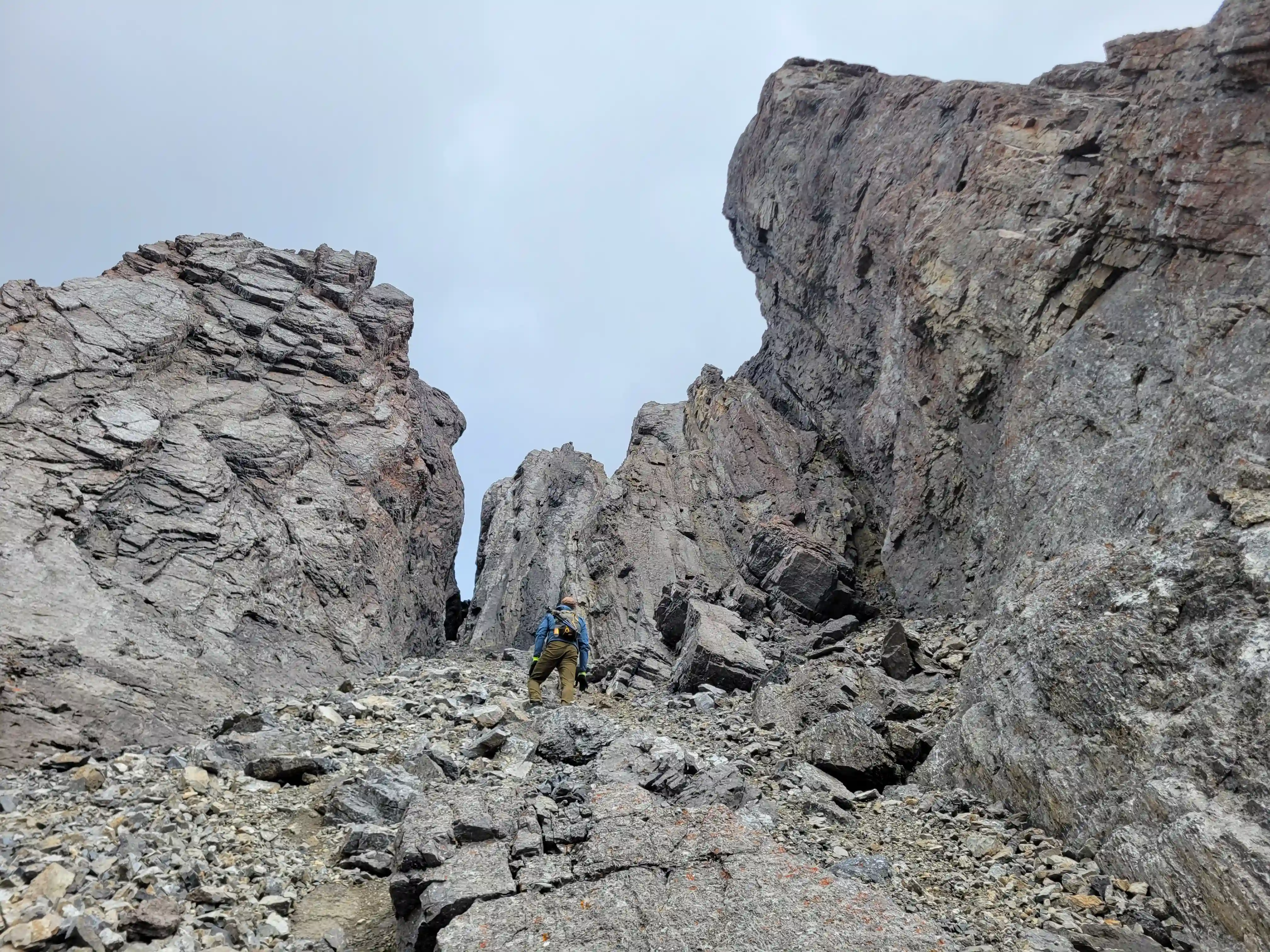 Once we got closer to the slabby face of Sundance a weakness looked like it could go although we weren't entirely sure if it would lead to a dead end but we didn't really have any other options so we decided to go for it. It started off as low 5th slabby moves until we reached a bit of a plateau where scree terrain resumed, then we followed it into a narrow gap between the mountain and a pinnacle and that's where things got interesting. The was another gap that lead to a low point between another pinnacle and the upper mountain with a chockstone in it but it looked decently technical and we weren't sure it would lead us anywhere. We did some looking around and once we were sure that we had no other options we decided to check it out as it was either that gap would go or we'd have to turn around and thankfully it ended up being the key to our route's success!