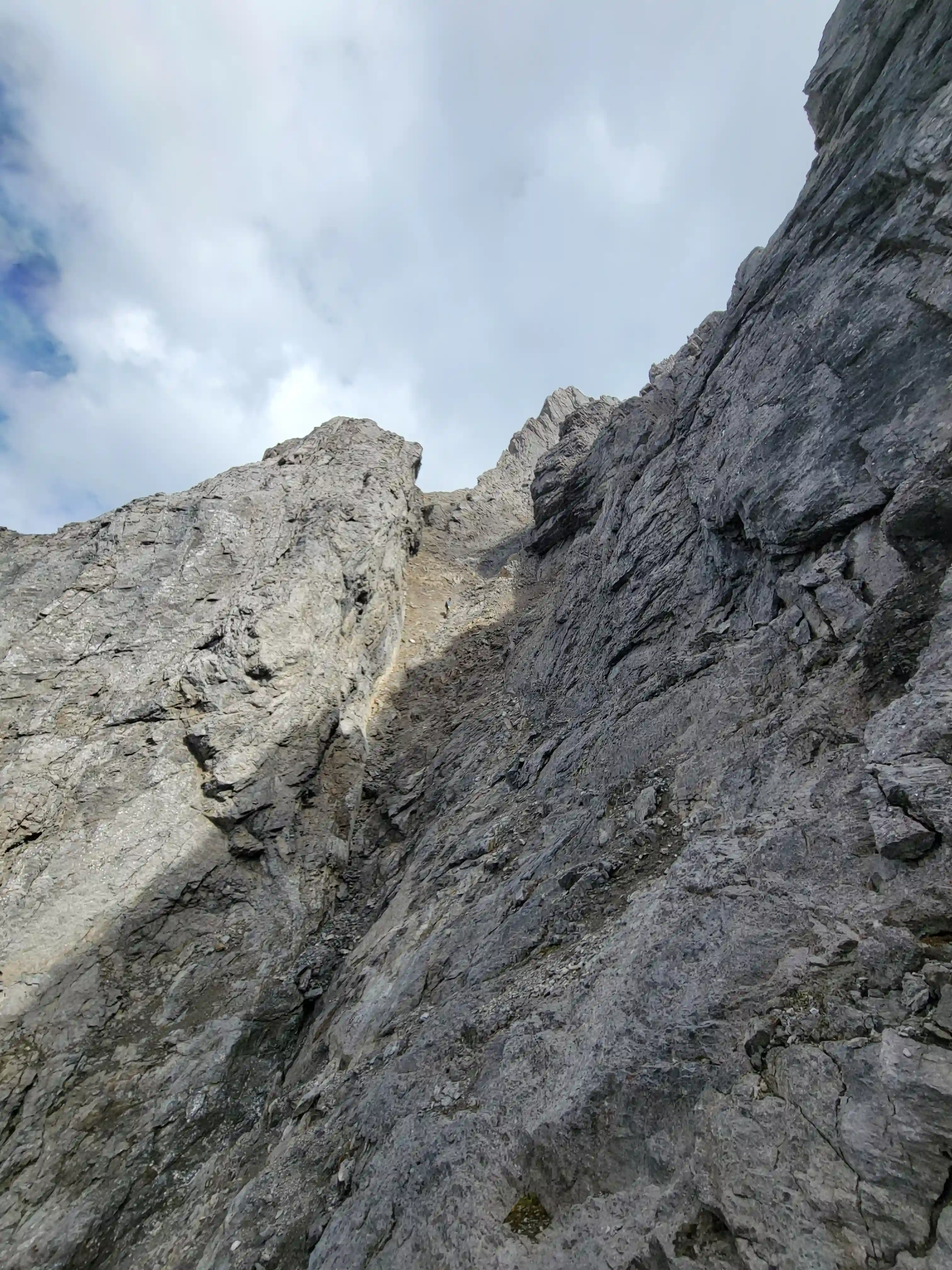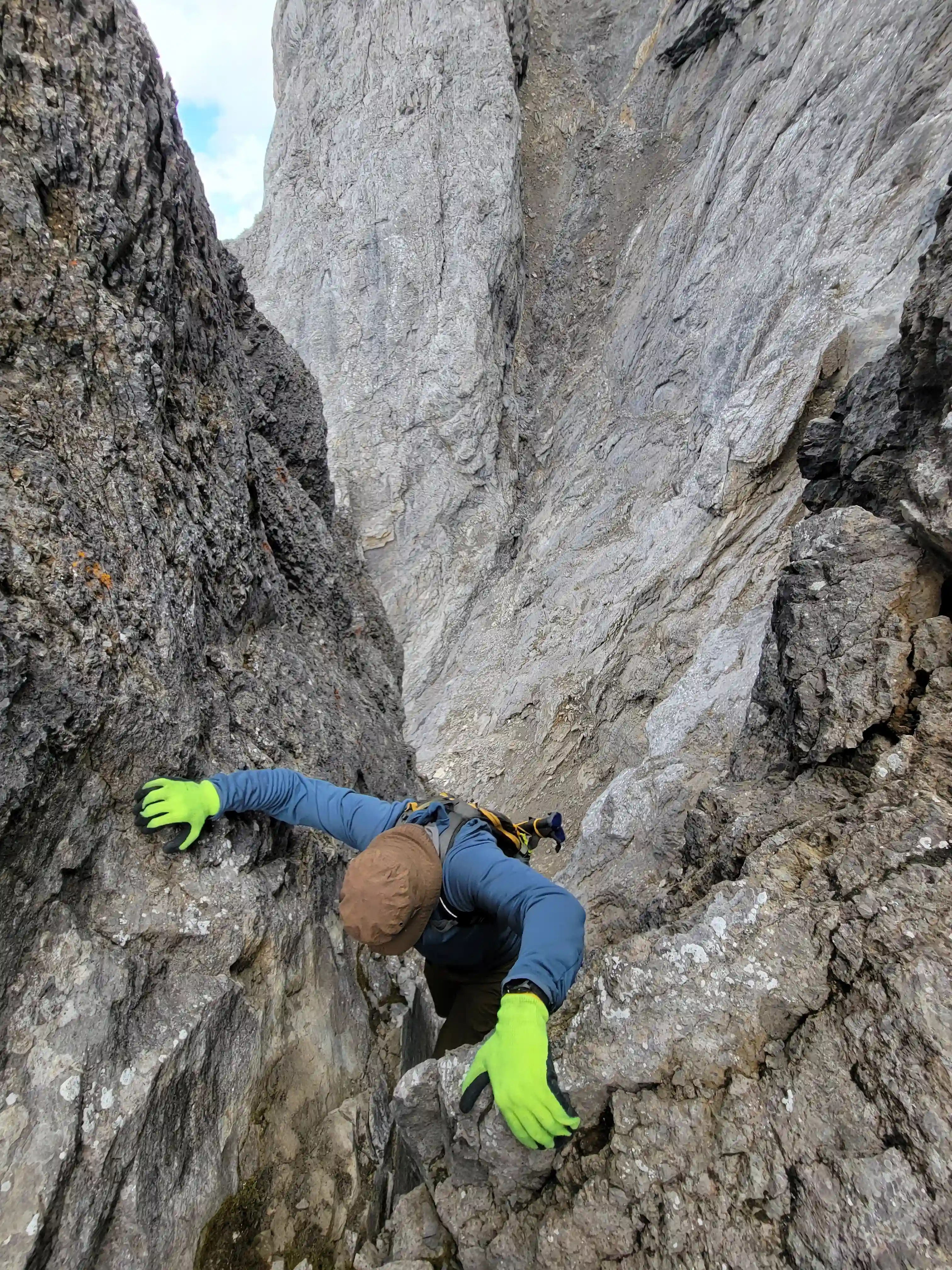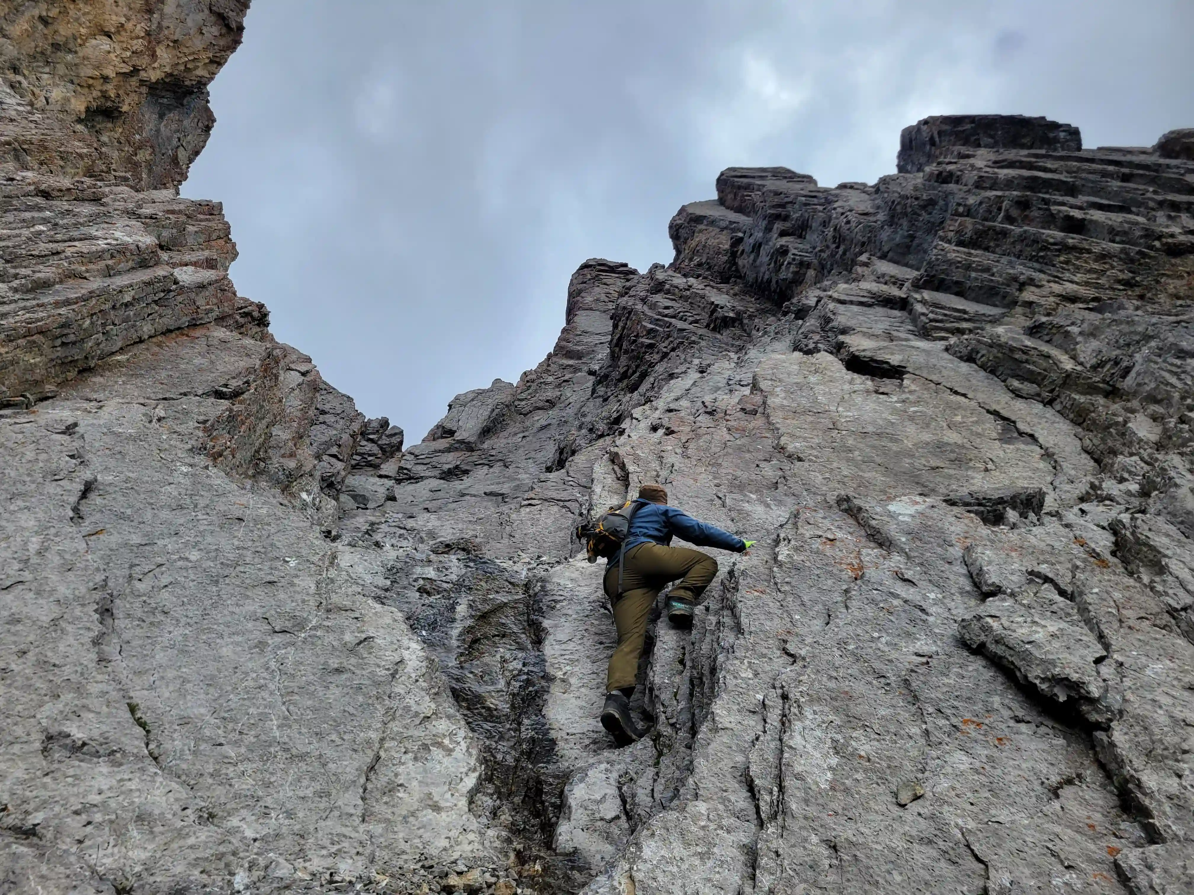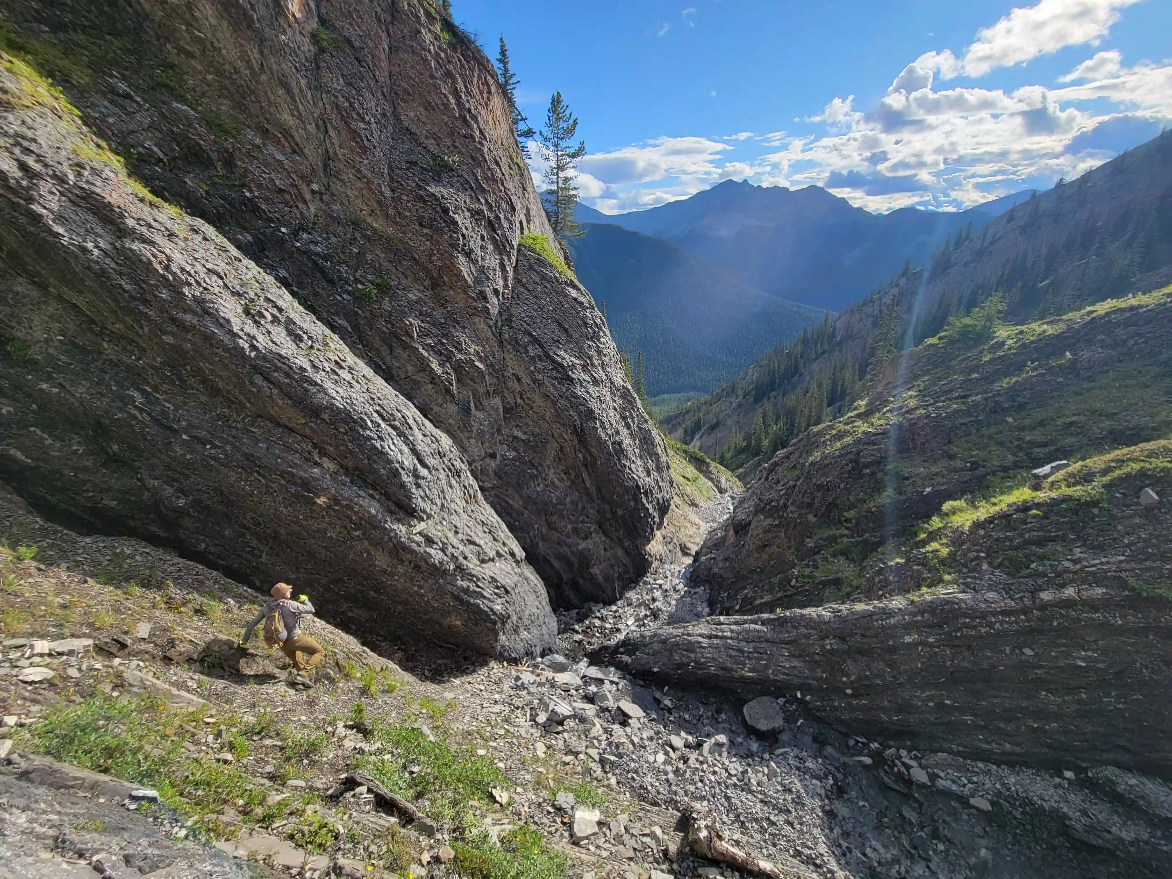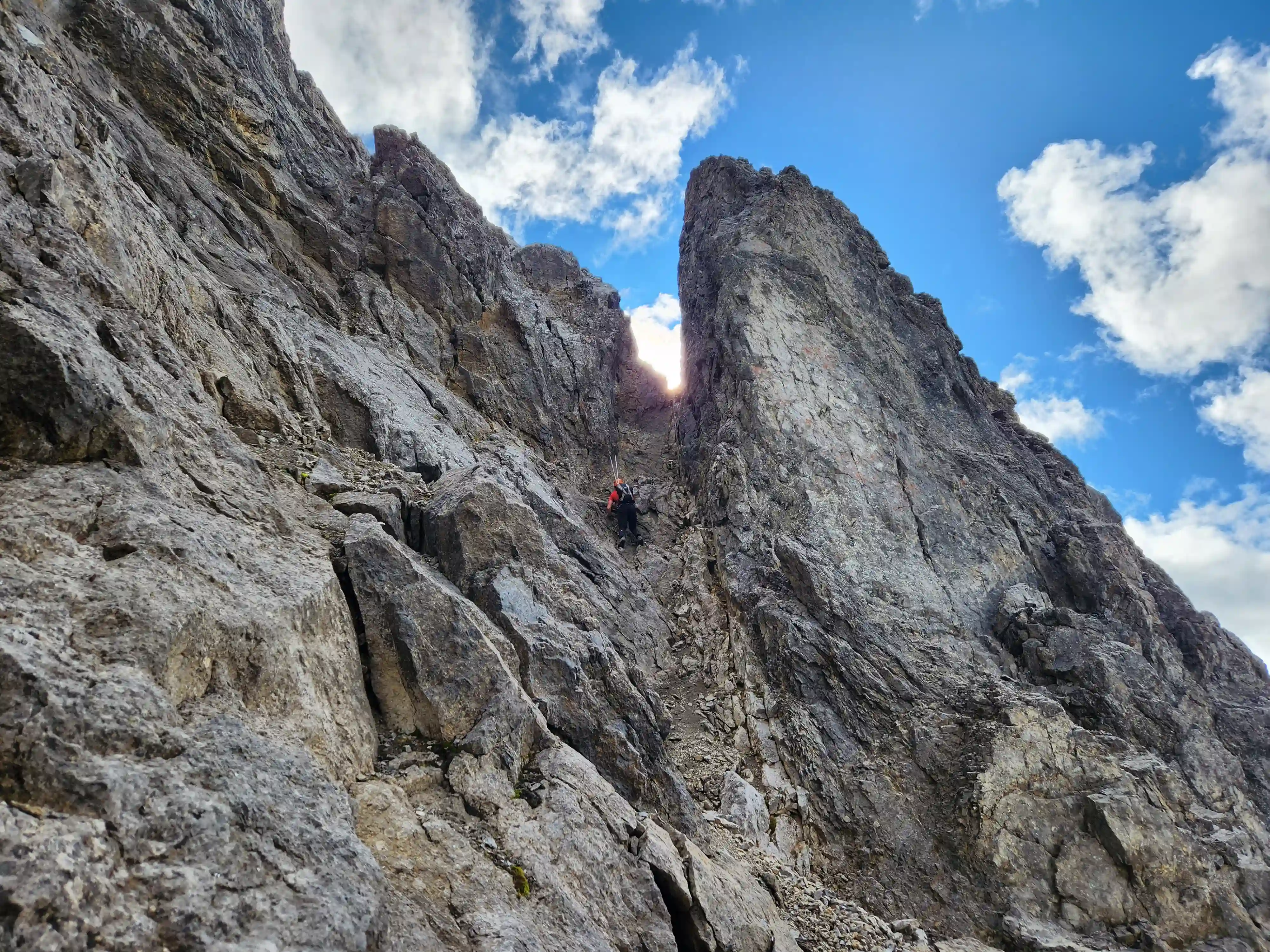 Once we got closer to the slabby face of Sundance a weakness looked like it could go although we weren't entirely sure if it would lead to a dead end but we didn't really have any other options so we decided to go for it. It started off as low 5th slabby moves until we reached a bit of a plateau where scree terrain resumed, then we followed it into a narrow gap between the mountain and a pinnacle and that's where things got interesting. The was another gap that lead to a low point between another pinnacle and the upper mountain with a chockstone in it but it looked decently technical and we weren't sure it would lead us anywhere. We did some looking around and once we were sure that we had no other options we decided to check it out as it was either that gap would go or we'd have to turn around and thankfully it ended up being the key to our route's success!