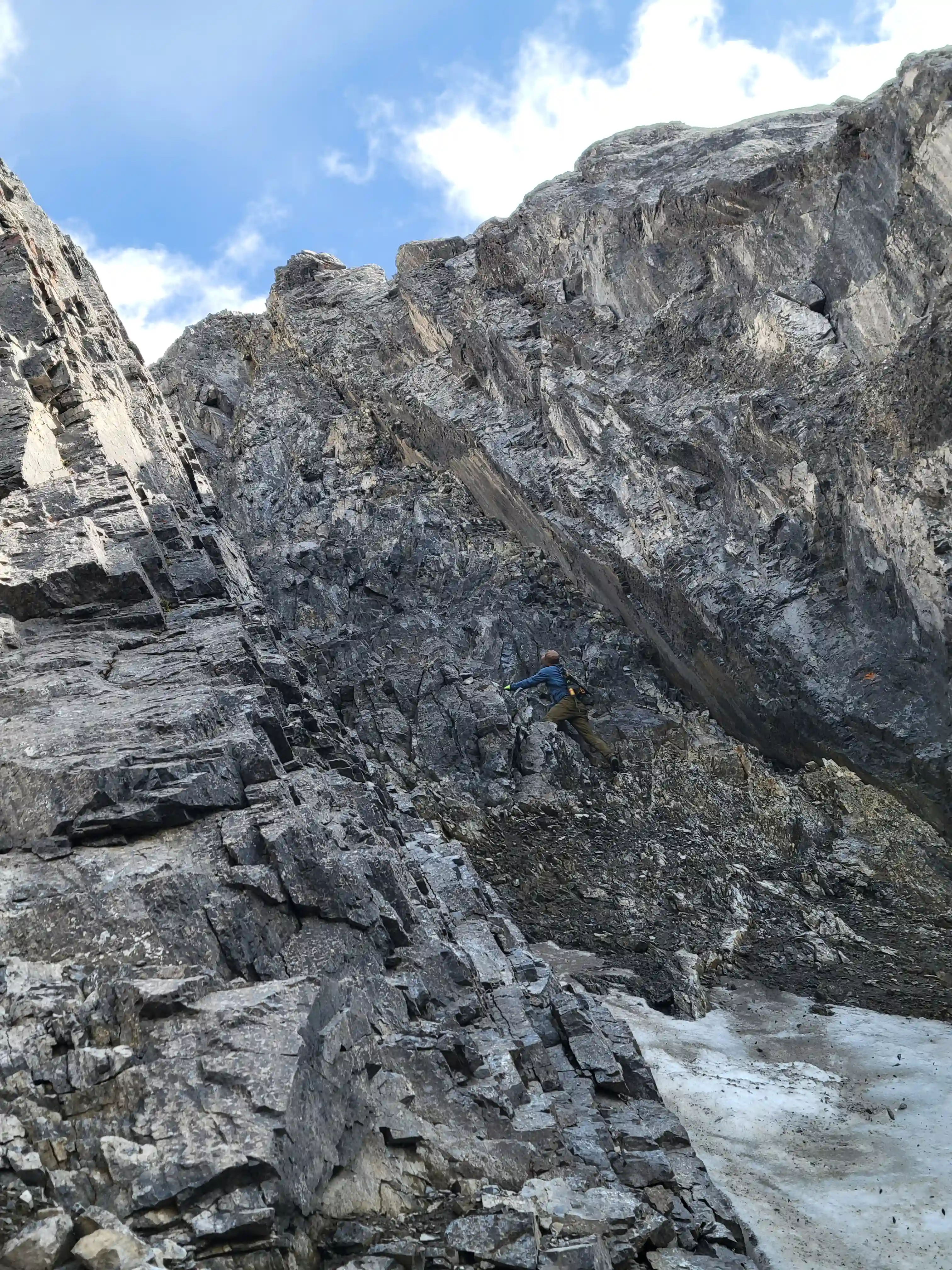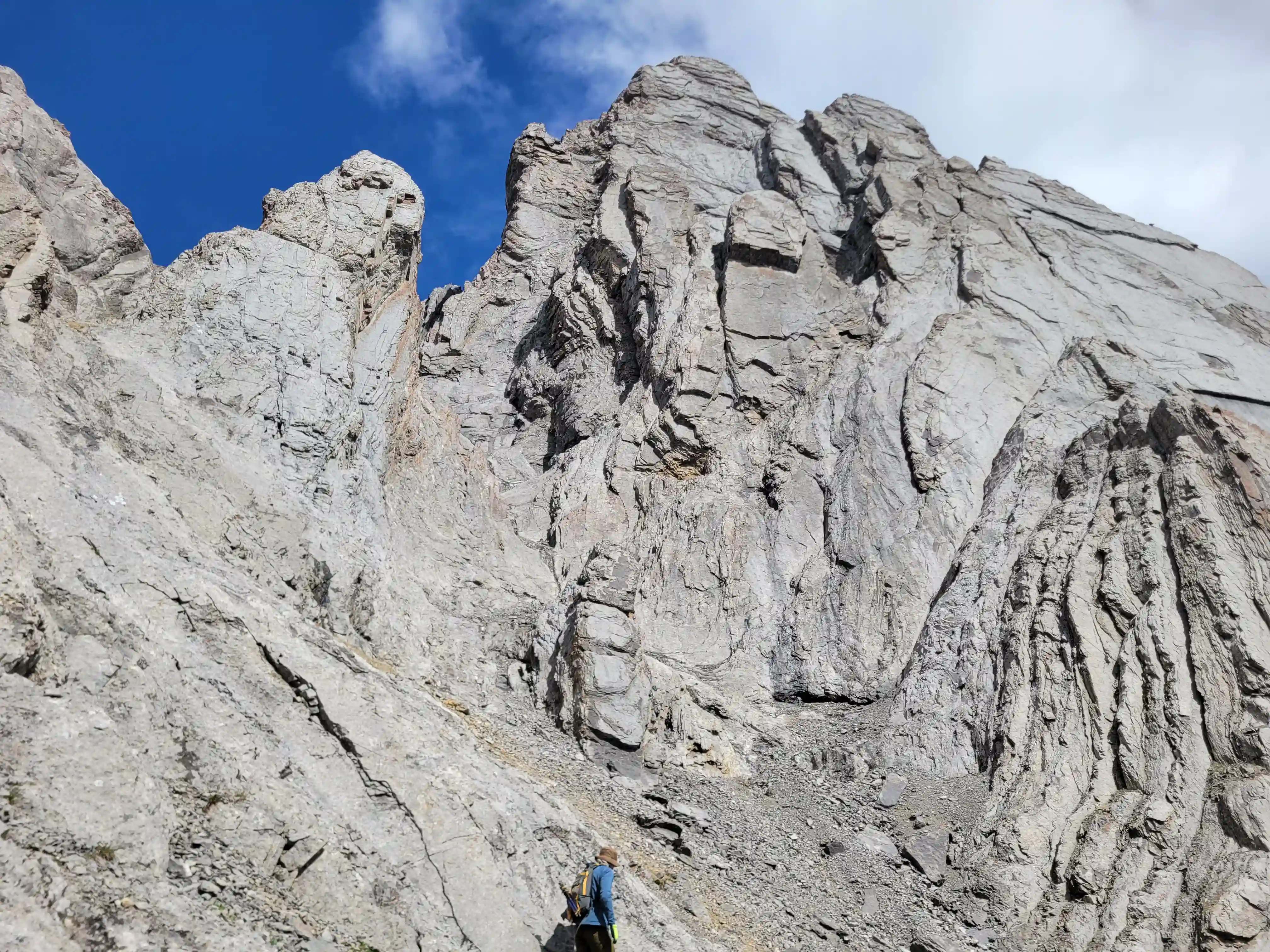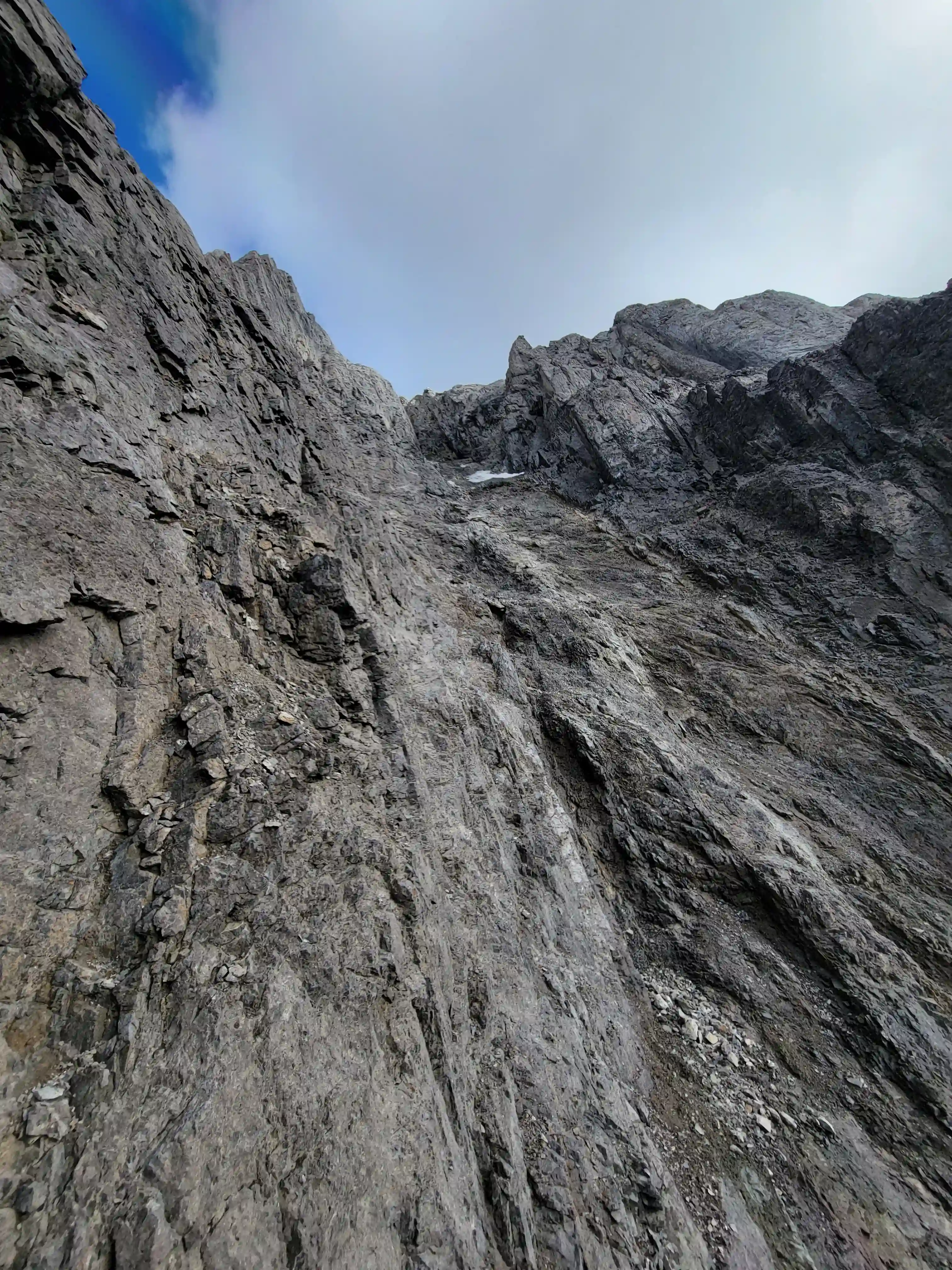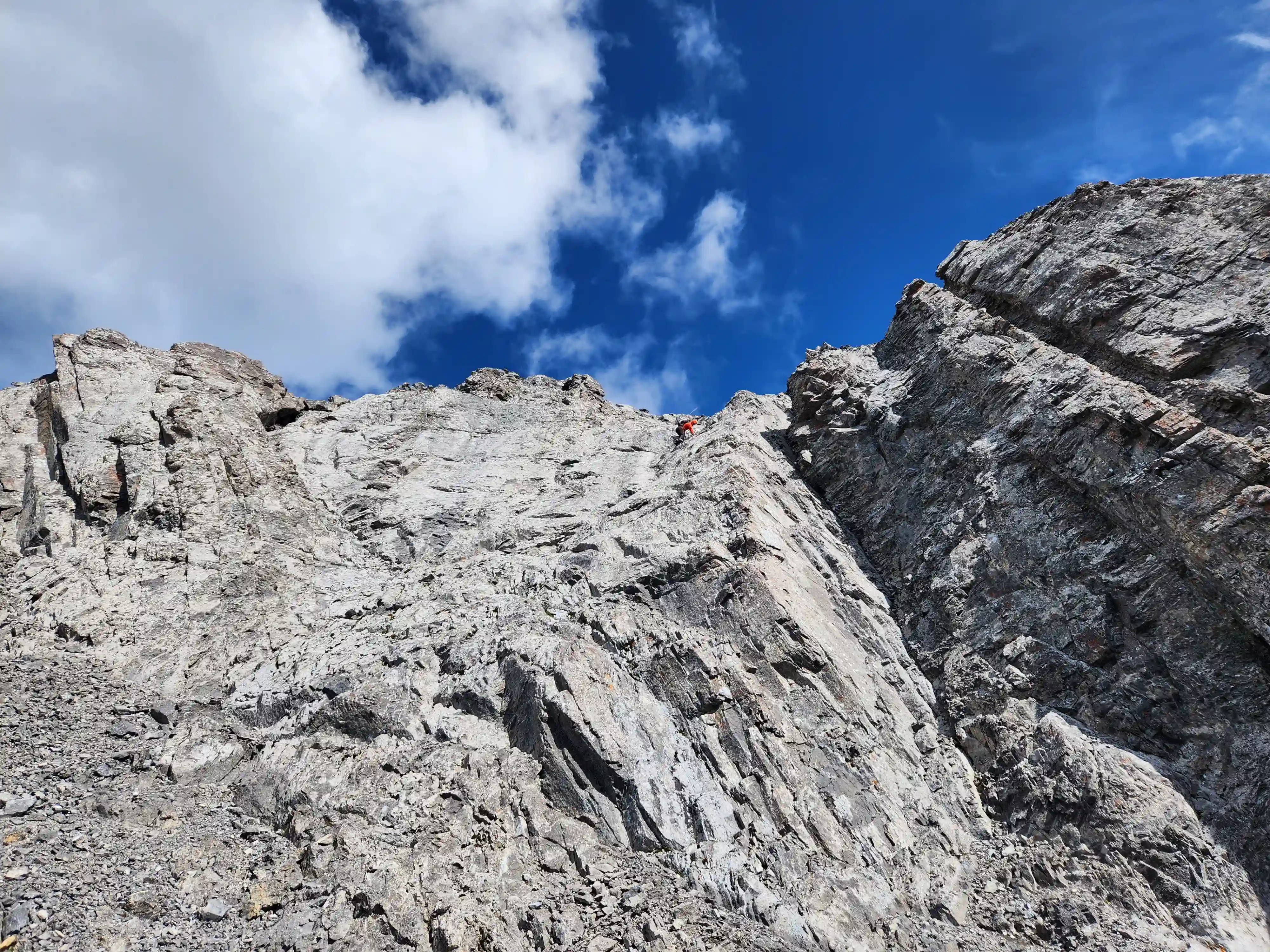 Once we got closer to the slabby face of Sundance a weakness looked like it could go although we weren't entirely sure if it would lead to a dead end but we didn't really have any other options so we decided to go for it. It started off as low 5th slabby moves until we reached a bit of a plateau where scree terrain resumed, then we followed it into a narrow gap between the mountain and a pinnacle and that's where things got interesting. The was another gap that lead to a low point between another pinnacle and the upper mountain with a chockstone in it but it looked decently technical and we weren't sure it would lead us anywhere. We did some looking around and once we were sure that we had no other options we decided to check it out as it was either that gap would go or we'd have to turn around and thankfully it ended up being the key to our route's success!