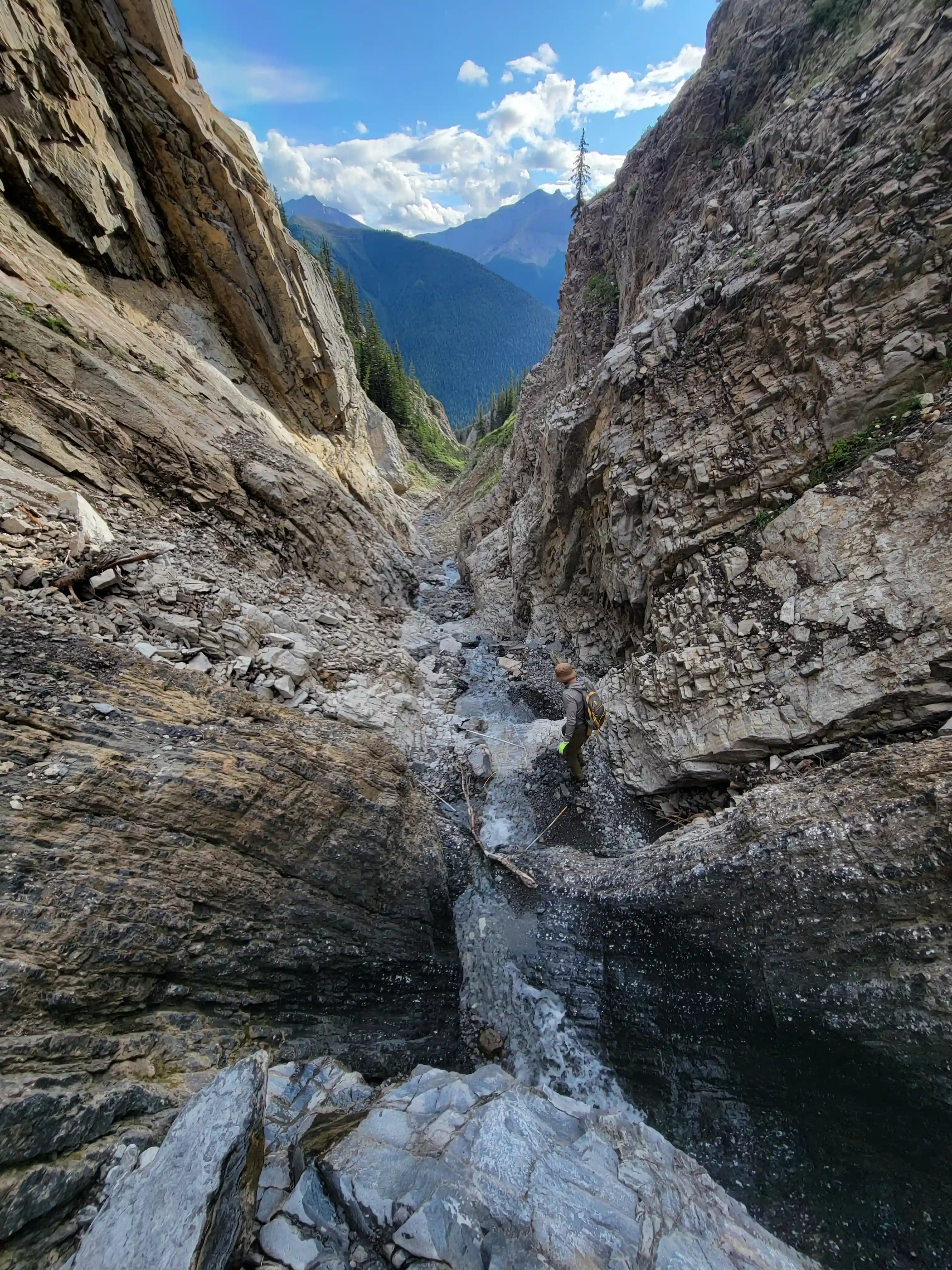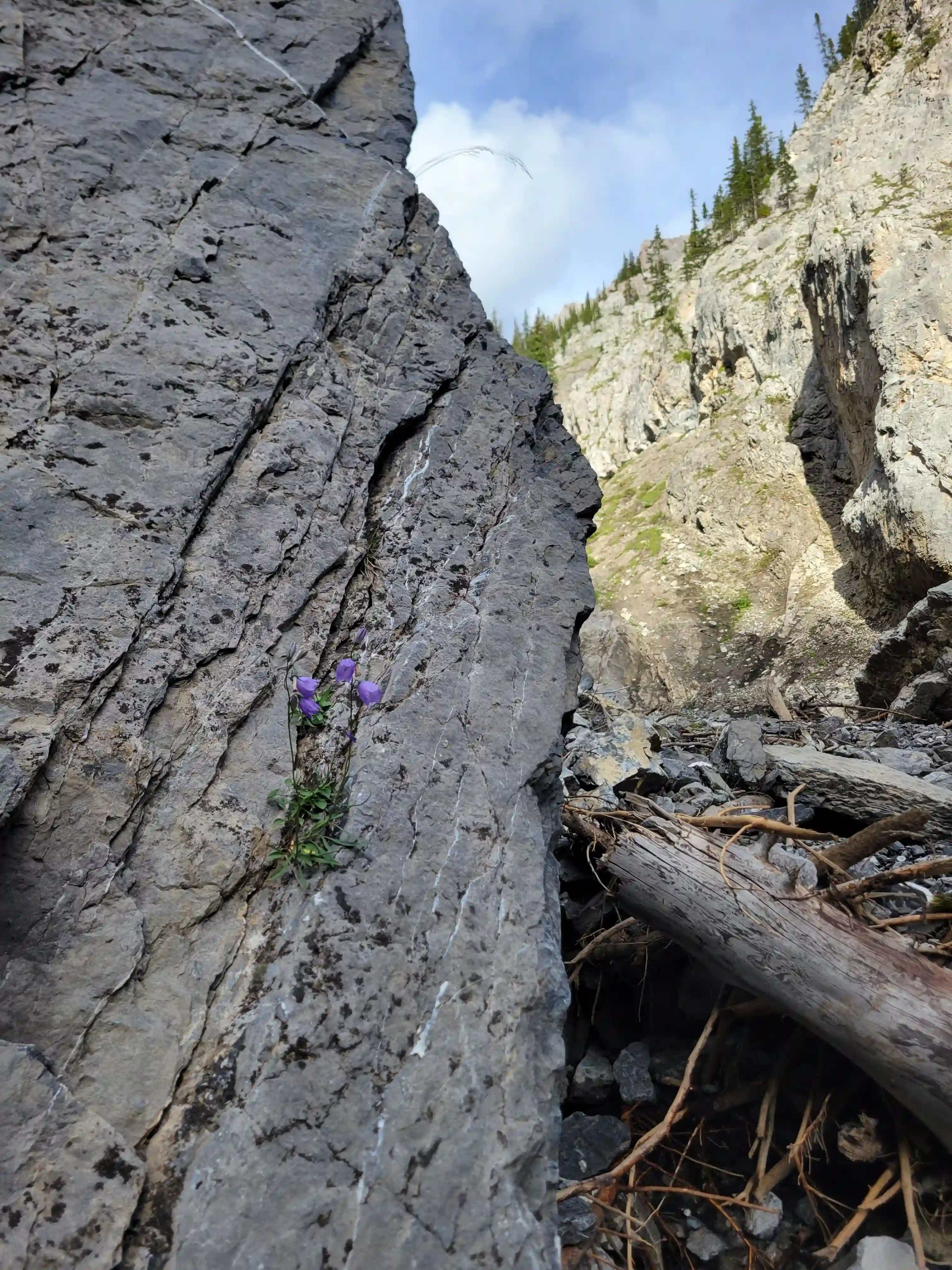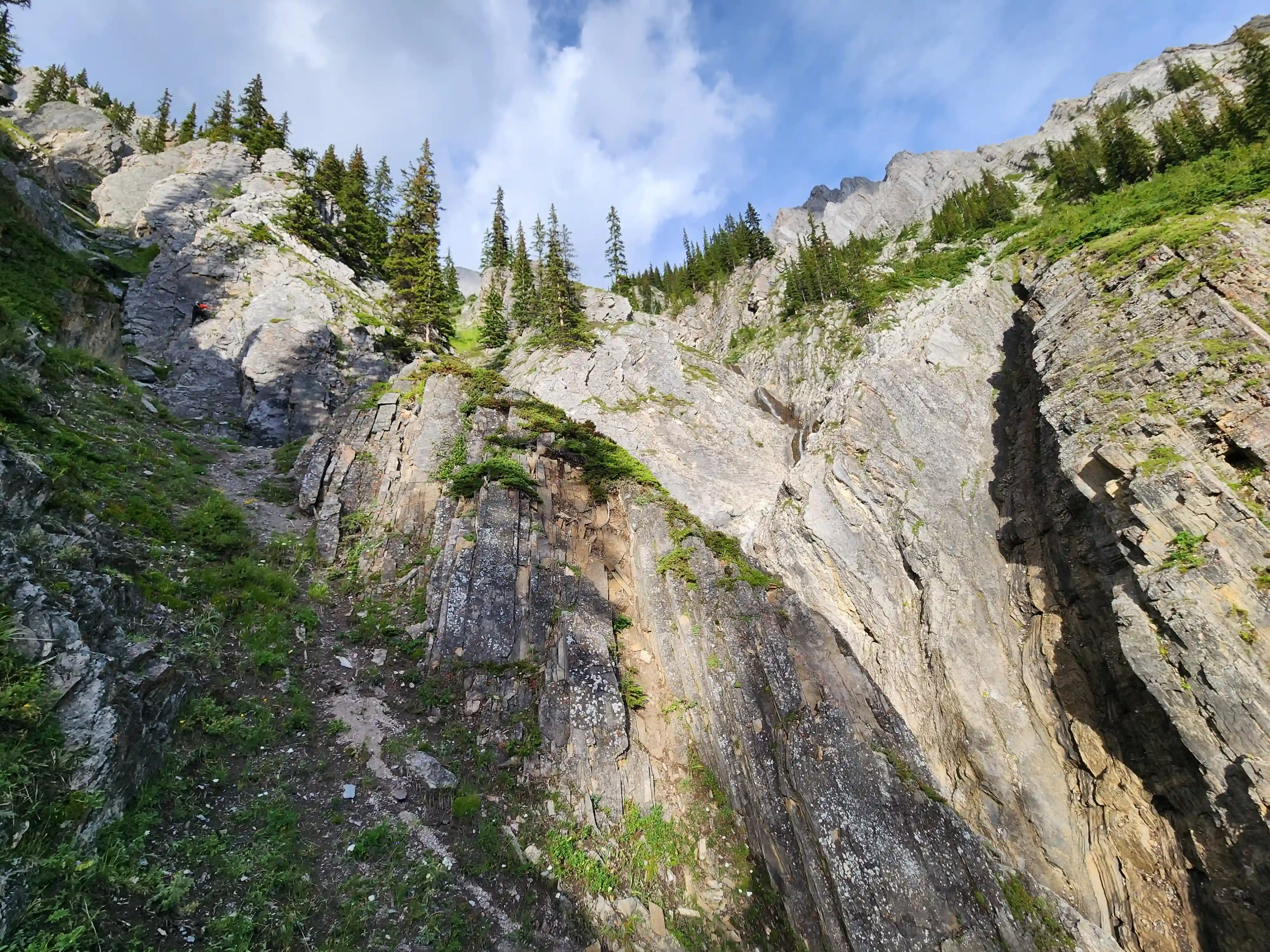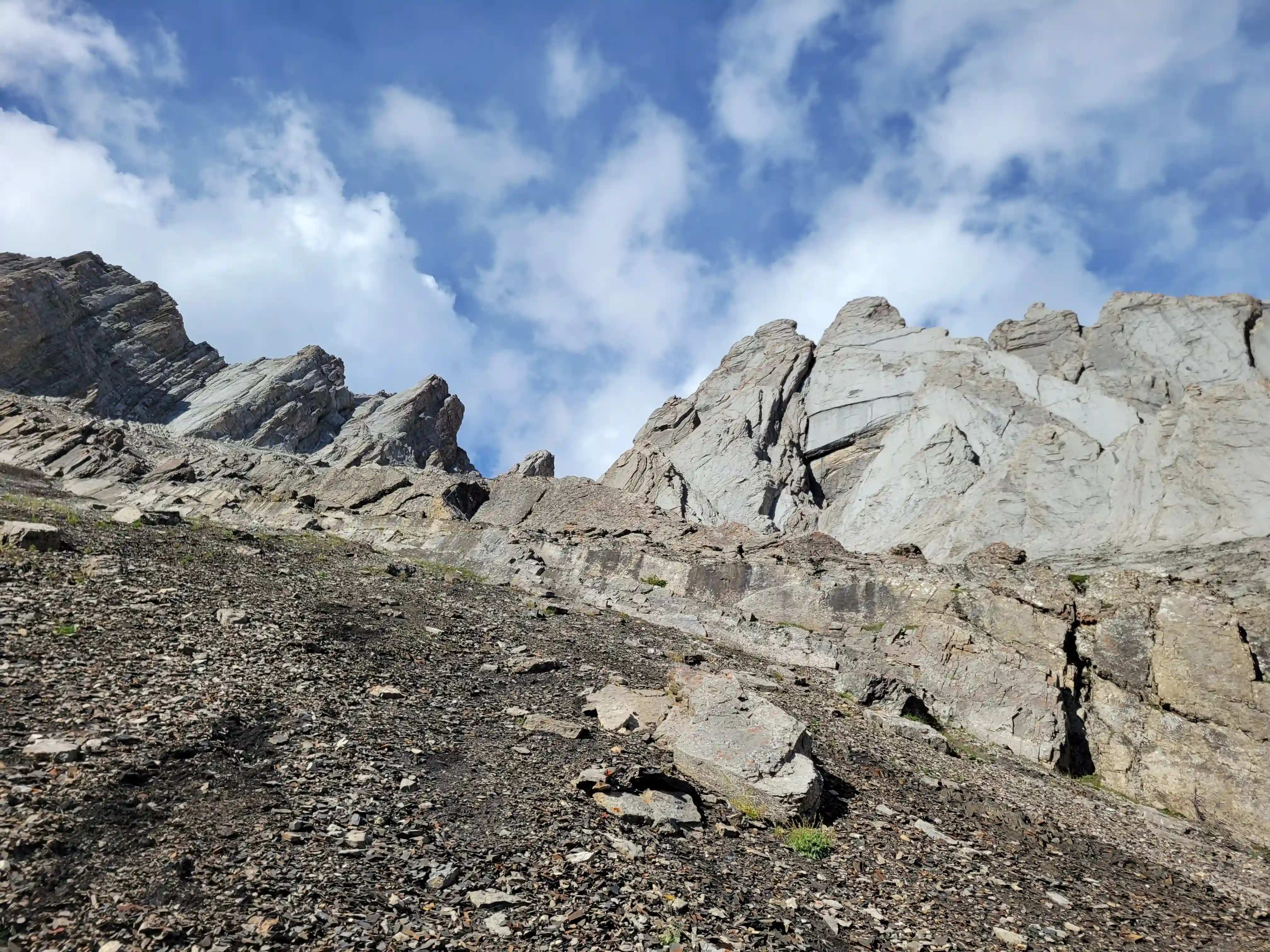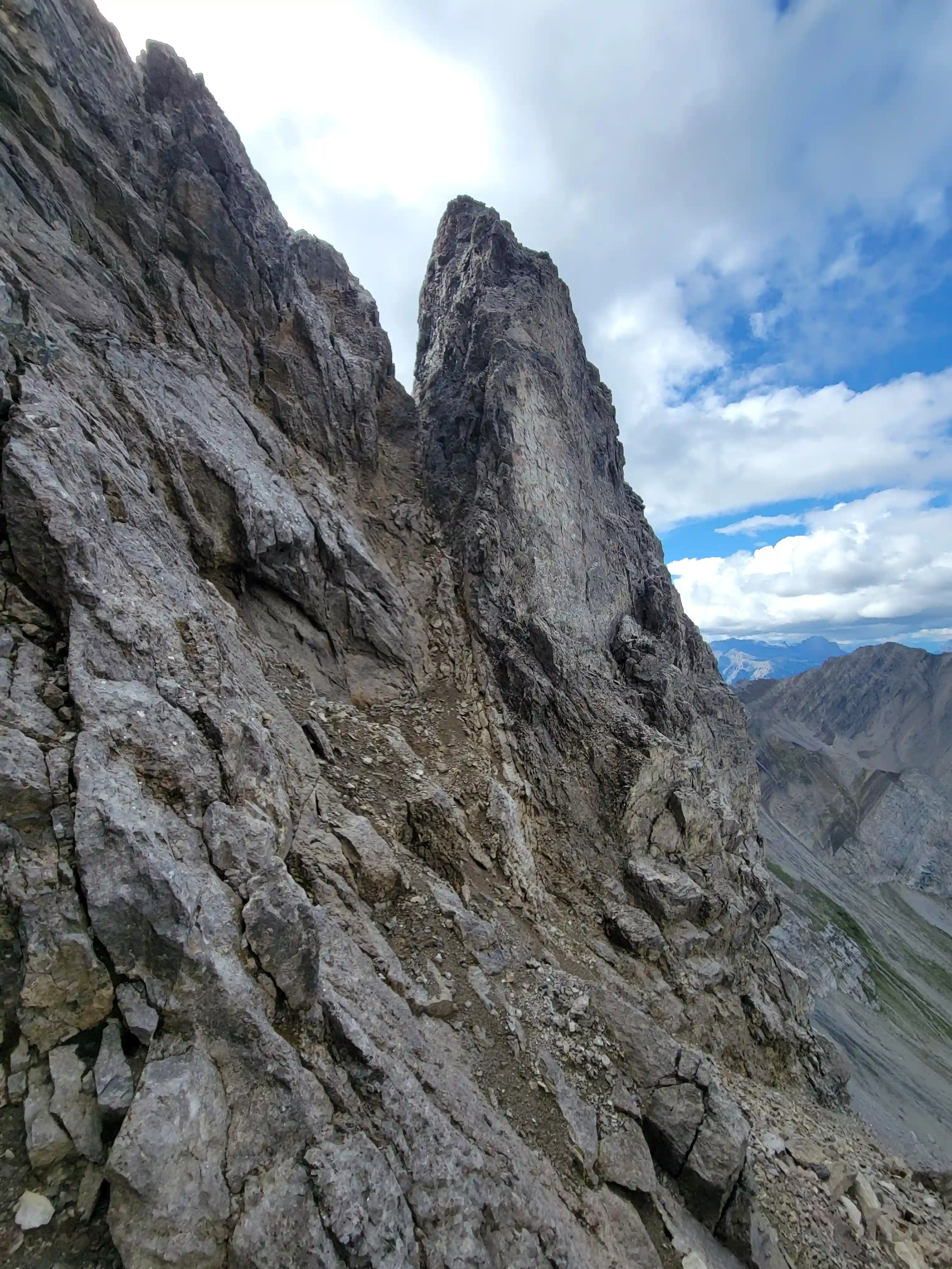 Once we got closer to the slabby face of Sundance a weakness looked like it could go although we weren't entirely sure if it would lead to a dead end but we didn't really have any other options so we decided to go for it. It started off as low 5th slabby moves until we reached a bit of a plateau where scree terrain resumed, then we followed it into a narrow gap between the mountain and a pinnacle and that's where things got interesting. The was another gap that lead to a low point between another pinnacle and the upper mountain with a chockstone in it but it looked decently technical and we weren't sure it would lead us anywhere. We did some looking around and once we were sure that we had no other options we decided to check it out as it was either that gap would go or we'd have to turn around and thankfully it ended up being the key to our route's success!