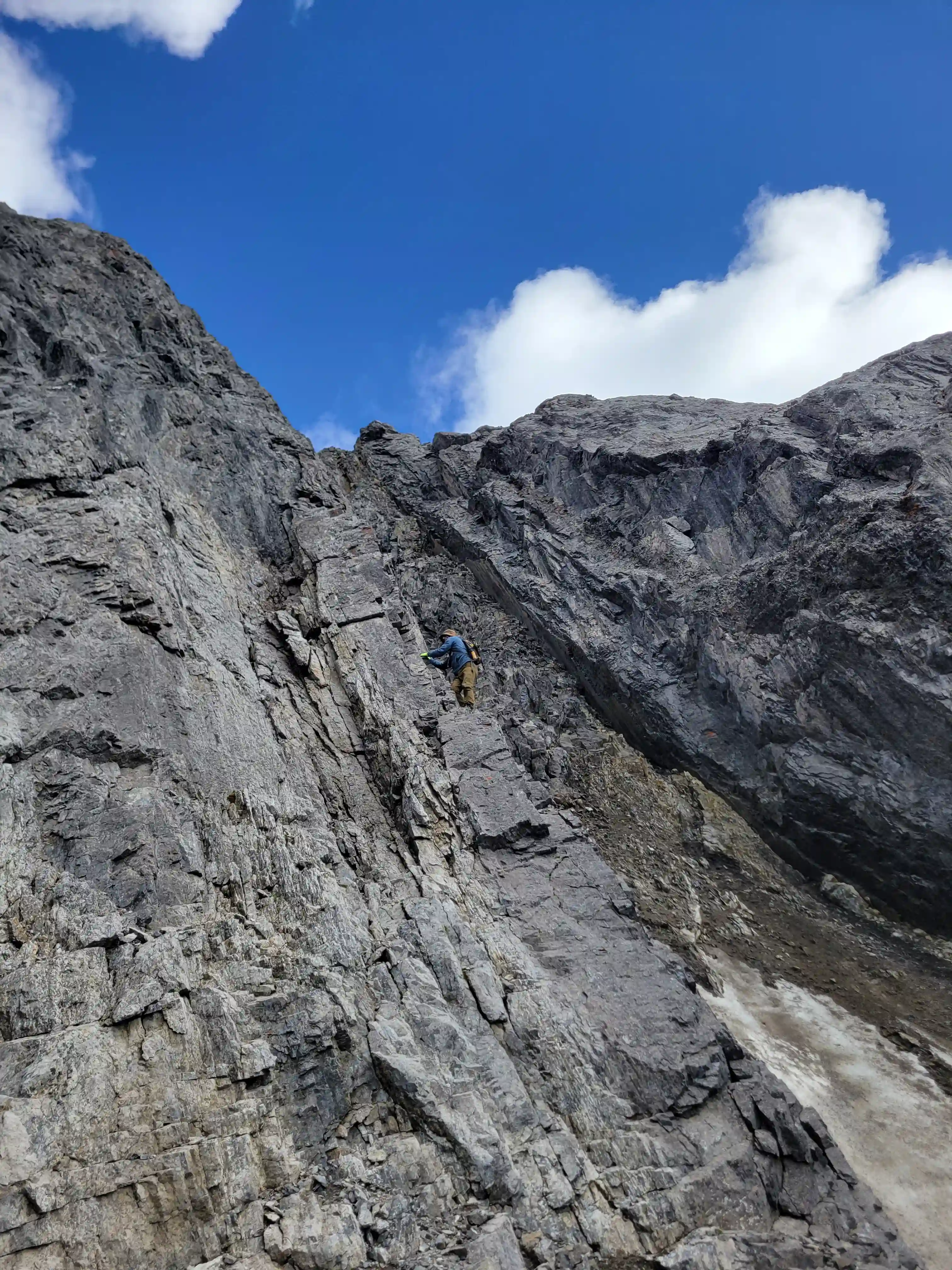 We were able to wedge ourselves nicely in the chockstone gap making it quite secure and once topped out we could see that the other side although a bit technical was downclimbable and lead to the gulley feature we had scoped out from afar. After downclimbing we started up the gully which was a particularly bad bowling alley for rockfall and ascending was pretty easy until we reached an upper section with some persistent snow, awfully lose rock, with some stiffer and steeper moves above it. Devan and I took turns through this section as to not launch rocks into each other and once we were through this difficulty which we both considered the crux of the day all that was left was some low 5th slabby terrain before a bit of scree to reach the summit!